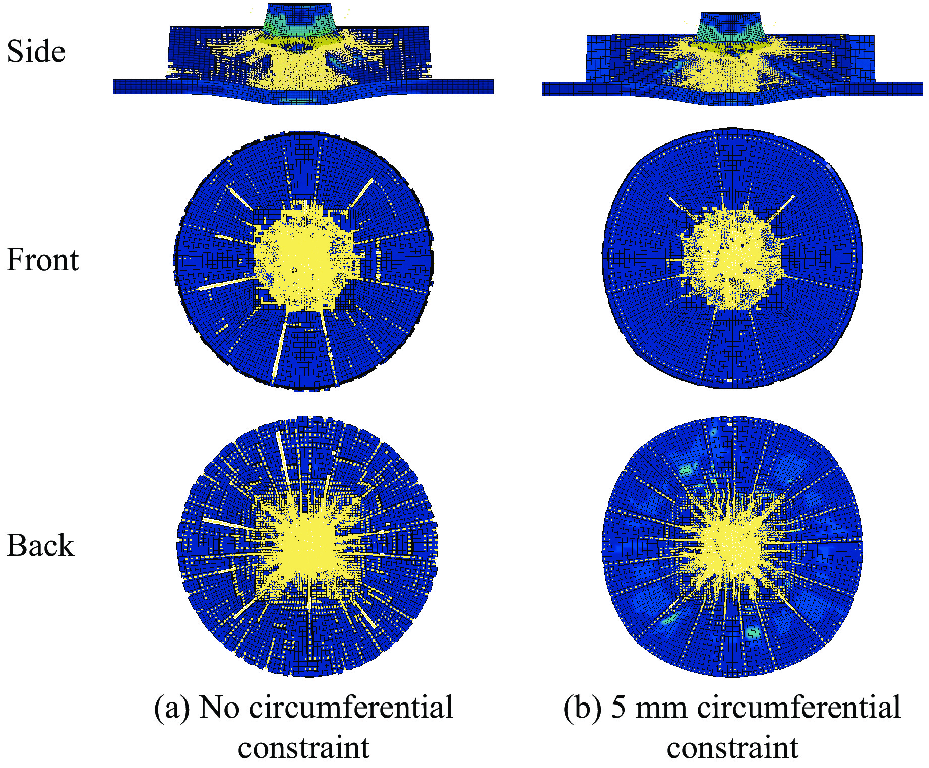 为探究混凝土的拉伸断裂特性和裂纹演化规律,开展了巴西圆盘的准静态劈裂试验和落锤冲击动态劈裂试验,结合有限元-黏聚单元耦合法(FCEM),对裂纹扩展过程及力学响应进行了数值模拟分析。试验结果表明:准静态加载时,混凝土圆盘试件发生拉伸断裂,圆盘中心形成一条沿加载方向贯穿的主裂纹和少量与其平行的次裂纹,裂纹主要在砂浆内部及骨料-砂浆界面扩展;三维圆盘试件的拉伸性能随厚径比的增大而增强。在动态冲击载荷作用下,试件仍为中心起裂模式,在圆盘中心形成一条沿加载方向的主裂纹,但其与试验装置接触的边缘会产生三角状的破碎区域。伴随落锤释放高度的增加,试件依次表现出未起裂、起裂未贯穿、起裂贯穿、严重破碎4种破坏形态。通过高速摄影获得了不同时刻的裂纹长度,结果表明,随着落锤释放高度的降低,裂纹扩展时间延长。数值模拟结果显示,试件的起裂时间随落锤释放高度的增加呈非线性递减,并给出了起裂时间与落锤释放高度关系的经验公式。