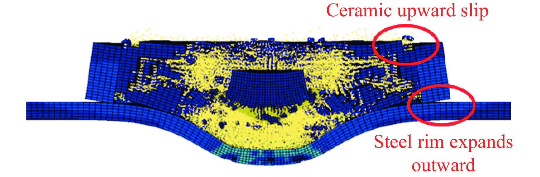 为提高国内现役38 mm防暴枪用非致命动能弹的安全性,采用有限元-离散元法,对填充铅砂的38 mm球形动能弹丸冲击人体仿生靶标过程进行了数值模拟,利用刚性壁实验进行了建模方法和参数选取的间接验证,获得了弹丸冲击仿生靶标过程的形变过程、动能、速度、位移、能量传递率等变化数据。在此基础上,对不同弹体速度和壁厚进行了对比分析,提出了安全射击建议。结果表明:弹丸冲击仿生靶标时产生较大形变,弹丸形变至圆饼状,靶标产生圆形凹陷,两者形变均可在一定程度恢复;弹丸致伤威力随着速度的增加而增加,随着壁厚的增加而减小;当弹丸壁厚为5、7、9 mm时不造成腹部皮肤穿透损伤的最小射击安全距离分别122.40、64.62、31.26 m。