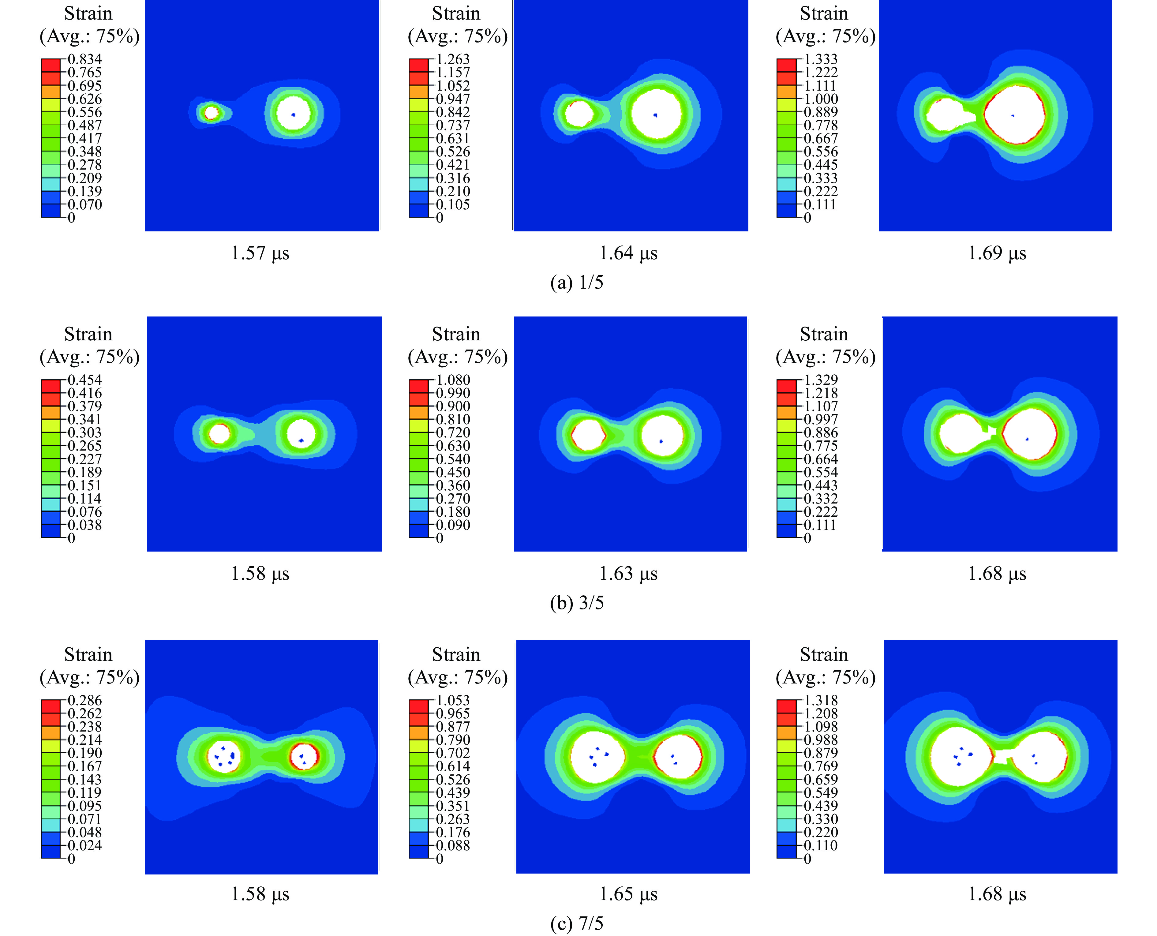 针对传统周边爆破易诱发随机裂纹损伤围岩的问题,结合弹性力学理论与基于ANSYS/LS-DYNA的数值模拟,深入研究了空孔定向爆破的损伤演化与动力响应特性。首先,基于弹性力学理论,阐释了控制定向裂纹扩展的力学机制,揭示了在爆炸荷载作用下空孔通过应力波反射产生拉应力集中的机理;接着,通过建立平面双孔不耦合装药数值模型,系统研究了炮孔间距和地应力场对损伤演化的影响;最后,分析了空孔附近峰值应力和质点峰值振速的动态变化规律。结果表明:空孔显著改变爆炸能量分布,将其引导至集中于炮孔连线方向,有效抑制了非预期裂纹的萌生与扩展;空孔定向效果受地应力调控,高地应力削弱空孔水平方向的拉应力集中,抑制炮孔间裂纹扩展,因此,炮孔布置宜平行于岩体最大主应力方向,以最大化定向效果并减弱地应力抑制;炮孔间距为11~14倍炮孔直径时,可促进主裂纹稳定定向扩展,抑制非预期裂纹发育,显著改善围岩损伤控制效果。高地应力工况下,需将孔距参考值缩小至8~11倍炮孔直径。
