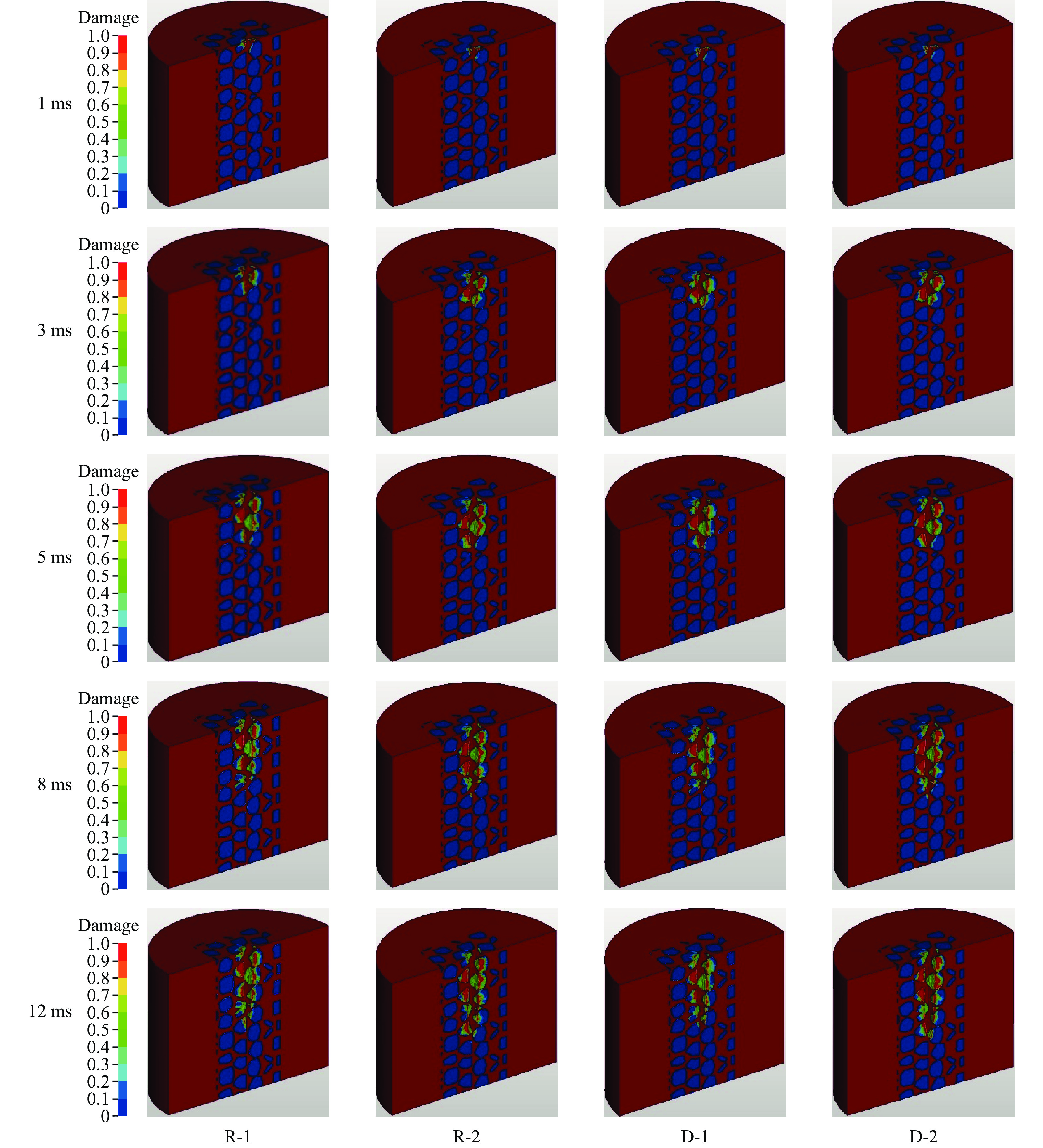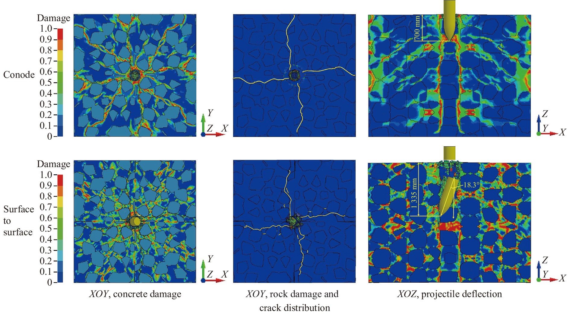 遮弹层作为现代军事防御体系的关键组成部分,可为后方重要目标提供防护。块石作为遮弹层的常用堆筑材料,其遮弹机理及性能优化研究具有重要意义。采用离散元球体单元和黏结破碎模型,模拟了块石在弹体冲击载荷下的破碎现象,并对刚性弹正侵彻密实堆积的块石结构进行了数值模拟,探讨了块石粒径、形状及空间排布特性对其抗侵彻性能的影响。结果表明:在侵彻过程中,块石通过碰撞和滑移耗散了90%以上的弹体动能;块石破碎数量与块石粒径呈负相关,与块石长短轴比呈正相关;采用单粒径块石多层位错排布时,弹体侵彻深度主要取决于侵彻阻力峰值,粒径为120 mm的圆形块石工况的侵彻阻力最大且侵彻深度最小;采用块石粒径沿迎弹面方向梯度递减的分层排布时,不能有效提高结构体的遮弹效果。研究结果可为理解块石遮弹机理提供参考。