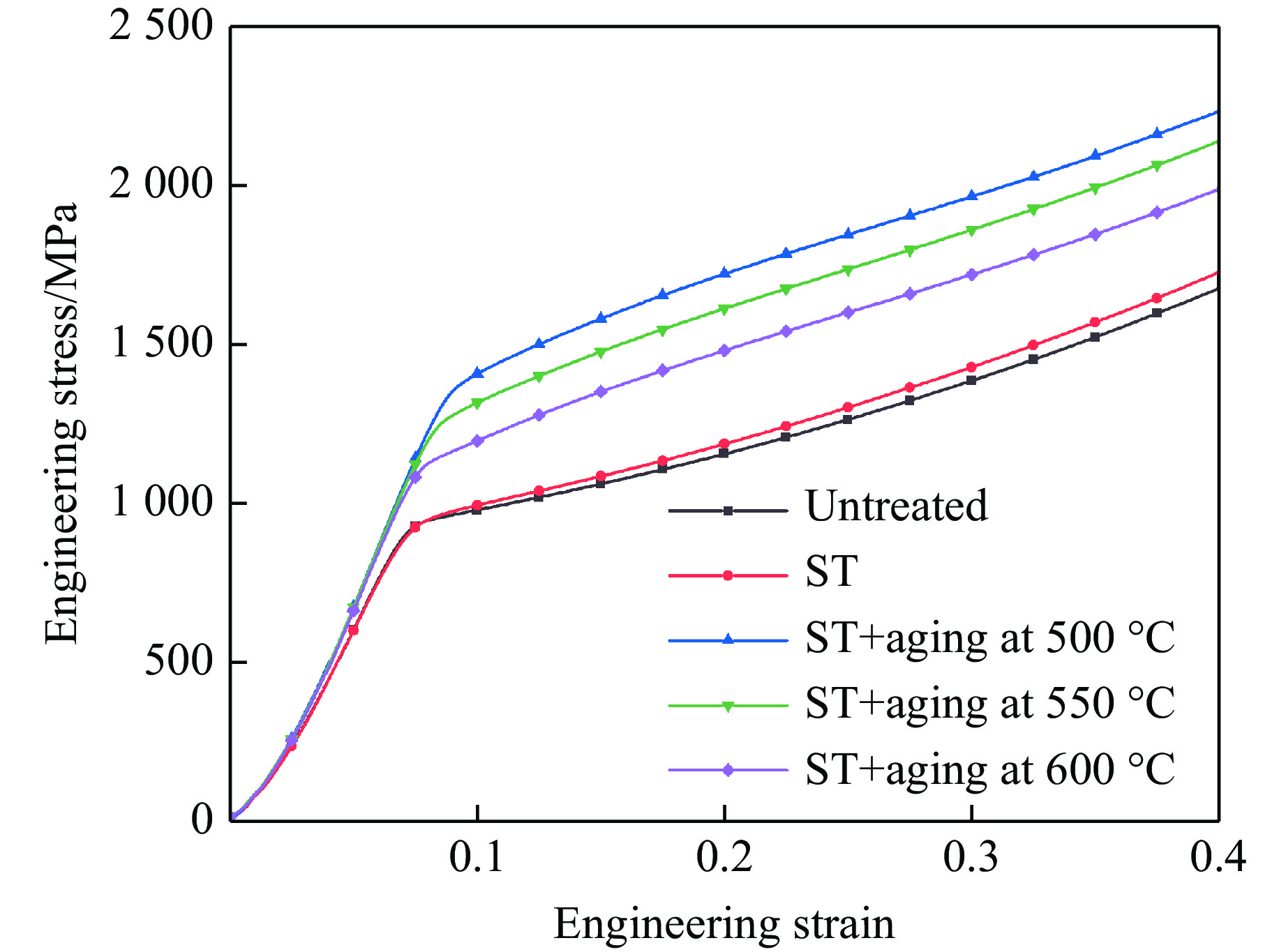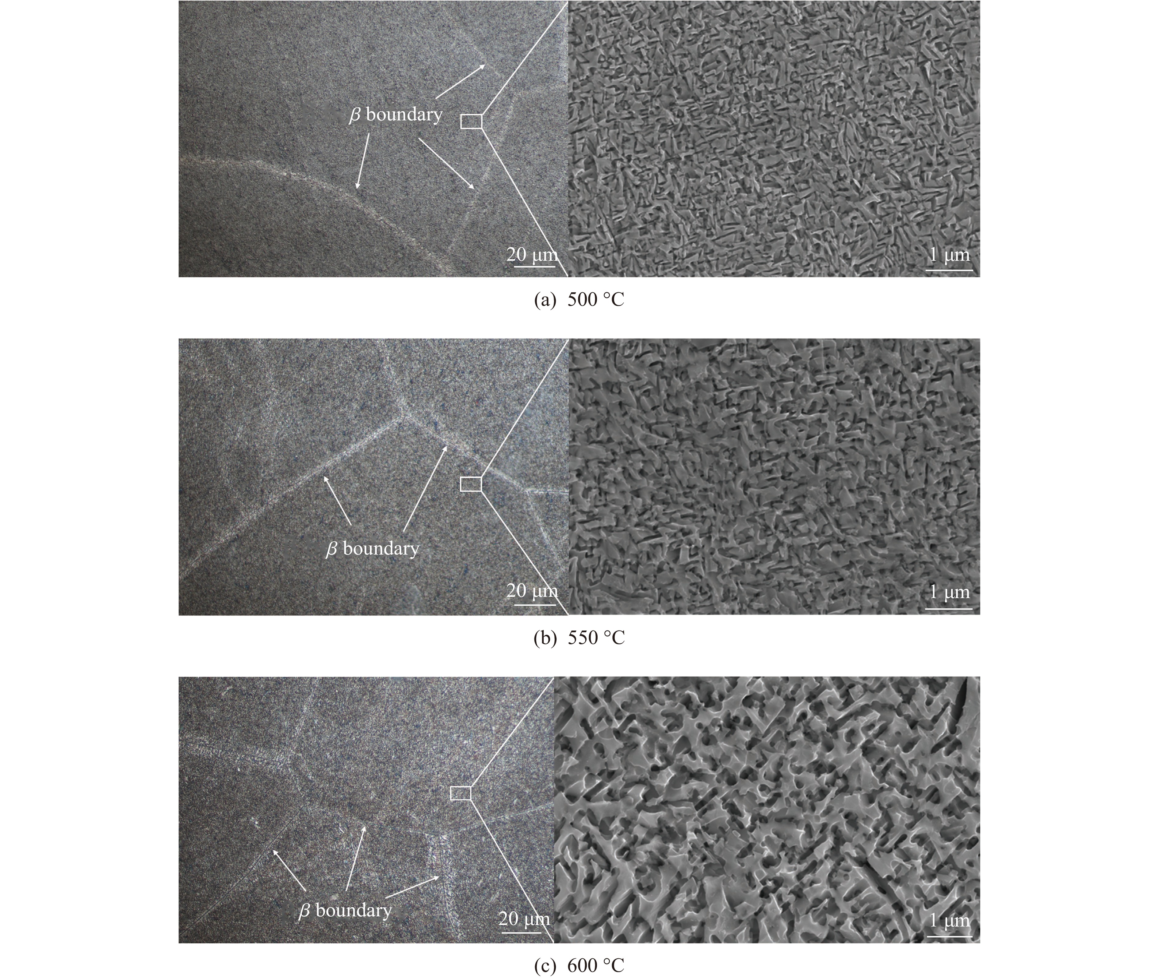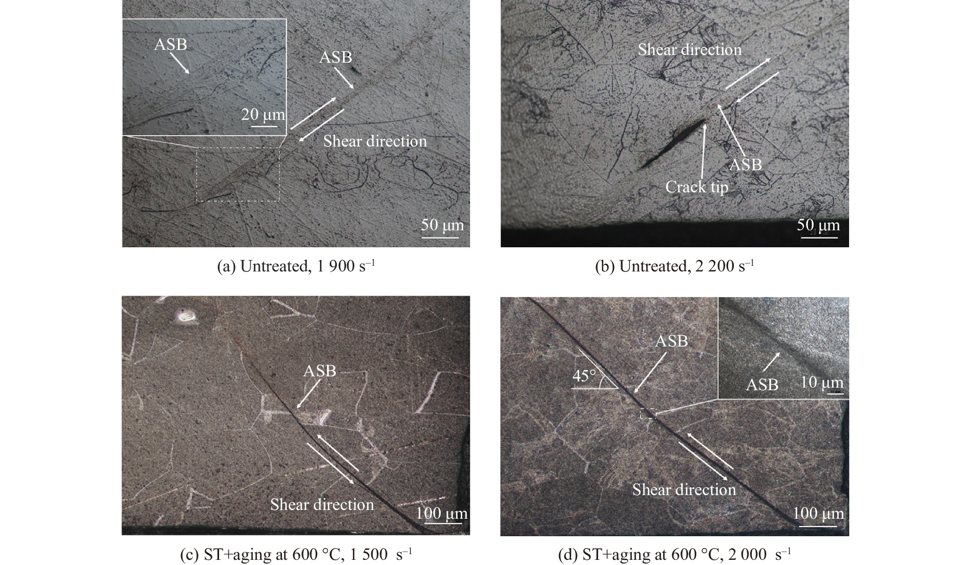 TB8(Ti-15Mo-2.7Nb-3Al-0.2Si)是一种亚稳态β型钛合金,在航空航天领域发挥着重要的作用。微观组织结构、应变和应变率是影响材料力学性能的3大重要因素,基于万能材料试验机和分离式霍普金森压杆(SHPB)测试手段,研究了固溶和时效热处理工艺对TB8钛合金力学性能的影响,并通过光学显微镜和扫描电子显微镜表征材料变形前后的微观组织结构及其断面形貌。结果表明:经过固溶+时效处理后,合金内部析出短条状α相,且时效温度越高,次生相尺寸越大,数量越少;在不同应变率加载条件下,热处理前后的TB8钛合金均表现出明显的应变率强化效应,动态加载条件下应变强化作用不明显;时效温度升高时,高应变率下合金屈服强度降低,塑性升高;动态加载条件下试样的破坏形式为典型的剪切破坏;绝热剪切带是裂纹形成和试样破坏的前兆。