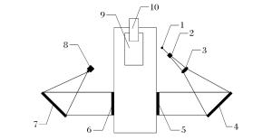 图  激光光源阴影光路(1.激光; 2.匀化器; 3.扩束镜; 4.凹球反射镜Ⅰ; 5, 6.观察窗; 7.凹球反射镜Ⅱ; 8.高速CCD相机; 9.弹托捕捉器; 10.发射管)
