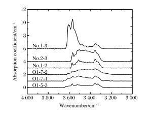 图 4 Ol-5-3橄榄石晶体中平行[100]轴的非偏振红外光谱(900 ℃、1.5 GPa、5 h、NNO;主要的羟基峰位于3 610、3 599、3 572、3 568、3 502、3 444、3 417、3 356和3 329 cm-1;所有光谱都进行了归一化处理)