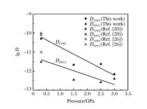 Sample Pressure/GPa Temperature/℃ lg fO2 Duration/h C0/10-5 D[100]/(10-12 m2·s-1) D[001]/(10-12 m2·s-1) Ol-5-3 1.5 900 -12.0 5 2.7 2.15 0.35 Ol-7-1 2.5 900 -12.0 5 6.0 2.35 0.26 Ol-7-2 3.0 900 -12.0 5 7.1 0.70 0.40 No.1-2 2.5 900 -16.7 5 10.3 0.31 0.16 No.2-3 2.5 1 050 -14.1 2/3 13.1 ND 3.50 No.1-3 2.5 1 200 -11.9 1/3 12.5 8.50 6.75 Note: (1) lg fO2 was calculated using O'Neill's equation[23] for NNO and O'Neill and Pownceby's equation[24] for IW;