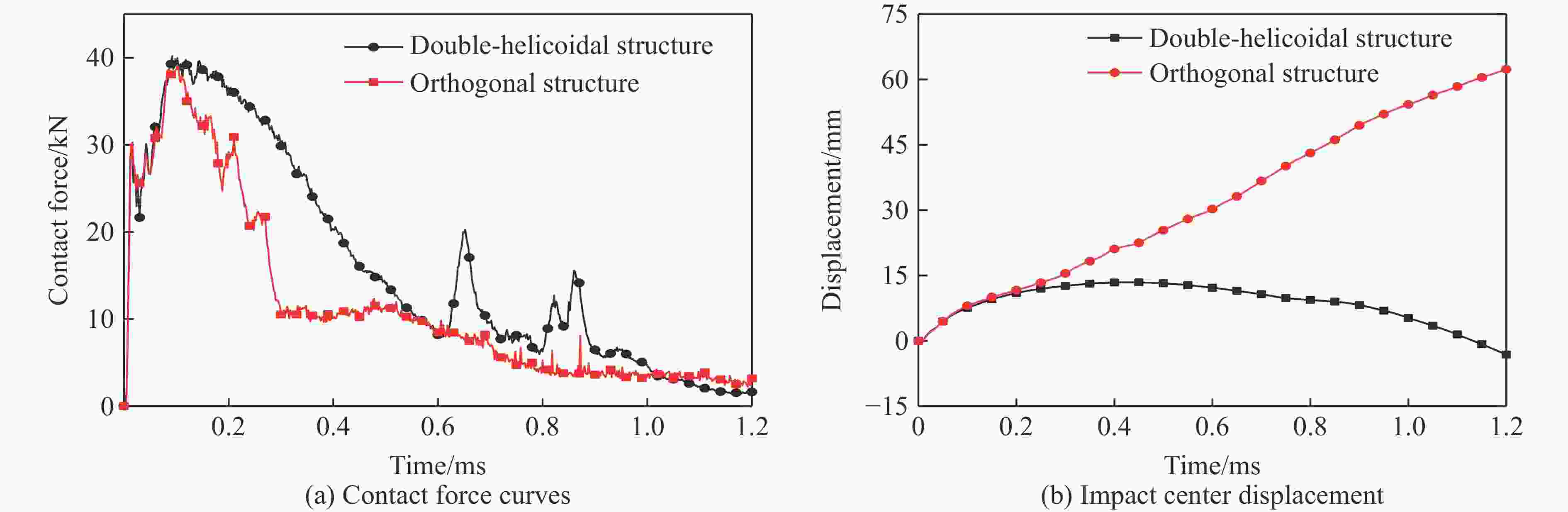 摘要: 为了提高纤维复合材料构件抗冰雹载荷性能,基于腔棘鱼鳞独特的双螺旋结构,建立了以碳纤维增强复合材料为基体的腔棘鱼鳞双螺旋仿生结构数值模型,并验证了该仿生结构模型的有效性。对比分析了双螺旋仿生结构和正交层合结构的毁伤特性,进而探究了冰雹撞击能量及分布密度对该双螺旋仿生结构动态响应的影响。结果表明,双螺旋仿生结构在冰雹作用下的毁伤程度低于相同密度条件下的正交层合结构。当撞击能量达到1149.3 J时,正交层合结构出现了明显的基体破碎及纤维断裂,而双螺旋仿生结构仅表现为撞击区域的浅表分层并伴随少量纤维断裂。双螺旋仿生结构在冰雹撞击下的力学响应可分为3个阶段。随着撞击能量的增加,撞击区域首先发生基体拉伸,撞击点临近区域发生分层及面外凸起;进而分层区域向四周扩展,在冰雹的持续加载下撞击位置的位移达最大值;此后,仿生结构出现回弹直至稳定。该双螺旋仿生结构的能量吸收比率及接触力均随撞击能量的增加而线性增大。在相同质量冰雹的作用下,随着冰雹分布密度的增加,双螺旋仿生结构的上表面损伤程度减小,下表面损伤区域增大。研究结果为基于碳纤维增强复合材料的腔棘鱼鳞仿生结构在冰雹载荷下的轻量化设计奠定了基础。Abstract: In order to improve the impact resistance of fiber composite components under hail load, inspired by the unique double-helicoidal structure of coelacanth scales, a numerical model of the double-helicoidal bionic structure made of carbon fiber reinforced composite was established, and the effectiveness of the bionic structure model was verified. The damage characteristics of the bionic-structure and the orthogonal lamination structure under hail load were compared and analyzed, and the influences of the hail impact energy and the hail distribution on the dynamic response of the double-helicoidal bionic structure were studied. The results show that the damage degree of the double-helicoidal bionic structure under the action of hail is better than the orthogonal laminated structure of the same density. When the impact energy reaches 1149.3 J, the orthogonal laminated structure shows an obvious matrix fracture and a fiber breakage, while the double-helicoidal bionic structure only shows a superficial delamination in the impact area with a small fiber fracture. The mechanical response of the bionic structure under hail impact can be divided into three stages. As the impact energy increases, the impact area firstly shows a matrix stretching, and the area near the impact point is delaminated and bulged out-of-plane; then the delamination area expands to the surrounding area, and the displacement of the impact position reaches the maximum under the continuous load of hail; since then, the bionic structure rebounds until it is stable. Both the energy absorption ratio and the contact force of the double-helicoidal bionic structure increase linearly with the increase of the impact energy. Under the same mass hail load, the damage degree of the upper surface gradually decreases with the increase of hail distribution density, and the damage area on the lower surface gradually increases for the bionic structure. The research results lay a foundation for the lightweight design of the coelacanth scales-inspired bionic structure under hail load.