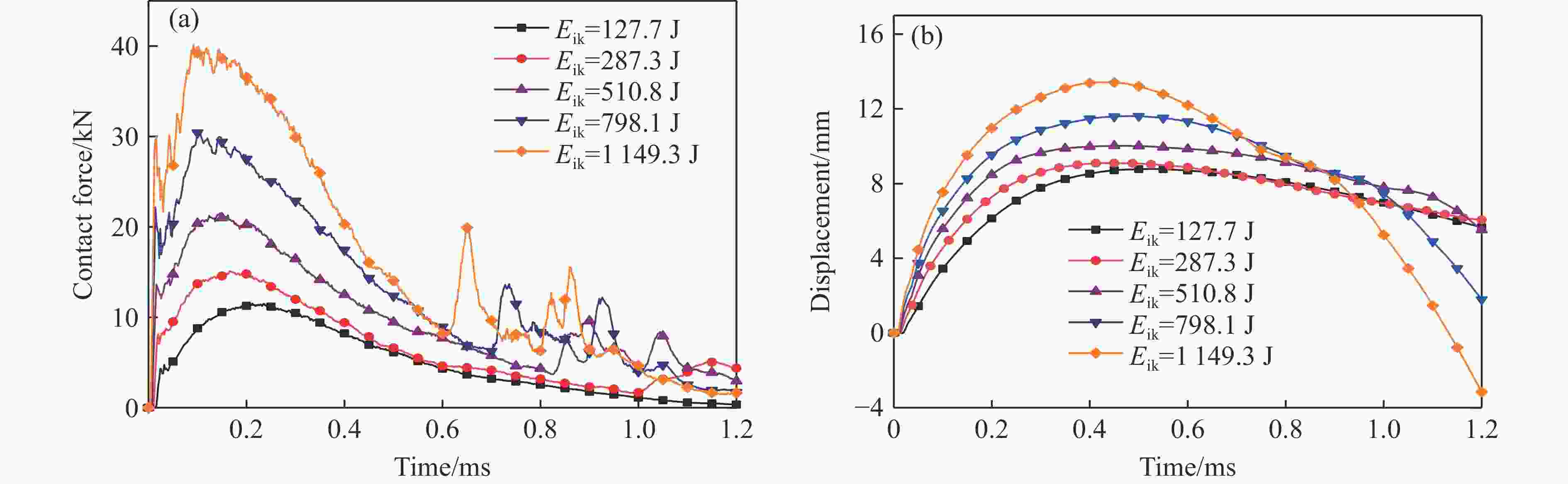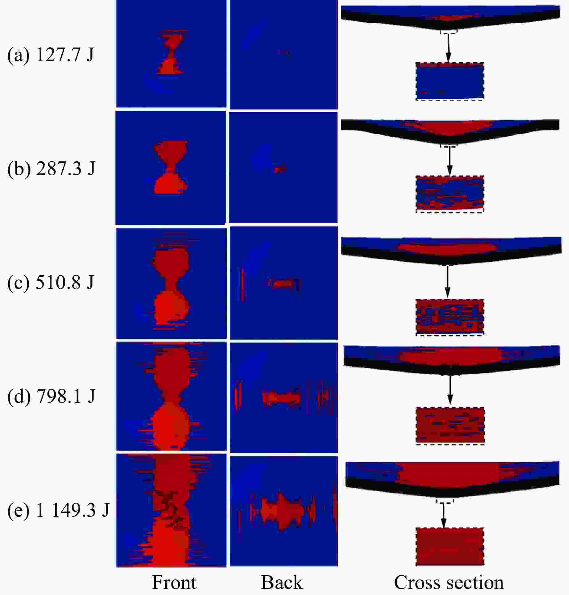 strength ratioStrain rate/s−1 1.05 0.1 2.24 5.0 3.14 100.0 1.54 0.5 2.45 10.0 3.63 500.0 1.75 1.0 2.93 50.0 3.84 1000.0 ρ/(kg·m−3) Elastic modulus/GPa Poisson’s ratio Tension failure pressure/MPa Yield stress/MPa 905 9.38 0.33 0.517 5.2 表 4 不同结构的能量变化