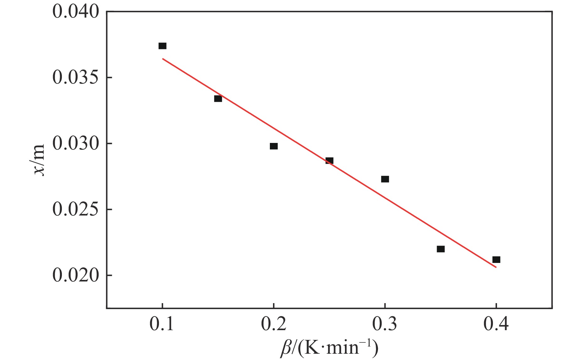 No. β/(K·min−1) x/m 1 0.40 0.0212 2 0.35 0.0220 3 0.30 0.0273 4 0.25 0.0287 5 0.20 0.0298 6 0.15 0.0334 7 0.10 0.0374 -