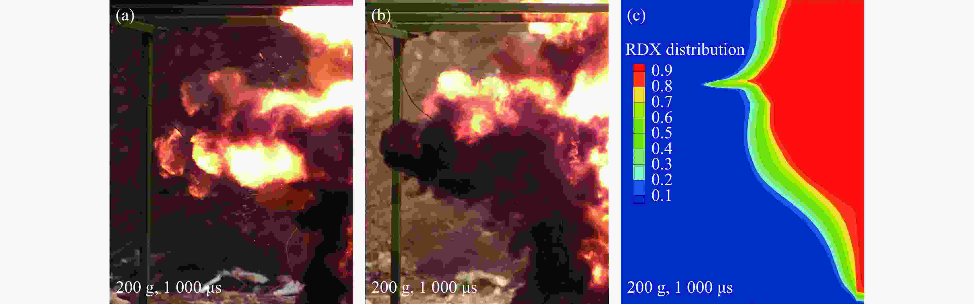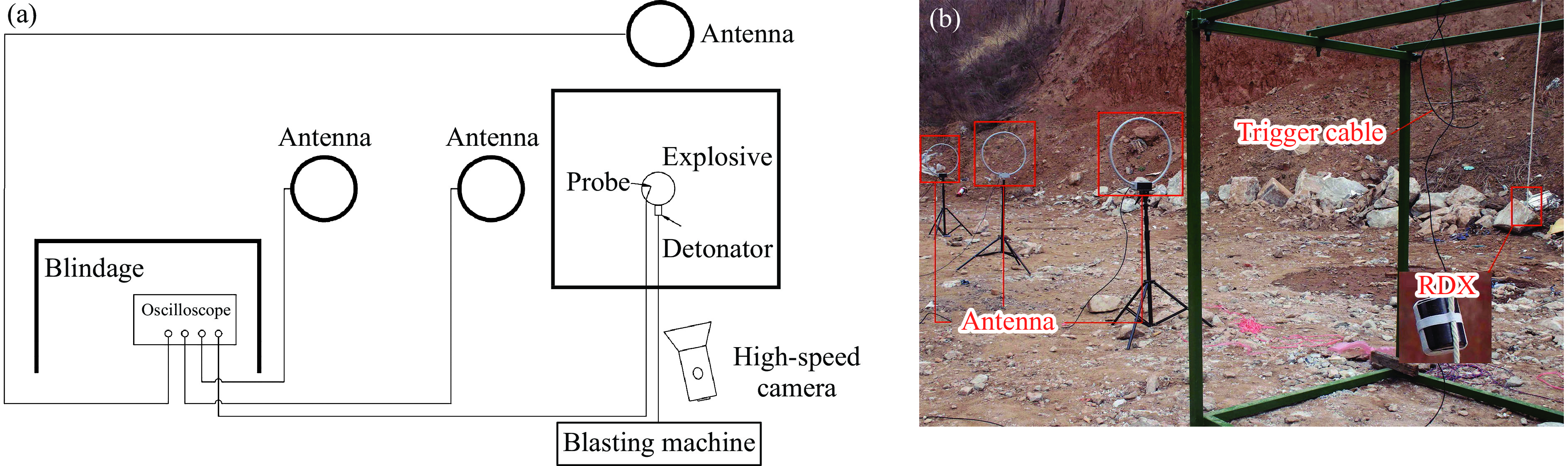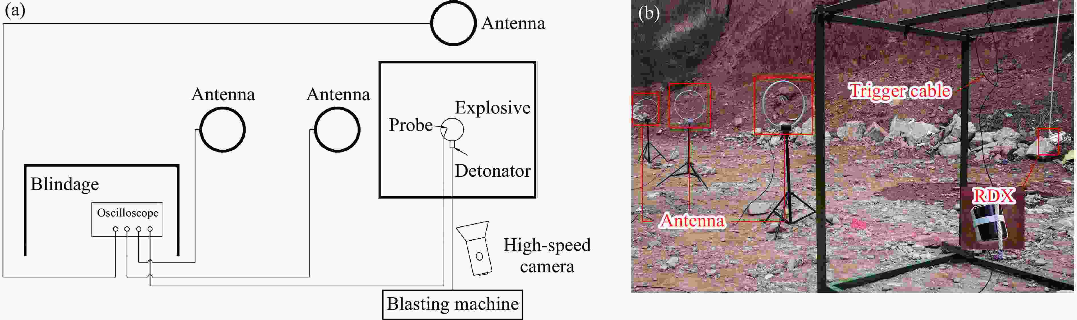 摘要: 常规爆炸伴随着显著的电磁效应,能够对爆炸测试产生干扰,也可以作为一种无接触手段测试爆炸冲击场。研究爆炸电磁效应具有重要的工程应用价值。采用示波器、天线、高速摄像机组成的测量系统对100、200 g药量RDX爆炸电磁辐射进行了5组不同距离测量实验,记录2 ms的电磁辐射信号并对RDX爆炸产生的电磁辐射进行分析。结果表明,RDX爆炸电磁辐射信号主要分为3种时段:重复性强的30 μs附近典型特征峰;同组重复性强、不同组重复性一般的30~200 μs后续特征峰;200 μs后无明显重复性的脉冲信号。结合爆炸高速影像发现,爆炸电磁辐射信号与爆轰产物状态有较强关联,典型特征峰以及后续特征峰主要是爆轰前期剧烈反应使爆轰产物电离产生的信号。利用天线系数反演电场强度曲线,分析药量、距离与电场强度之间的关系,发现对于典型特征峰:同药量下,电场强度随着距离成指数下降;同距离下,200 g药量比100 g药量爆炸产生的电场强度大。Abstract: Conventional explosions are accompanied by significant electromagnetic effects, which can interfere with explosion testing and also serve as a non-contact means of testing explosion shock waves. The study of explosive electromagnetic effects has important engineering application value. A measurement system composed of an oscilloscope, antennas, and a high-speed camera was used to conduct 5 sets of electromagnetic radiation measurement experiments, whose testing object is 100 or 200 g RDX. The experiment recorded electromagnetic radiation signals with 2 ms, and analyzed the electromagnetic radiation generated by RDX explosion. The experimental results showed that the RDX explosive electromagnetic radiation signal mainly consists of three periods: a typical peak at 30 μs with strong repeatability, subsequent peaks with strong repeatability in the same group but poor repeatability in different groups during 30−200 μs, and a pulse signal without obvious repeatability after 200 μs. Combined with high-speed imaging of the explosion, it’s found that there has been a strong correlation between the explosive electromagnetic radiation and the state of detonation products. The typical peak and subsequent peaks are mainly signals generated by the ionization of the explosive products during the violent reaction in the pre-explosion stage. By using the antenna factor to invert the electric field strength curve, the relationship between the explosive equivalent, distance, and electric field strength was analyzed. It’s found that at the same explosive equivalent, the electric field intensity of typical peak decreases exponentially with distance. At the same distance, the electric field intensity of typical peak generated by a 200 g explosion is greater than that of a 100 g explosion.