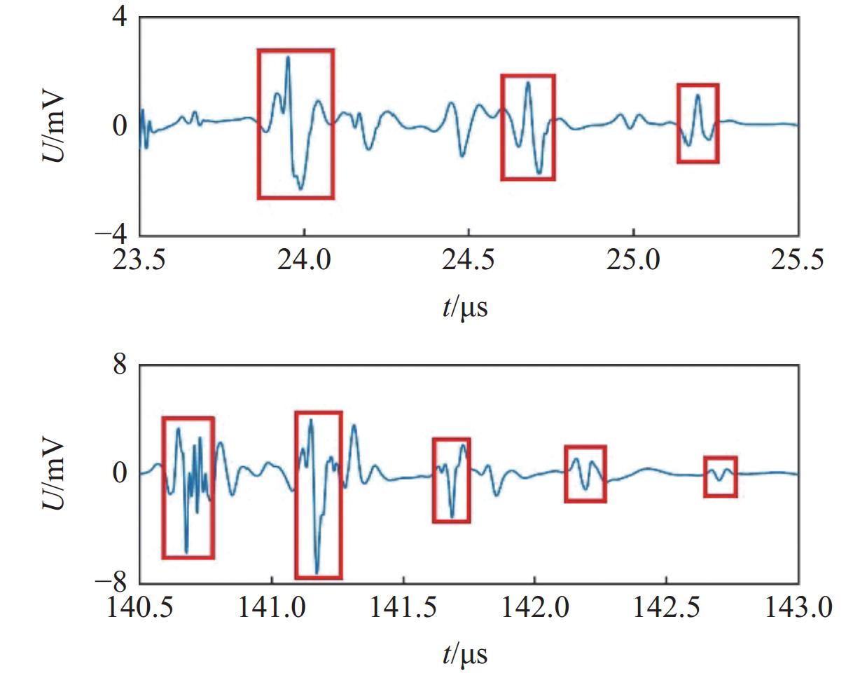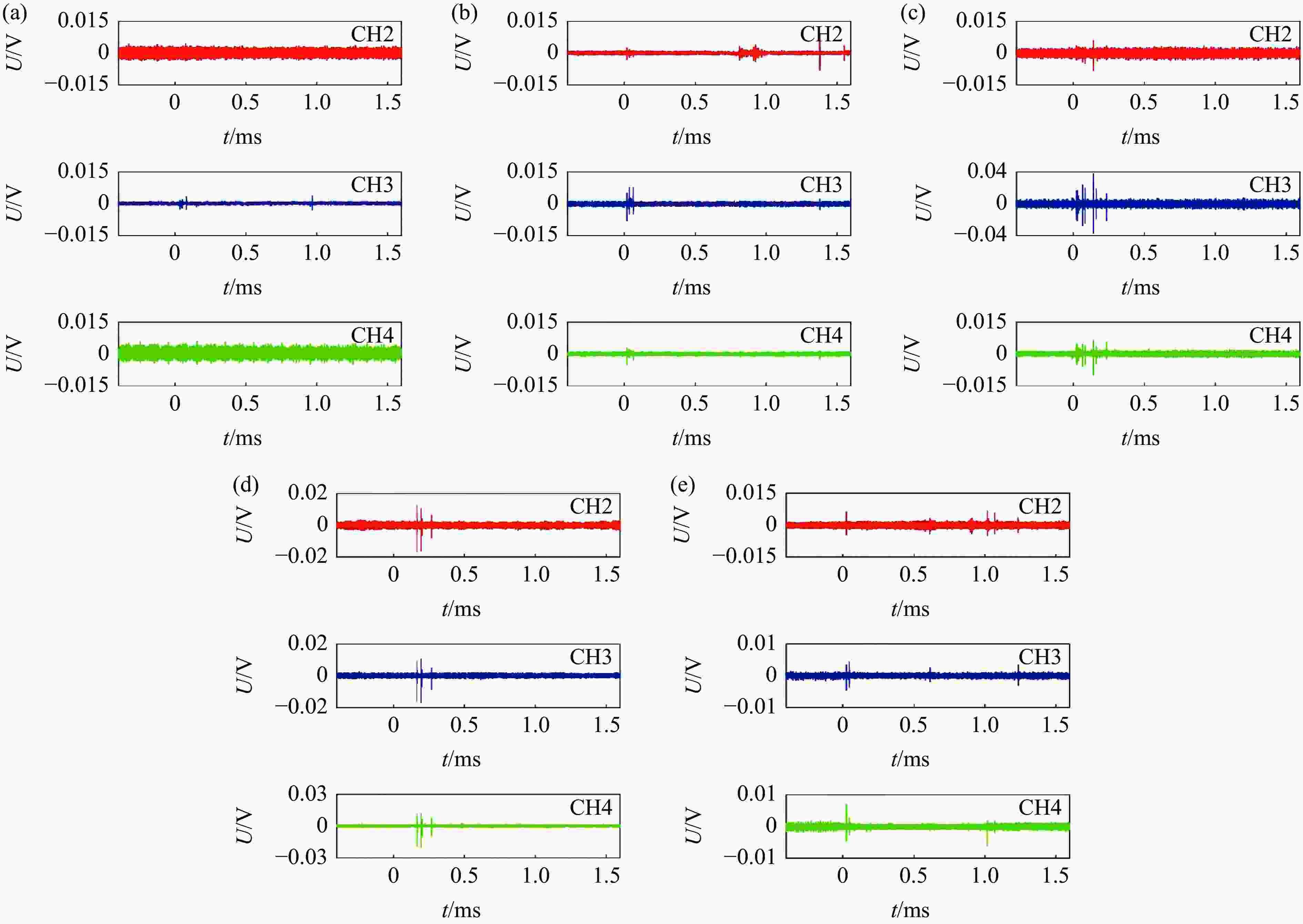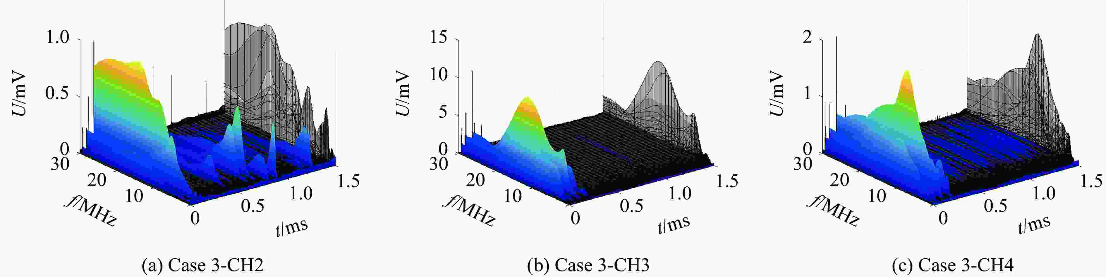 Case Channel Typical peak Follow-up peak t/μs U/V t/μs U/V 2 CH2 23.62 −0.0023 39.89 0.0012 CH3 23.61 −0.0055 39.53 0.0046 CH4 23.77 −0.0032 39.84 −0.0009 3 CH2 28.12 −0.0007 140.70 0.0047 CH3 28.45 −0.0044 140.60 0.0294 CH4 28.35 −0.0025 141.20 −0.0073 4 CH2 167.50 −0.0123 198.00 −0.0127 CH3 167.40 −0.0124 197.90 −0.0118 CH4 168.00 −0.0145 198.10 −0.0153 5 CH2 23.82 0.0037 44.96 −0.0010 CH3 23.84 0.0024 44.74 0.0033 CH4 23.98 0.0051 44.46 0.0017 表 4 典型特征峰和后续特征峰的频域特性