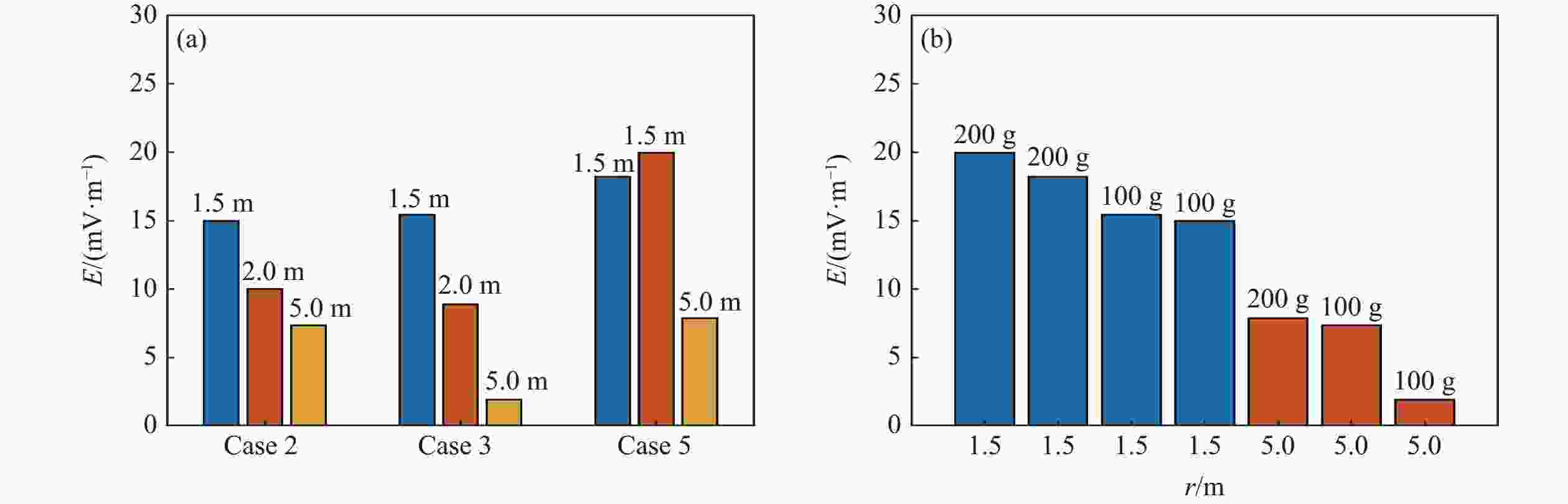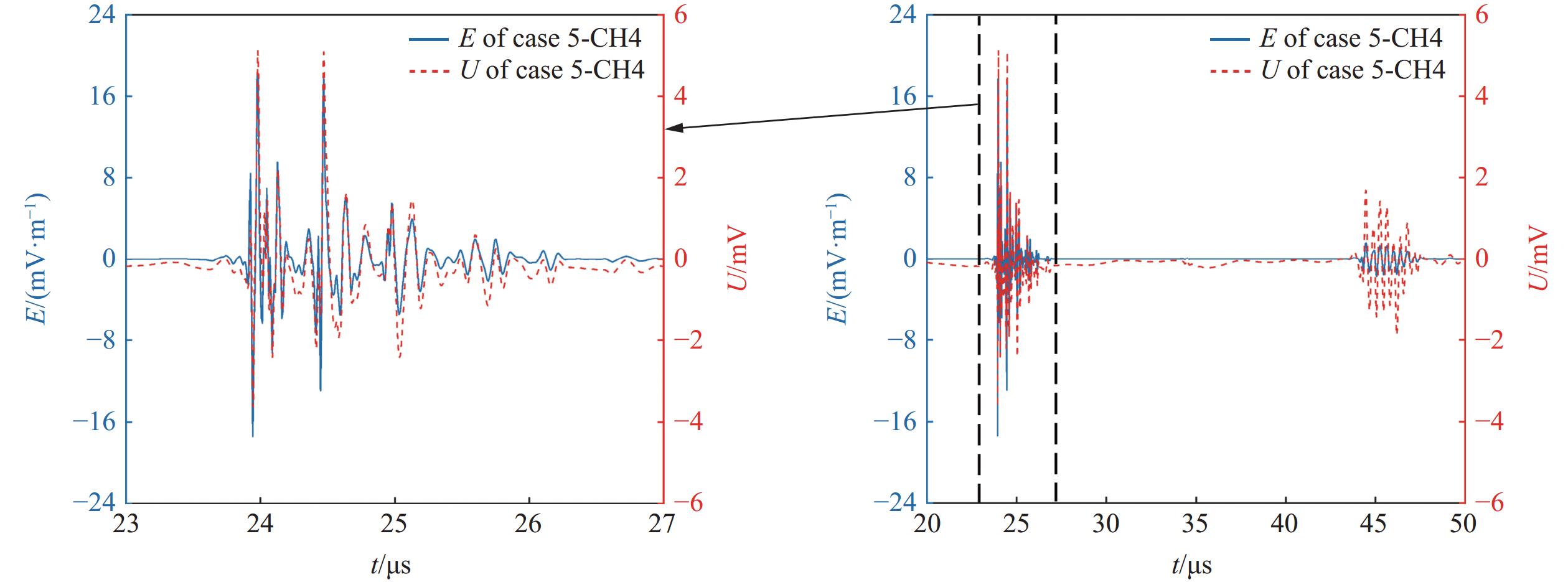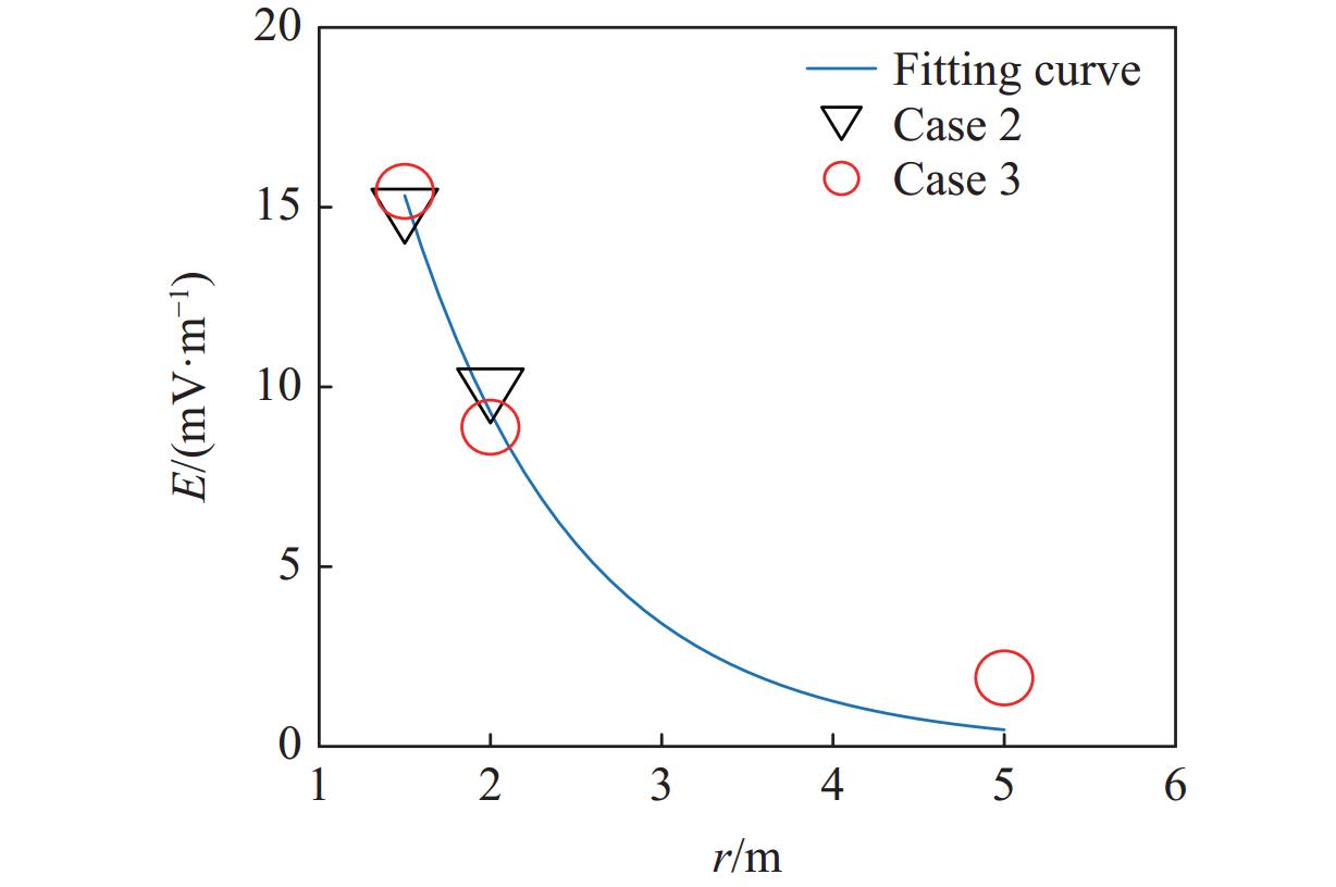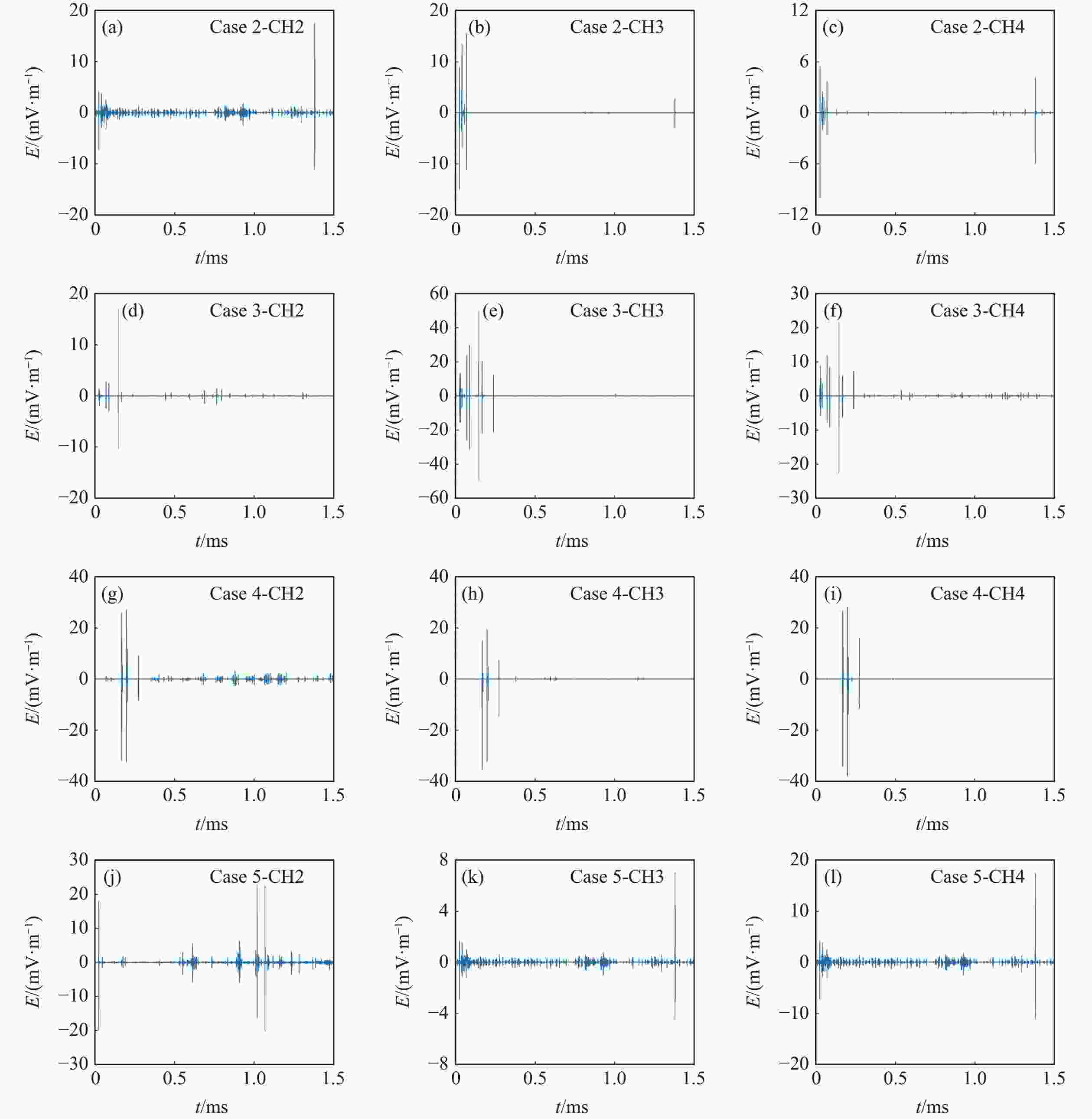 Case Channel Typical peak Follow-up peak t/μs E/(V·m−1) t/μs E/(V·m−1) 2 CH2 23.6 −0.0073 39.8 0.0028 CH3 23.8 −0.0150 39.8 0.0130 CH4 23.8 −0.0100 40.3 0.0025 3 CH2 27.9 −0.0019 144.9 0.0170 CH3 27.6 −0.0154 144.8 0.0504 CH4 28.2 0.0088 145.4 −0.0229 4 CH2 167.5 −0.0318 198.0 −0.0326 CH3 167.9 −0.0354 198.4 −0.0325 CH4 168.0 −0.0343 198.5 −0.0379 5 CH2 23.9 −0.0199 44.8 −0.0016 CH3 23.9 −0.0079 45.0 0.0018 CH4 24.0 0.0182 45.5 −0.0016 -