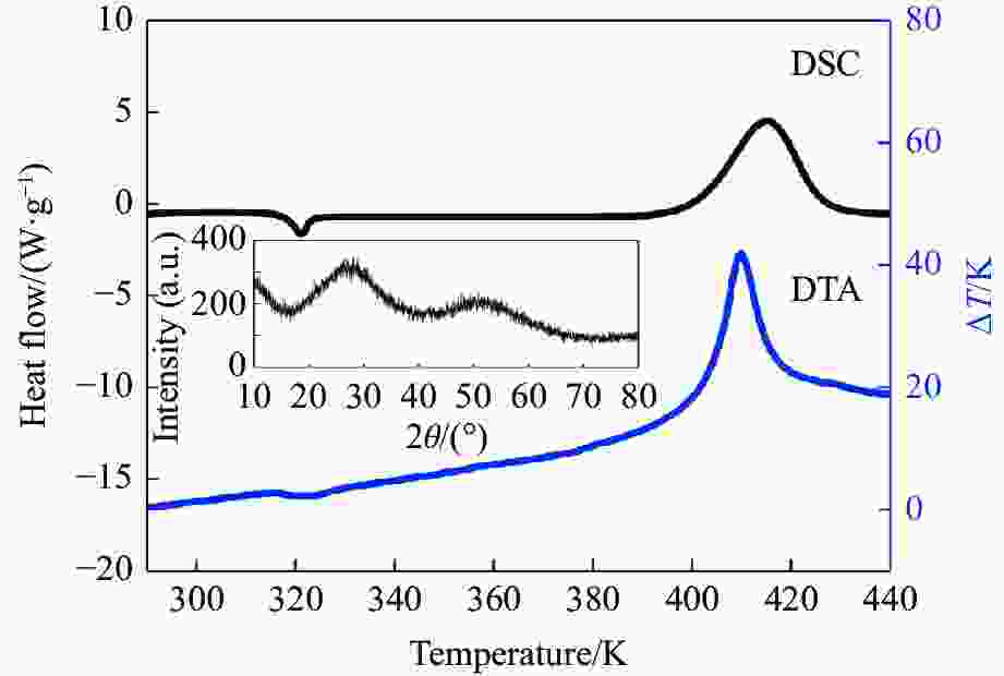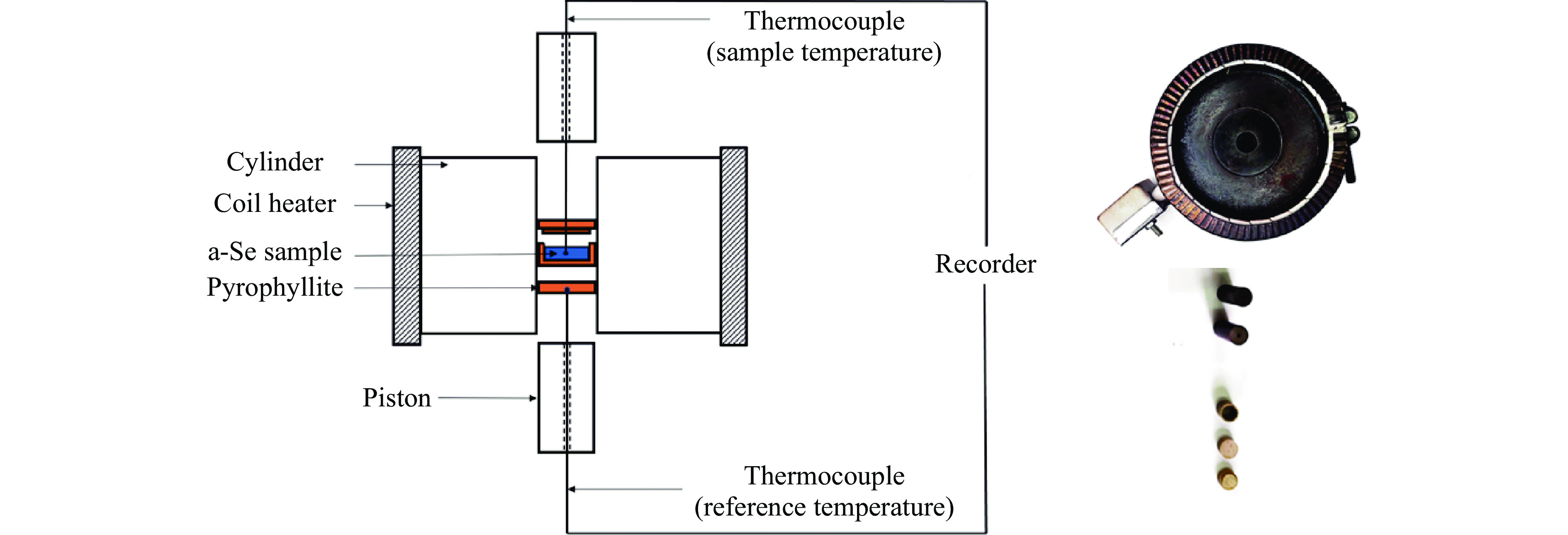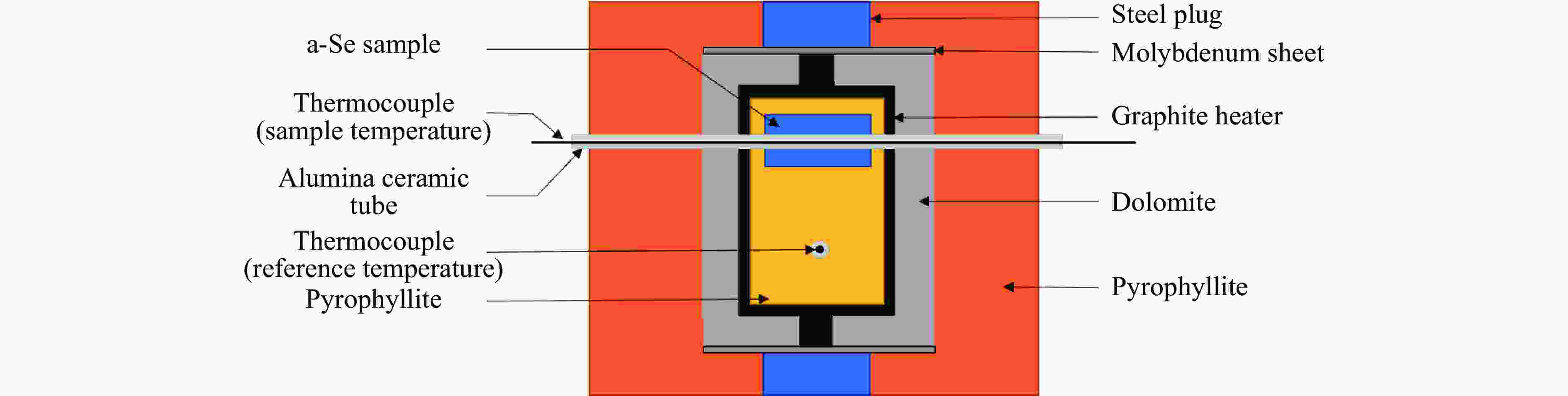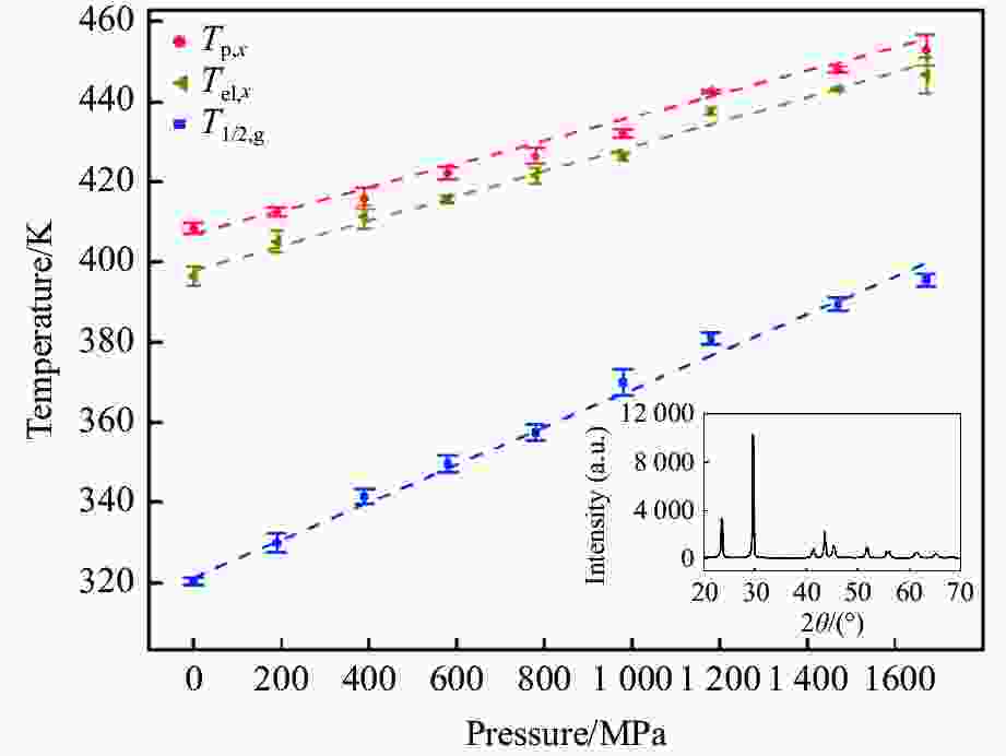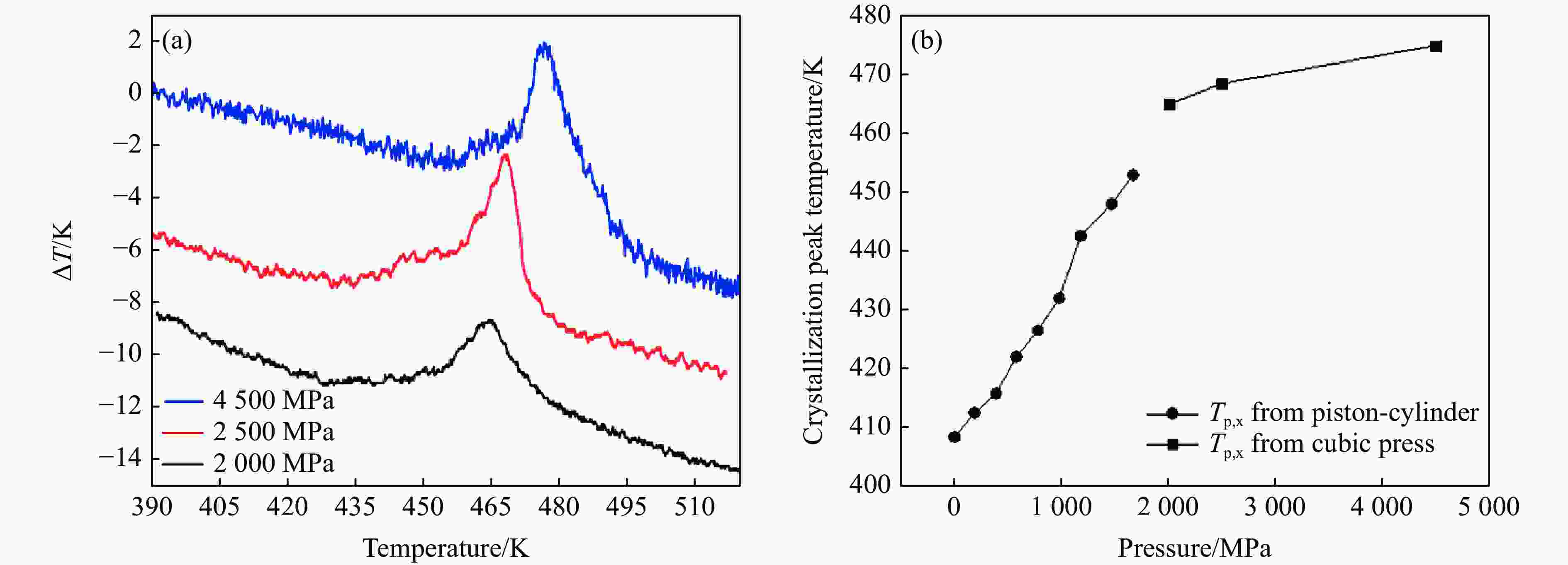$ {T}_{\text{g}} $ 和晶化温度${T}_{x}$ ,拟合出玻璃化转变中点温度$ {T}_{1/2,\text{g}} $ 与外推起始晶化温度Tel,x随压力p的变化关系:${T}_{1/2,\text{g}}\left(p\right)=$ $322+0.046\,2p$ ,${T}_{\mathrm{e}\mathrm{l},x}\left(p\right)=398+0.030\,2p$ ,其中,$ {T}_{1/2,\text{g}} $ 和Tel,x的单位均为K,p的单位为MPa。$ {T}_{1/2,\text{g}} $ 和Tel,x均随压力的增加而升高。由于Tel,x(p)的斜率小于$ {T}_{1/2,\text{g}} $ (p)的斜率,导致过冷液相区的温度范围随着压力的增加而变窄。在六面顶压机上开展差热分析,测得了2000~4500 MPa压力范围内非晶硒的晶化温度。结合活塞圆筒实验结果,发现了非晶硒的晶化温度随压力的变化规律:在0.1~1700 MPa范围内,晶化温度随压力的增加而升高;在2000 MPa以上,晶化温度的上升速率随压力的增加明显降低。当压力引起非晶硒的微观结构变化时,Tg(p)与Tx(p)曲线的斜率变化发生在相近的压力下,结合实验结果—Tx(p)的斜率变化出现在2 GPa左右,因此,推测Tg(p)的斜率变化可能出现在2 GPa左右。大腔体高压装置实验获得的转变点压力与以往报道的金刚石压砧实验结果不一致,可能与这两类实验中玻璃化转变温度、晶化温度的测量方法不同及压力测量误差有关。Abstract: The effect of pressure on the glass transition temperature and the supercooled liquid region of amorphous selenium (a-Se), which was prepared through melting quenching, was investigated. The glass transition temperature$ {T}_{\text{g}} $ and crystallization temperature Tx were determined through the differential thermal analysis (DTA) during isobaric heating. The experimental results from piston-cylinder apparatus showed that both$ {T}_{\text{g}} $ and Tx increase with the increasing pressure in the pressure range of 0.1-1700 MPa. The glass transition middle temperatures$ {T}_{1/2,\text{g}} $ and extrapolated crystallization onset temperatures Tel,x were linearly fitted to pressure. The fitting results are${T}_{1/2,\text{g}}\left(p\right)=322+0.046\,2p$ and${T}_{\mathrm{e}\mathrm{l},x}\left(p\right)=398+0.030\,2p$ , where the unit of temperature is K, and the unit of pressure is MPa. The smaller slope of Tel,x(p), compared with that of$ {T}_{1/2,\text{g}} $ (p), induces the temperature range (Tel,x−$ {T}_{1/2,\text{g}} $ ) in the supercooled liquid region to be narrower with the increase of pressure. DTA data in the pressure range of 2000−4500 MPa was performed by using a cubic press. A slope change in Tx(p) curve is found. Tx increases with the increasing pressure within 0.1−1700 MPa, and the rate slows down when the pressure is above 2000 MPa. In the previous diamond anvil reports, a similar pressure dependence of Tx and Tg was observed, i.e., Tx and Tg both increase initially with the increasing pressure, and then become nearly constant above 1000 MPa. Since the slope changes in Tg(p) and Tx(p) curves occur nearly at the same pressure when the microstructure of a-Se changes, in view of the pressure of 2000 MPa corresponding to the inflection point of Tx(p) curve obtained in this study, it is speculated that the pressure of the inflection point of Tg(p) curve may be around 2000 MPa. The different pressures corresponding to the slope change obtained by the diamond anvil cell and the large-volume press may be related to the measurement method of Tg and Tx, as well as the pressure measurement error.-