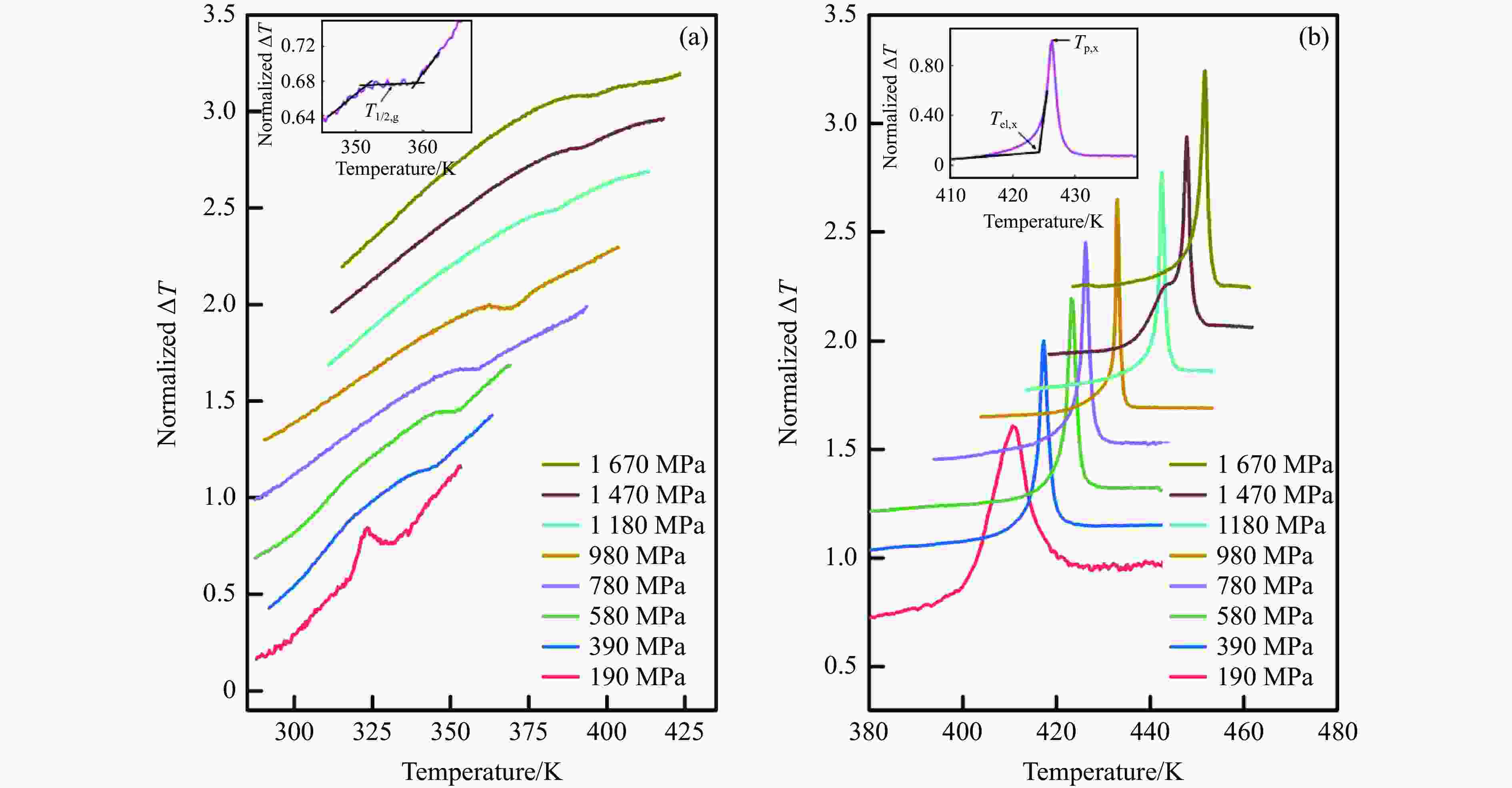 图 5 活塞圆筒装置上测得的非晶硒在不同压力下(a)玻璃化转变过程中的DTA曲线和(b)晶化过程中的DTA曲线(内插图给出了T1/2,g, Tel,x 和 Tp,x的选取方法示意图)