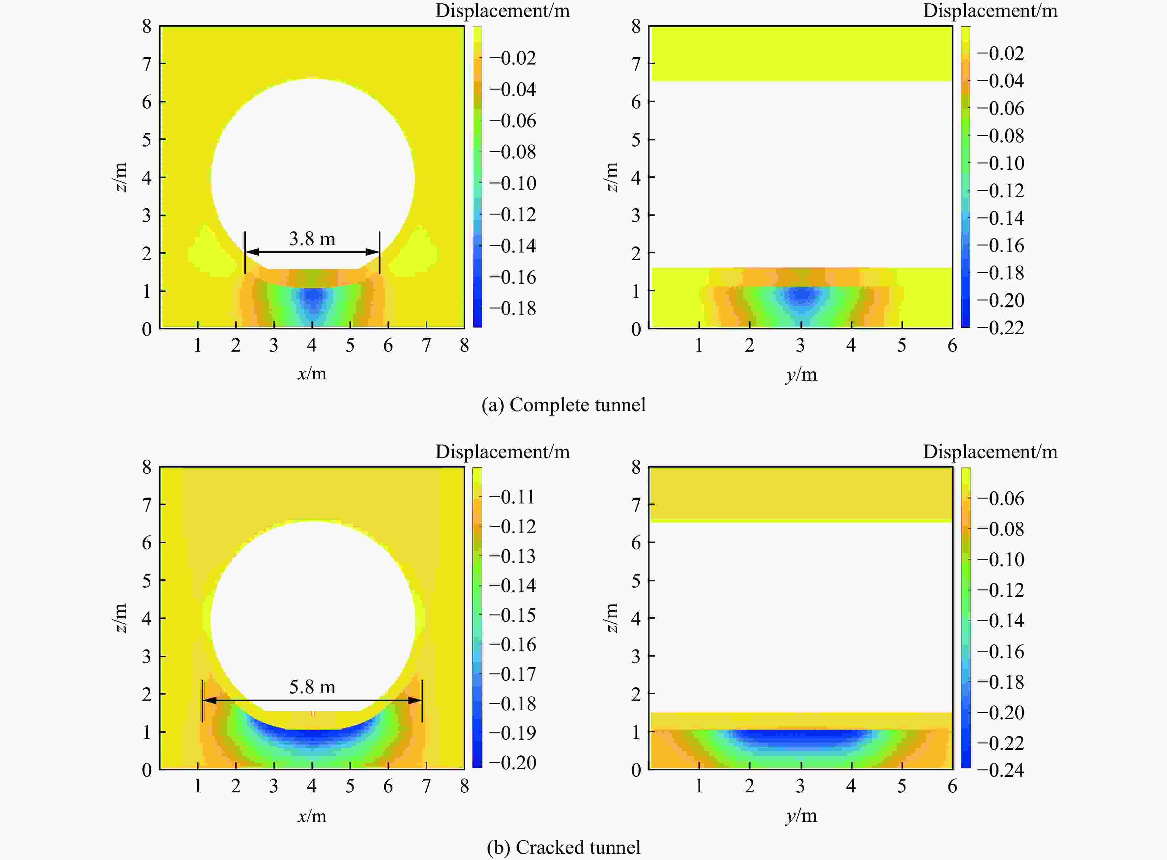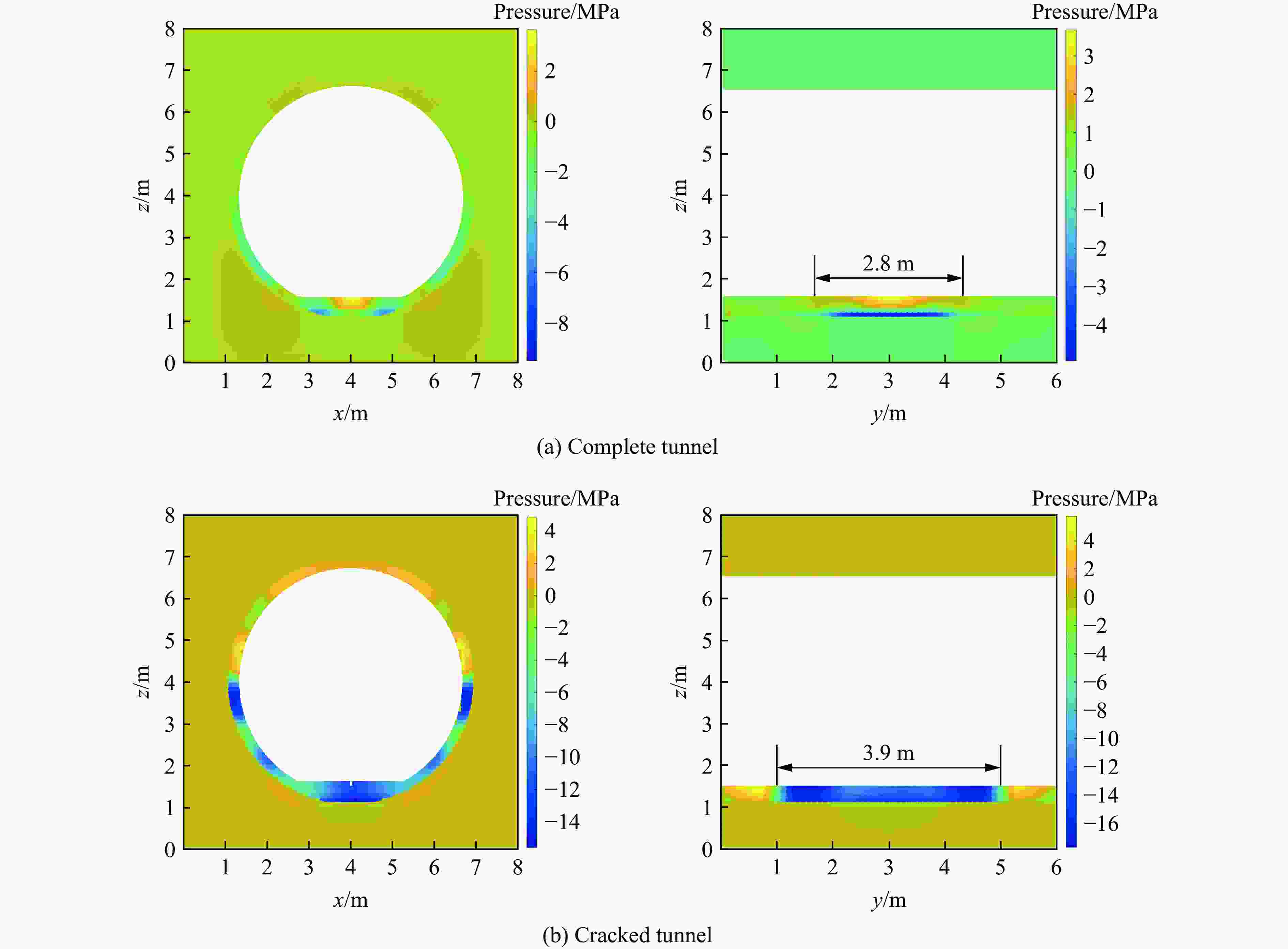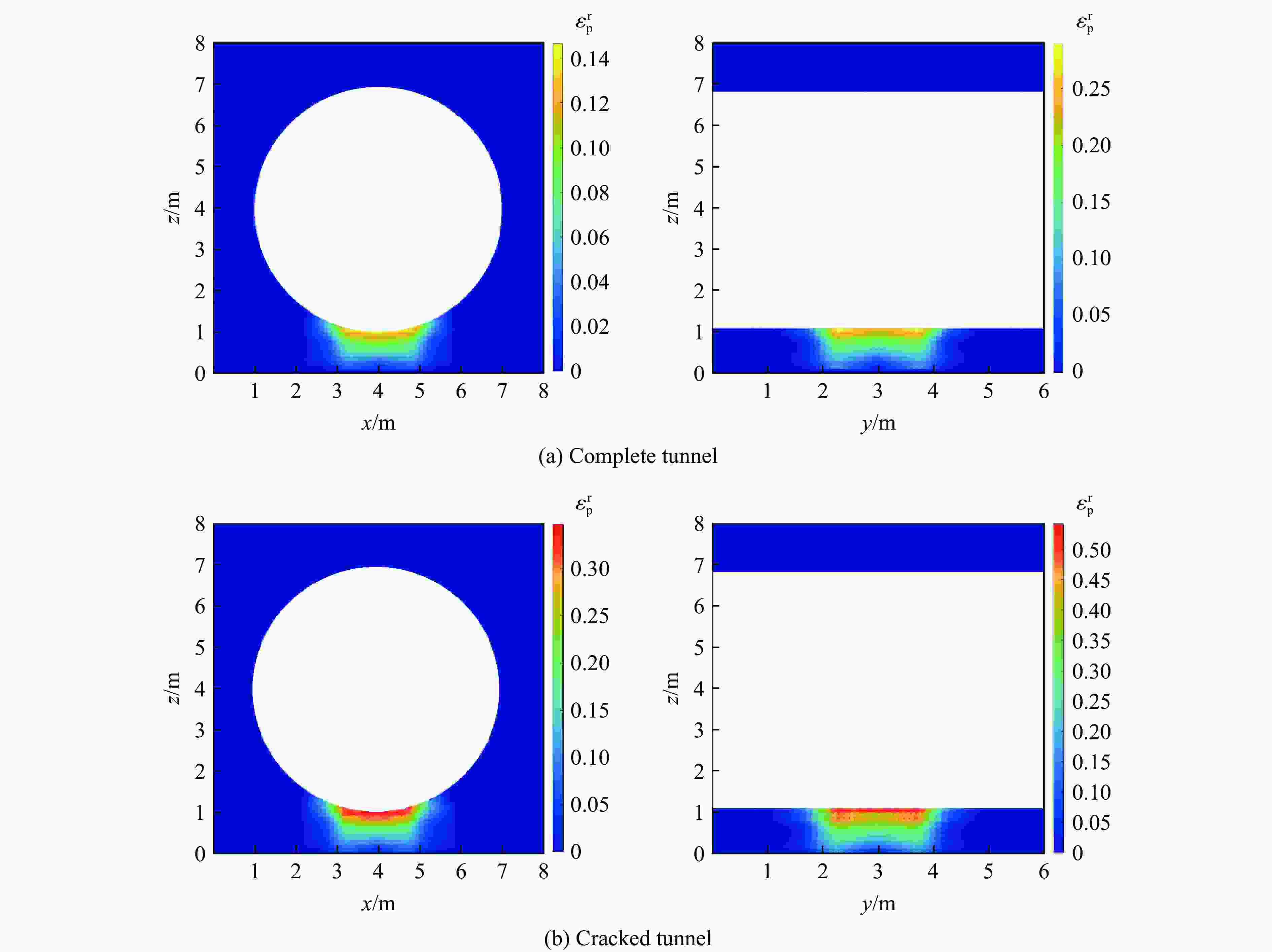 Condition $ {p}_{\mathrm{m}\mathrm{a}\mathrm{x}}^{\mathrm{s}} $/MPa $ {d}_{\mathrm{m}\mathrm{a}\mathrm{x}}^{\mathrm{r}} $/m ${\varepsilon }_{\mathrm{p,}\mathrm{m}\mathrm{a}\mathrm{x} }^{\mathrm{r} }$ $ {d}_{\mathrm{m}\mathrm{a}\mathrm{x}}^{\mathrm{s}} $/m $ {S}_{\mathrm{f}} $/m2 Complete tunnel 3.8 0.22 0.29 0.04 1.21 Cracked tunnel 4.3 0.24 0.59 0.06 1.60 Variation/% 13.15 9.09 103.40 50.00 33.05 -