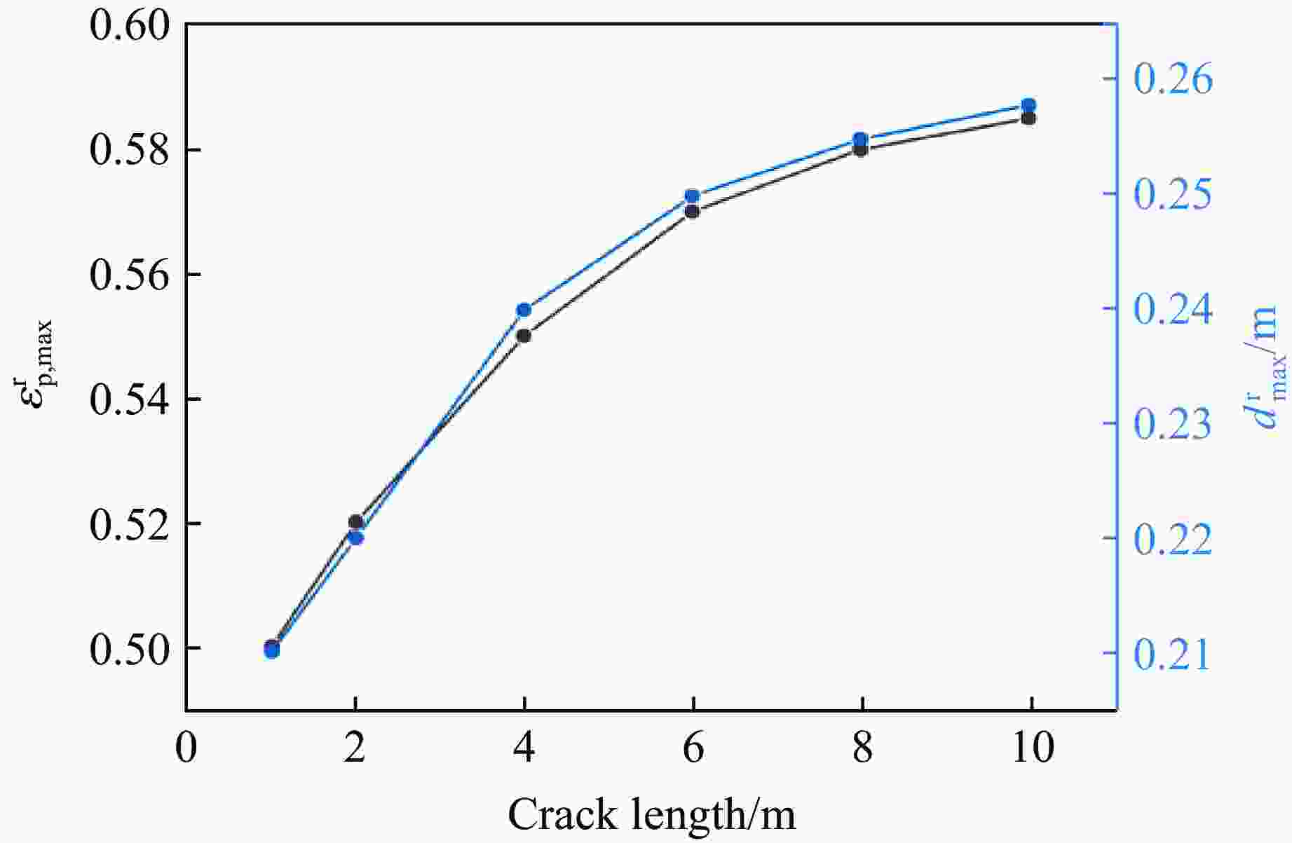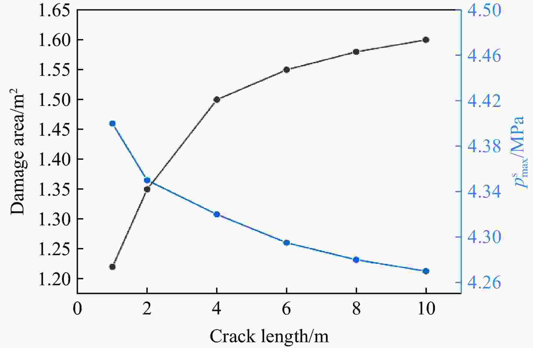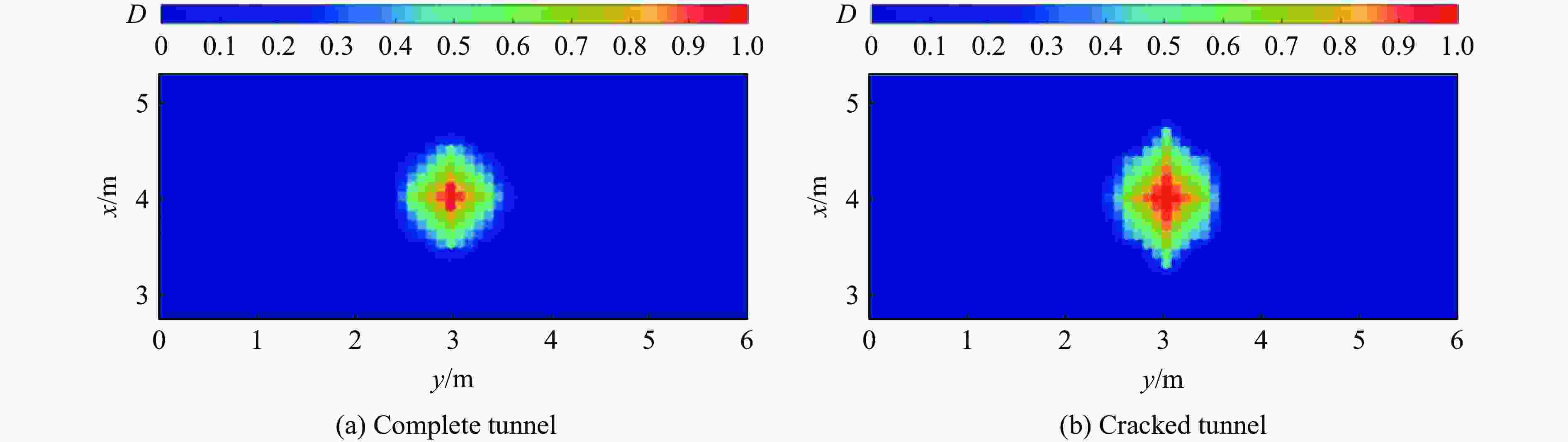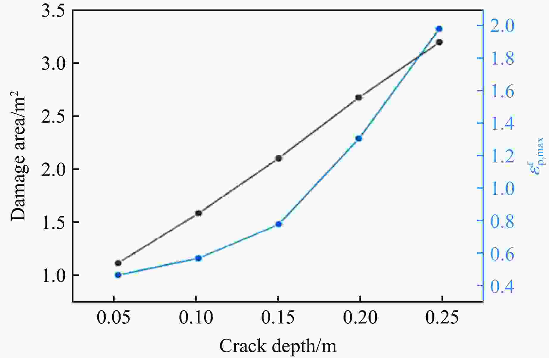 Condition $ {p}_{\mathrm{m}\mathrm{a}\mathrm{x}}^{\mathrm{s}} $/MPa $ {d}_{\mathrm{m}\mathrm{a}\mathrm{x}}^{\mathrm{r}} $/m ${\varepsilon }_{\mathrm{p,}\mathrm{m}\mathrm{a}\mathrm{x} }^{\mathrm{r} }$ $ {d}_{\mathrm{m}\mathrm{a}\mathrm{x}}^{\mathrm{s}} $/m $ {S}_{\mathrm{f}} $/m2 Complete tunnel 3.8 0.22 0.29 0.04 1.21 Cracked tunnel 4.3 0.24 0.59 0.06 1.60 Variation/% 13.15 9.09 103.40 50.00 33.05 -