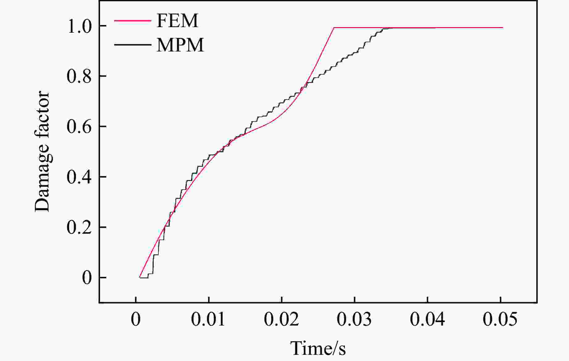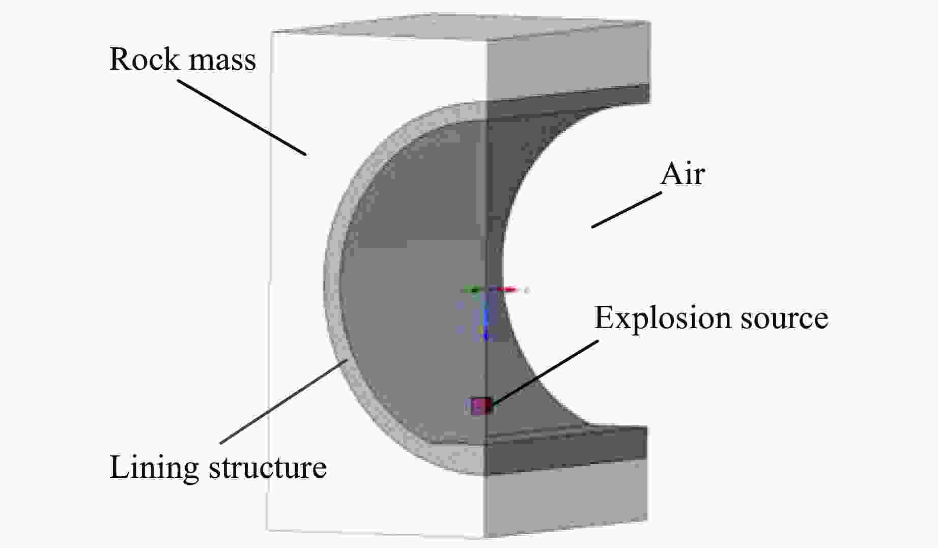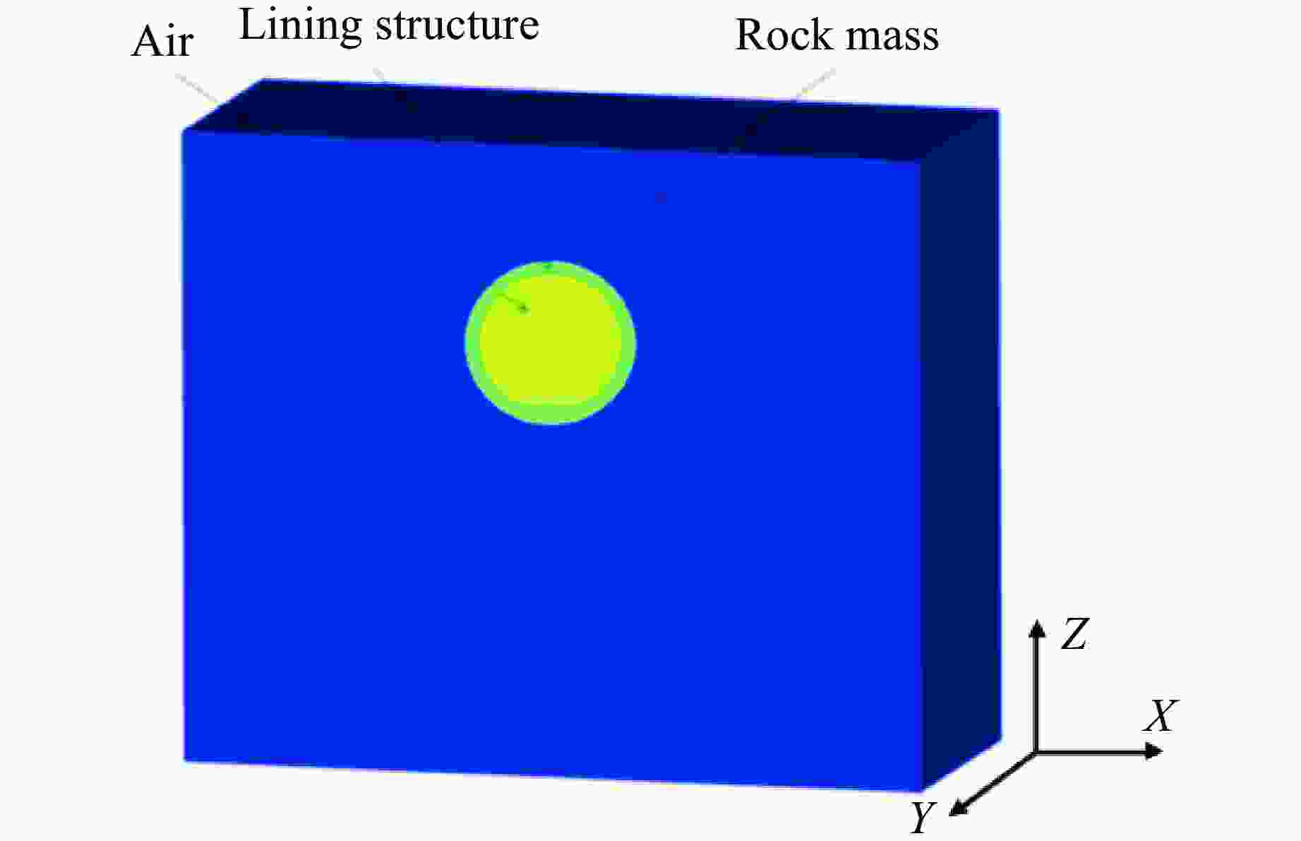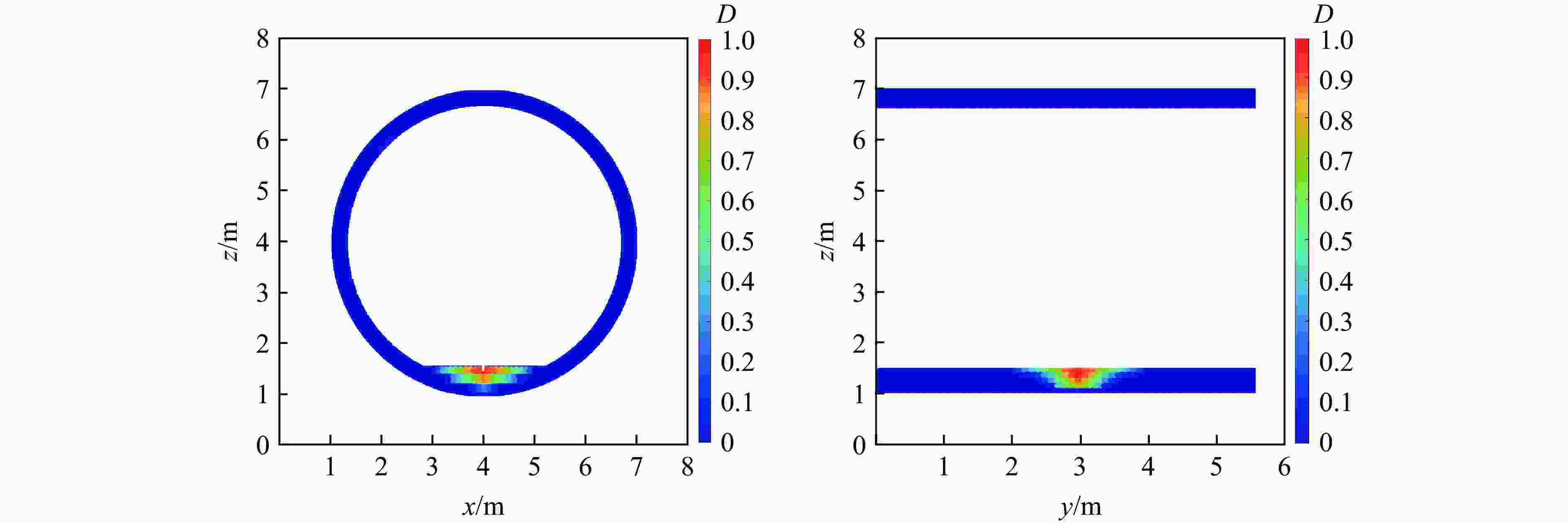 $f'{_{ \mathrm{c} } ^{ { {} } } }$/MPa $\rho /(\rm{kg\cdot {m}^{-3}})$ $ E/{\rm{GPa}} $ $ \nu $ $ A $ $ B $ $ n $ $ C $ ${S}_{ \mathrm{m}\mathrm{a}\mathrm{x} }$ ${D}{_{1} }$ ${D}{_{2} }$ 40 2400 32.5 0.2 0.79 1.6 0.61 0.007 7.0 0.04 1.0 ${\varepsilon }{_{\mathrm{m}\mathrm{i}\mathrm{n} }^{\mathrm{f} } }$ ${p}{_{\mathrm{c}\mathrm{r}\mathrm{u}\mathrm{s}\mathrm{h} }}/{\rm{GPa}}$ ${p} {_{\mathrm{l}\mathrm{o}\mathrm{c}\mathrm{k} } }/{\rm{GPa}}$ ${\mu }{_{\mathrm{c}\mathrm{r}\mathrm{u}\mathrm{s}\mathrm{h} }}$ ${\mu }{_{\mathrm{l}\mathrm{o}\mathrm{c}\mathrm{k} } }$ ${K}{_{1}}/{\rm{GPa}}$ ${K}{_{2}}/{\rm{GPa}}$ ${K}{_{3}}/{\rm{GPa}}$ $ T/{\rm{GPa}} $ ${v }{_{\mathrm{p} } }/(\rm{m\cdot {s}^{-1}})$ ${v }{_{\mathrm{s} } }/(\rm{m\cdot {s}^{-1}})$ 0.01 0.016 0.8 0.001 0.1 85 −171 208 0.004 3870 2375 表 2 围岩的物理力学参数