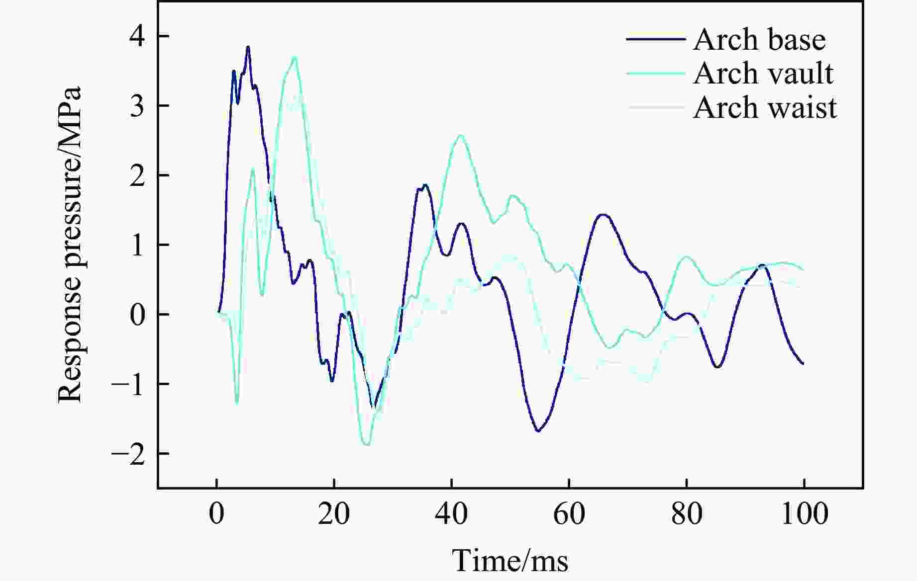 ${\rho }{_{0} }/(\mathrm{k}\mathrm{g}\cdot{\mathrm{m} }^{-3})$ ${p}_{\mathrm{C}\mathrm{J} }/\rm{GPa}$ ${D}_{\mathrm{J} }/(\rm{m\cdot{s}^{-1} })$ $ \gamma $ ${E}_{0}/(\mathrm{k}\mathrm{J}\cdot{\mathrm{c}\mathrm{m} }^{-3})$ 1500 21.0 6930 2.727 7.0 ${A}_{\mathrm{J} }/\rm{GPa}$ ${B}_{\mathrm{J} }/\rm{GPa}$ $ {R}_{1} $ $ {R}_{2} $ $ \omega $ 371.2 3.23 4.15 0.95 0.30 表 5 有、无裂损情况下爆炸作用下地铁隧道结构和围岩的响应情况对比