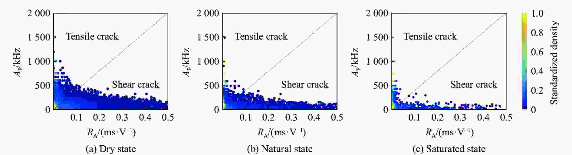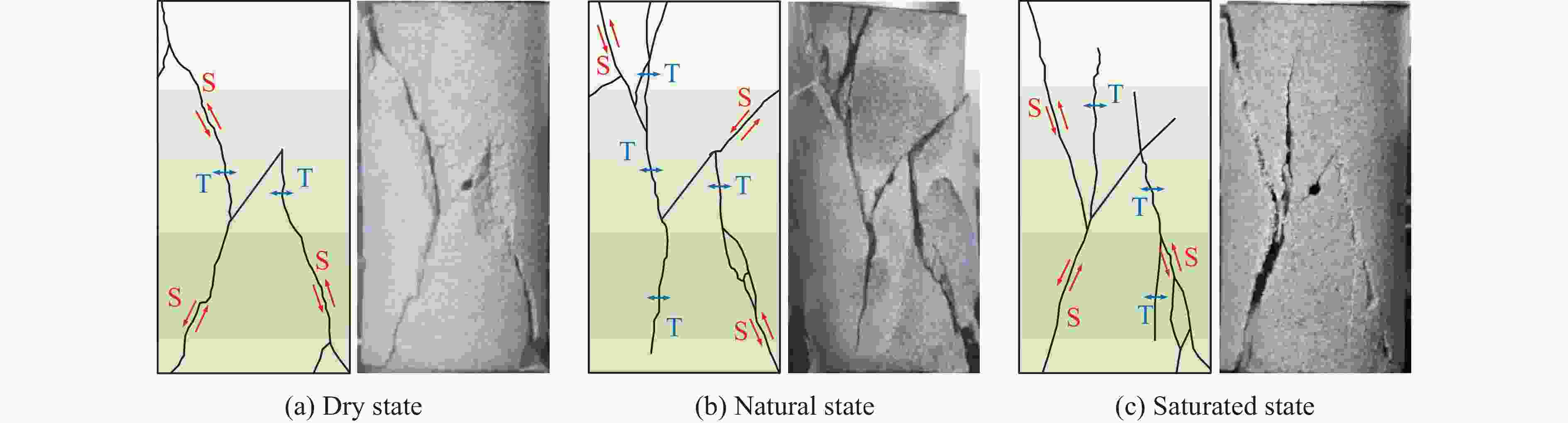 摘要: 为进一步揭示不同含水状态陡倾裂隙砂岩的裂纹扩展规律及破坏特征,开展了干燥、自然与饱水3种含水状态下陡倾裂隙砂岩的单轴压缩试验,采用声发射技术和数字图像相关技术,分析了不同含水状态对裂隙砂岩力学特性、声发射特性及裂纹演化特征的影响。结果表明:水的存在对裂隙砂岩的抗压强度、弹性模量及峰值应变具有明显劣化作用,随着含水率增加,各力学参数呈现出近线性递减的变化趋势;不同含水状态下裂隙砂岩的宏观破坏模式均表现为H形张拉-剪切混合破坏,且张拉裂纹随含水率的增加而增多,次生裂纹也主要以张拉裂纹的形式扩展;裂隙砂岩的声发射能量计数随含水率的增加逐渐削弱,累计能量曲线呈现出明显的阶段性特征,且不同含水状态下其分布特征差异明显,结合声发射与数字图像相关技术两种分析方法,有助于从宏细观角度揭示裂隙砂岩的裂纹演化规律,依据应变局部化带可有效预测裂纹萌生与扩展方向,含水率的增加加快了裂纹萌生速率,减缓了加载后期裂纹扩展速率;基于声发射参数的微裂纹分析结果与宏观破坏模式基本一致,不同含水状态对裂隙砂岩拉剪裂纹的影响差异明显,含水率的增加促进了裂隙砂岩内部张拉裂纹的发育,进而抑制了剪切裂纹的发育。研究结果可为受水影响下裂隙岩石的稳定性评估及监测研究提供相关参考。Abstract: To further reveal the crack propagation law and failure characteristics of fissured sandstone with different moisture states, the uniaxial compression tests of steeply dipping fissured sandstone were carried out with different moisture states of dry, natural, and saturated. Acoustic emission (AE) and digital image correlation (DIC) techniques were used to analyze the effects of moisture state on the mechanical properties, AE characteristics, and crack evolution characteristics of fissured sandstone. The results show that water has a significant deterioration effect on the compressive strength, elastic modulus and peak strain of the fissured sandstone, and the mechanical parameters show a nearly linear decreasing trend as moisture content increases. The macroscopic failure mode of the fissured sandstone all exhibits H-type tensile-shear mixed failure under different moisture states, and the tensile cracks gradually increase with increasing moisture content, the secondary cracks also propagate mainly in the form of tensile cracks. As moisture content increases, the AE energy counts of fissured sandstone weaken gradually, the cumulative energy curve presents obvious stage characteristics and its distribution characteristics vary significantly with the moisture state. The combination of AE and DIC analysis methods is helpful to reveal the crack evolution law of fissured sandstone from the macro-meso perspective. The crack initiation and propagation orientation can be effectively predicted according to the strain localization zone, and the increase in moisture content speeds up the crack initiation rate and slows down the crack propagation rate in the later stage of loading. The results of micro-crack analysis based on the AE parameters are basically consistent with the macroscopic failure mode. The effect of moisture state on tensile and shear cracks in fissured sandstone varies significantly, with increasing moisture content promoting the development of tensile cracks and thereby inhibiting the development of shear cracks. The research results can provide a reference for the stability evaluation and monitoring of fissured rock under the effect of water.