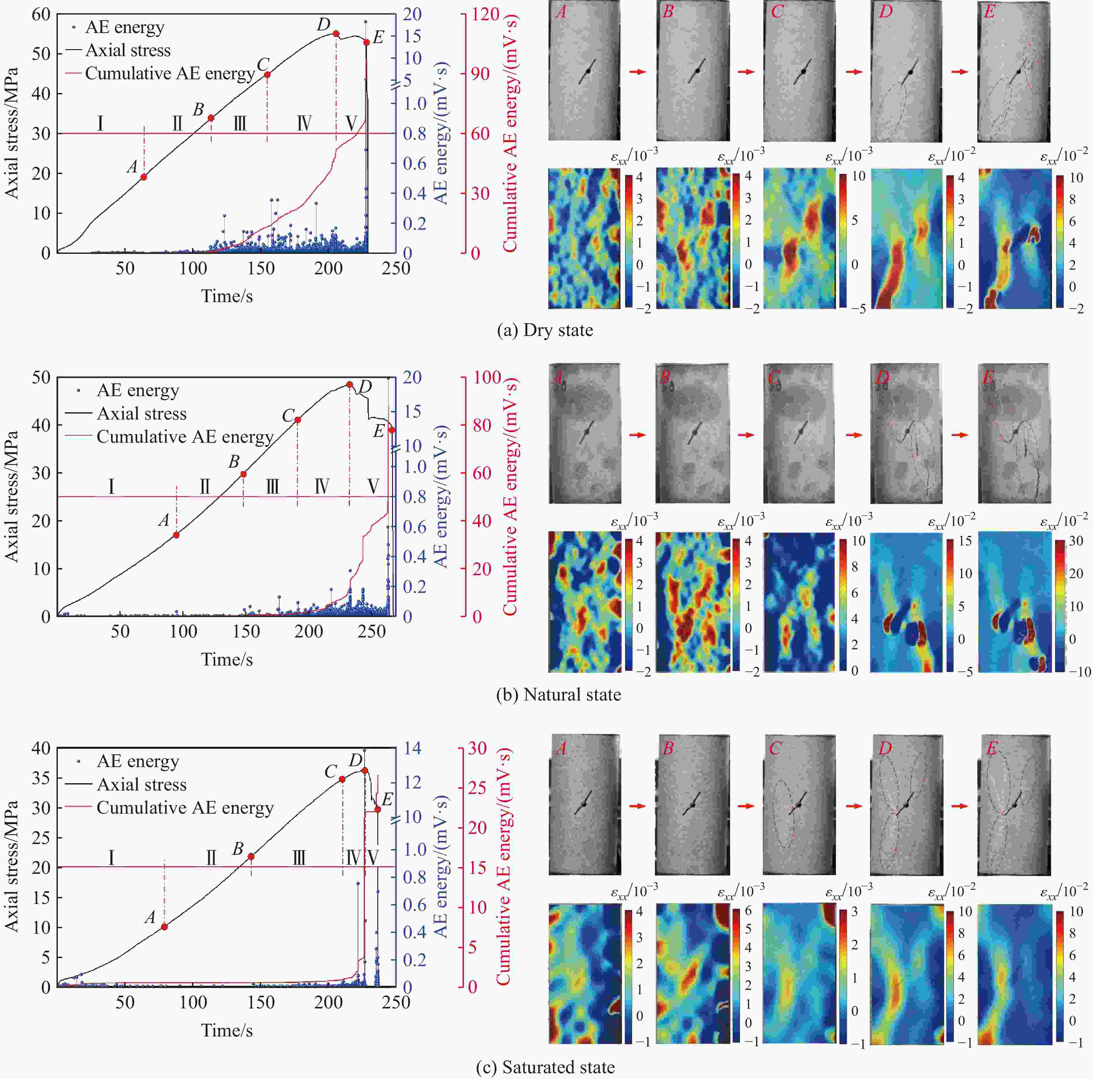 [1] 佘诗刚, 林鹏. 中国岩石工程若干进展与挑战 [J]. 岩石力学与工程学报, 2014, 33(3): 433–457. doi: 10.13722/j.cnki.jrme.2014.03.001SHE S G, LIN P. Some developments and challenging issues in rock engineering field in China [J]. Chinese Journal of Rock Mechanics and Engineering, 2014, 33(3): 433–457. doi: 10.13722/j.cnki.jrme.2014.03.001 [2] 陈卫忠, 杨建平, 邹喜德,等. 裂隙岩体宏观力学参数研究 [J]. 岩石力学与工程学报, 2008, 201(8): 1569–1575. doi: 10.3321/j.issn:1000-6915.2008.08.005CHEN W Z, YANG J P, ZOU X D, et al. Research on macromechanical parameters of fractured rock mass [J]. Chinese Journal of Rock Mechanics and Engineering, 2008, 201(8): 1569–1575. doi: 10.3321/j.issn:1000-6915.2008.08.005 [3] CAO P, LIU T, PU C, et al. Crack propagation and coalescence of brittle rock-like specimens with pre-existing cracks in compression [J]. Engineering Geology, 2015, 187: 113–121. doi: 10.1016/j.enggeo.2014.12.010 [4] CHEN J, YE Y B, PU Y Y, et al. Experimental study on uniaxial compression failure modes and acoustic emission characteristics of fissured sandstone under water saturation [J]. Theoretical and Applied Fracture Mechanics, 2022, 119: 103359. doi: 10.1016/j.tafmec.2022.103359 [5] ZHAO K, YANG D X, ZENG P, et al. Effect of water content on the failure pattern and acoustic emission characteristics of red sandstone [J]. International Journal of Rock Mechanics and Mining Sciences, 2021, 142: 104709. doi: 10.1016/j.ijrmms.2021.104709 [6] 姚强岭, 王伟男, 杨书懿,等. 含水率影响下砂质泥岩直剪特性及声发射特征 [J]. 煤炭学报, 2021, 46(9): 2910–2922. doi: 10.13225/j.cnki.jccs.2020.0903YAO Q L, WANG W N, YANG S Y, et al. Direct shear and acoustic emission characteristics of sandy mudstone under the effect of moisture content [J]. Journal of China Coal Society, 2021, 46(9): 2910–2922. doi: 10.13225/j.cnki.jccs.2020.0903 [7] 滕腾, 王玉明, 李召龙,等. 干燥和饱水状态下砂质泥岩拉压变形破坏过程能量演化对比研究 [J]. 采矿与安全工程学报, 2023, 40(1): 174–183. doi: 10.13545/j.cnki.jmse.2021.0633TENG T, WANG Y M, LI Z L, et al. Contrastive analysis of energy evolution in the tension and compression deformation processes of dry and water-saturated sandy mudstone [J]. Journal of Mining & Safety Engineering, 2023, 40(1): 174–183. doi: 10.13545/j.cnki.jmse.2021.0633 [8] 冯国瑞, 文晓泽, 郭军,等. 含水率对煤样声发射特征和碎块分布特征影响的试验研究 [J]. 中南大学学报(自然科学版), 2021, 52(8): 2910–2918.FENG G R, WEN X Z, GUO J, et al. Study on influence of moisture content on coal sample AE properties and fragment distribution characteristics [J]. Journal of Central South University (Science and Technology), 2021, 52(8): 2910–2918. [9] YANG S Q. Crack coalescence behavior of brittle sandstone samples containing two coplanar fissures in the process of deformation failure [J]. Engineering Fracture Mechanics, 2011, 78(17): 3059–3081. doi: 10.1016/j.engfracmech.2011.09.002 [10] LI H R, SHEN R X, LI D X, et al. Acoustic emission multi-parameter analysis of dry and saturated sandstone with cracks under uniaxial compression [J]. Energies, 2019, 12(10): 1959. doi: 10.3390/en12101959 [11] QIAN R P, FENG G R, GUO J, et al. Experimental investigation of mechanical characteristics and cracking behaviors of coal specimens with various fissure angles and water-bearing states [J]. Theoretical and Applied Fracture Mechanics, 2022, 120: 103406. doi: 10.1016/j.tafmec.2022.103406 [12] 康向涛, 刘勇, 江成玉,等. 含水率对预制裂纹煤样能耗与破坏模式的影响 [J]. 中国安全科学学报, 2017, 27(7): 94–98. doi: 10.16265/j.cnki.issn1003-3033.2017.07.017KANG X T, LIU Y, JIANG C Y, et al. Influence of water content on energy consumption and destruction form of coal samples with prefabricated crack [J]. China Safety Science Journal, 2017, 27(7): 94–98. doi: 10.16265/j.cnki.issn1003-3033.2017.07.017 [13] SONG C, FENG G R, QIAN R P, et al. Effect of water on mechanical properties and fracture evolution of fissured sandstone under uniaxial compression: insights from experimental investigation [J]. Lithosphere, 2022, 2021(7): 5432283. [14] 张科, 蔡晨曦, 张凯,等. 饱水裂隙砂岩力学及前兆异常特征量化分析 [J]. 煤炭学报, 2021, 46(Suppl 1): 200–210. doi: 10.13225/j.cnki.jccs.2020.1279ZHANG K, CAI C X, ZHANG K, et al. Quantitative analysis on mechanical and precursory anomaly properties of water-saturated sandstone containing a flaw [J]. Journal of China Coal Society, 2021, 46(Suppl 1): 200–210. doi: 10.13225/j.cnki.jccs.2020.1279 [15] 杨科, 张寨男, 池小楼,等. 循环载荷下含水砂岩裂纹演化与损伤特征试验研究 [J]. 岩土力学, 2022, 43(7): 1791–1802.YANG K, ZHANG Z N, CHI X L, et al. Experimental study on crack evolution and damage characteristics of water bearing sandstone under cyclic loading [J]. Rock and Soil Mechanics, 2022, 43(7): 1791–1802. [16] KOVARI K, TISA A, EINSTEIN H H. Suggested methods for determining the strength of rock materials in triaxial compression: revised version [J]. International Journal of Rock Mechanics and Mining Sciences & Geomechanics Abstracts, 1983, 20(6): 285–290. [17] BLABER J, ADAIR B, ANTONIOU A. Ncorr: open-source 2D digital image correlation Matlab software [J]. Experimental Mechanics, 2015, 55(6): 1105–1122. doi: 10.1007/s11340-015-0009-1 [18] WONG L N Y, EINSTEIN H H. Systematic evaluation of cracking behavior in specimens containing single flaws under uniaxial compression [J]. International Journal of Rock Mechanics and Mining Sciences, 2009, 46(2): 239–249. doi: 10.1016/j.ijrmms.2008.03.006 [19] YANG S Q, JING H W. Strength failure and crack coalescence behavior of brittle sandstone samples containing a single fissure under uniaxial compression [J]. International Journal of Fracture, 2011, 168(2): 227–250. do