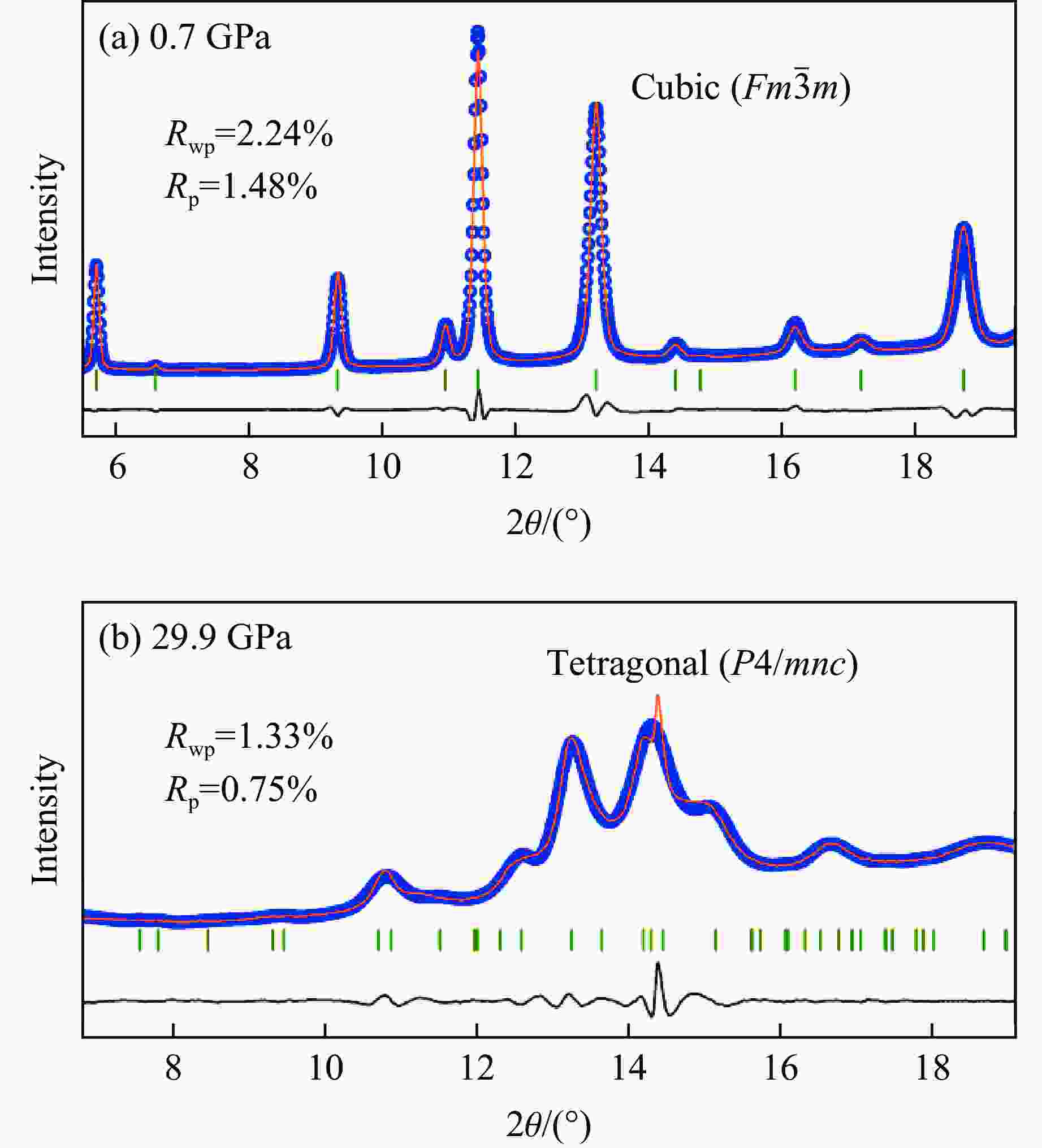图  Cs2TeBr6在0.7和29.9 GPa下的XRD谱Rietveld精修结果