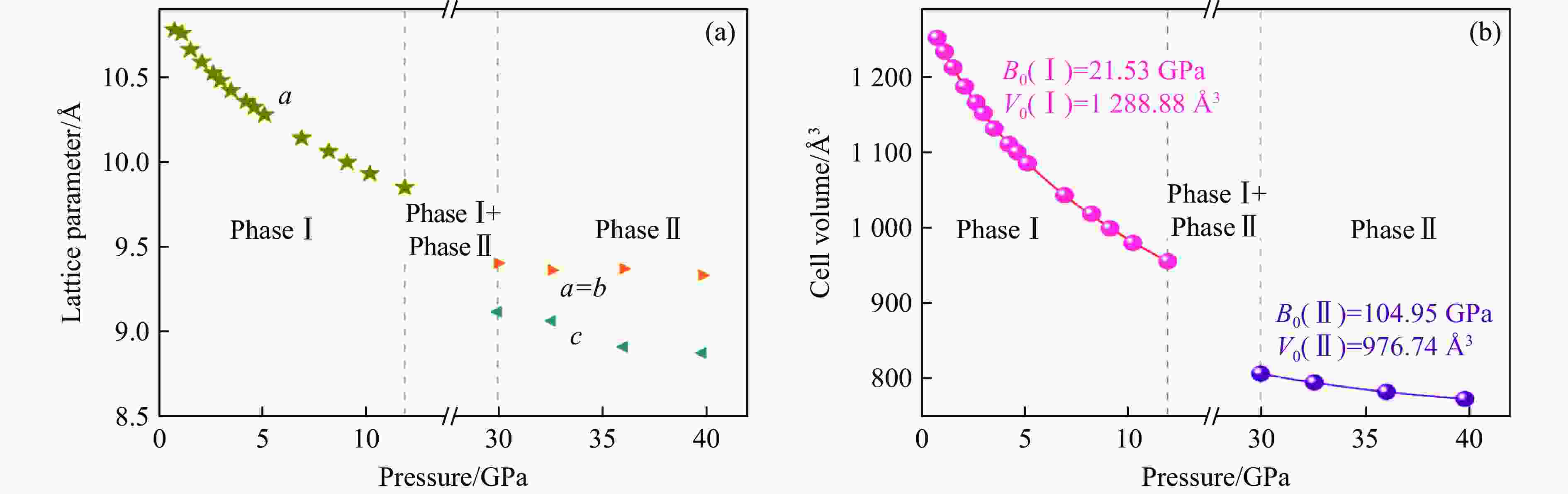 图  高压下Cs2TeBr6的晶格常数(a)和晶胞体积(b)随压力的变化曲线