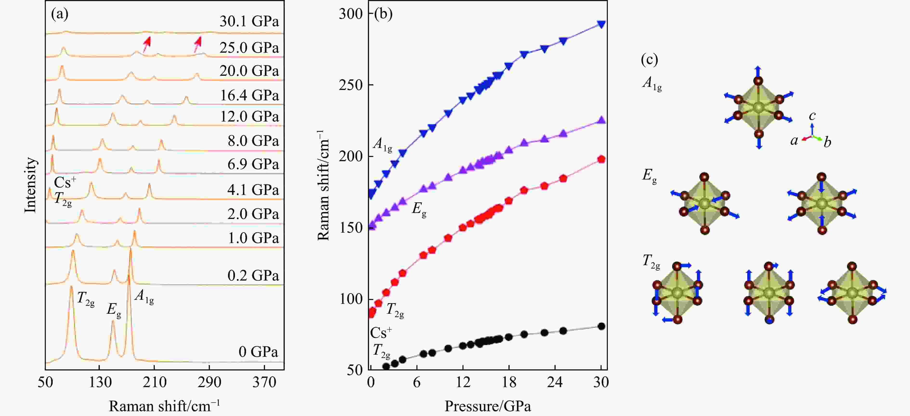 图  Cs2TeBr6的高压拉曼谱(a)、拉曼位移随压力的变化(b)以及拉曼振动模式(c)