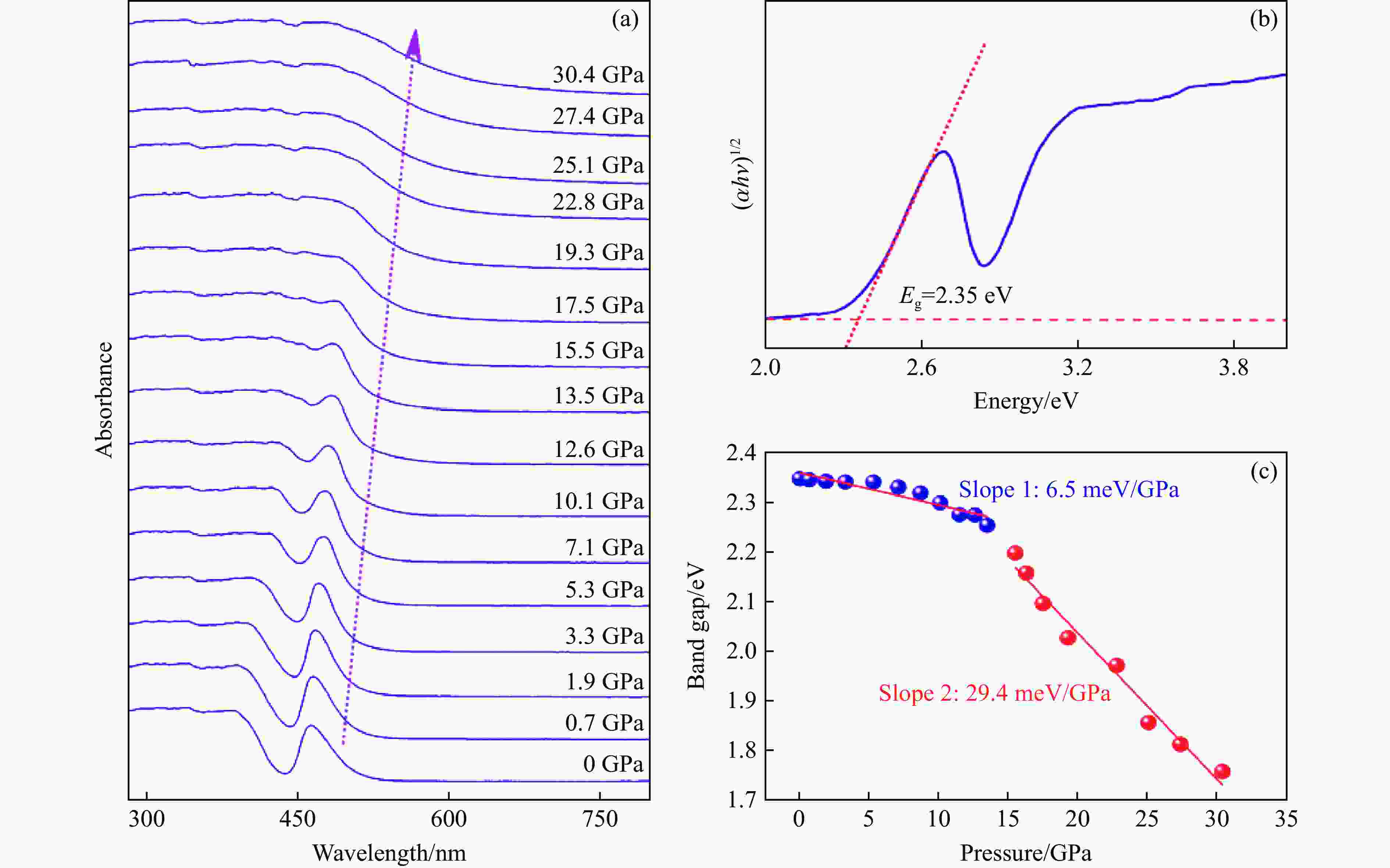 图  Cs2TeBr6在压力作用下的吸收光谱变化(a)、常压下的带隙(b)以及带隙与压力的变化关系(c)