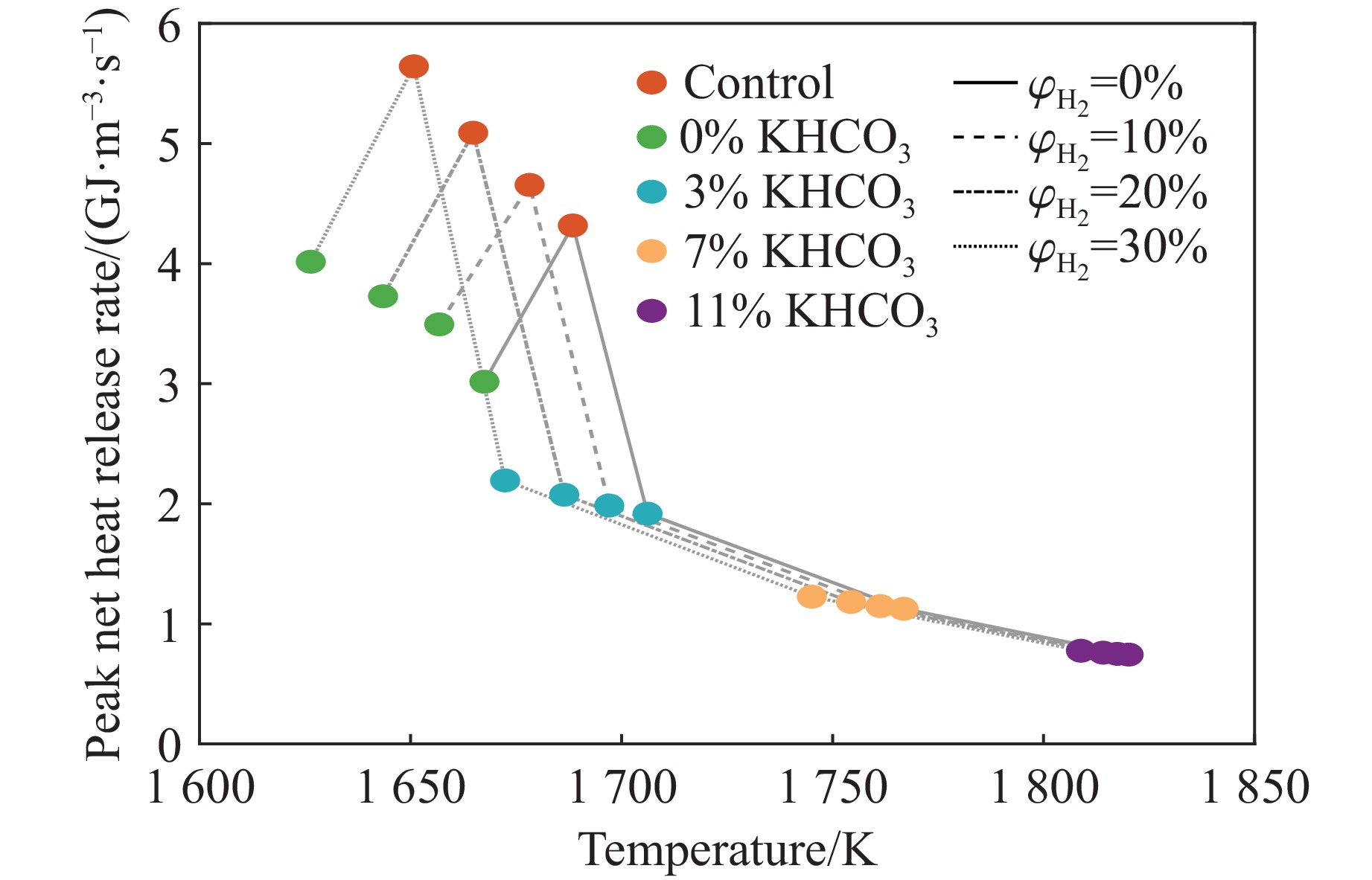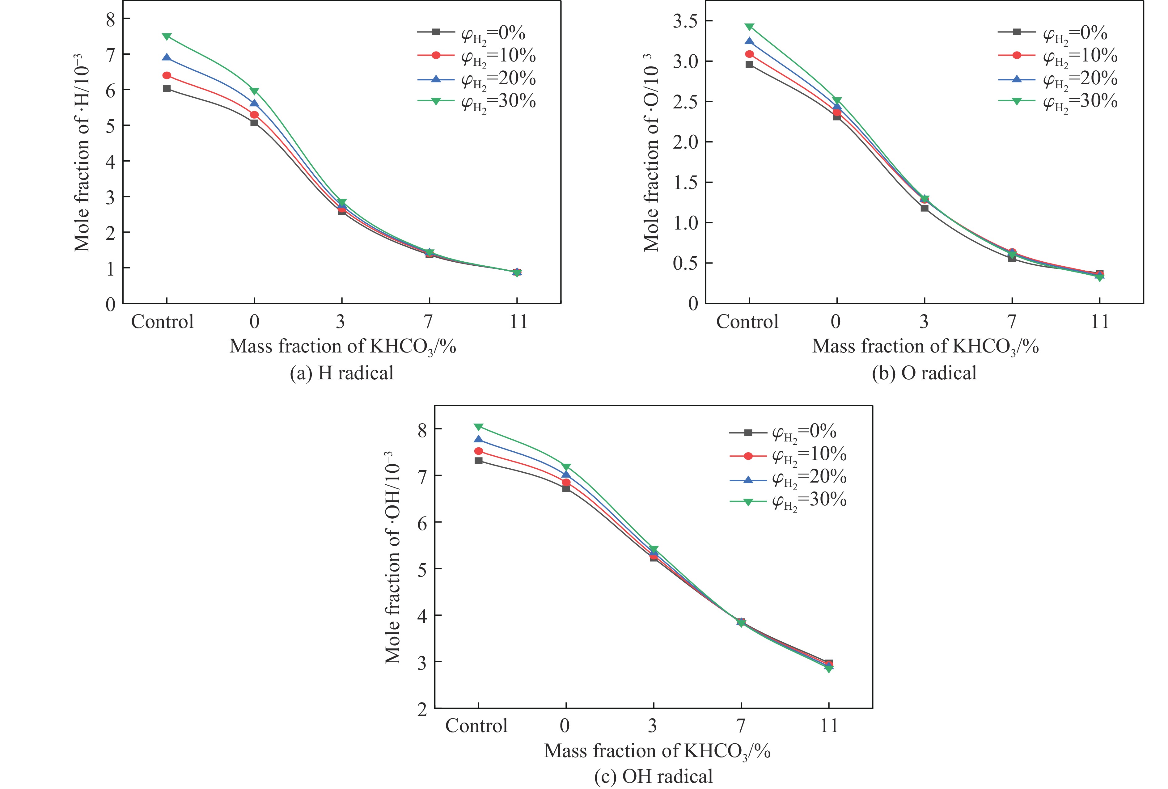 甲烷-氢气混合气体的爆炸防控技术是保障氢能安全应用的重要课题。通过实验与数值模拟相结合的方法,系统研究了含KHCO3细水雾对甲烷-氢气预混爆燃的抑制机理。结果表明,含KHCO3细水雾对甲烷-氢气预混爆燃具有显著抑制效果,且抑制性能与KHCO3的质量分数呈正相关。以氢气体积分数为10%的混合气体为例,与对照组相比,KHCO3的质量分数为11%时,峰值压力和平均压力上升速率分别降低34.64%和44.57%,层流燃烧速度最高下降66.43%。KHCO3兼具物理与化学双重抑制效应:物理上,雾滴相变吸热和蒸气稀释效应降低火焰温度并稀释可燃物;化学上,KHCO3分解产生的钾化合物通过KOH→K→KOH重组循环消耗关键自由基(·H、·O、·OH),与链分支反应形成竞争,中断燃烧链式反应。此外,抑制过程是抑制与促进效应的竞争。高掺氢比和高KHCO3质量分数下,物理蒸发效率成为限制化学抑制作用的瓶颈,导致抑制效率出现饱和现象,但整体上仍表现出显著的抑制效果。