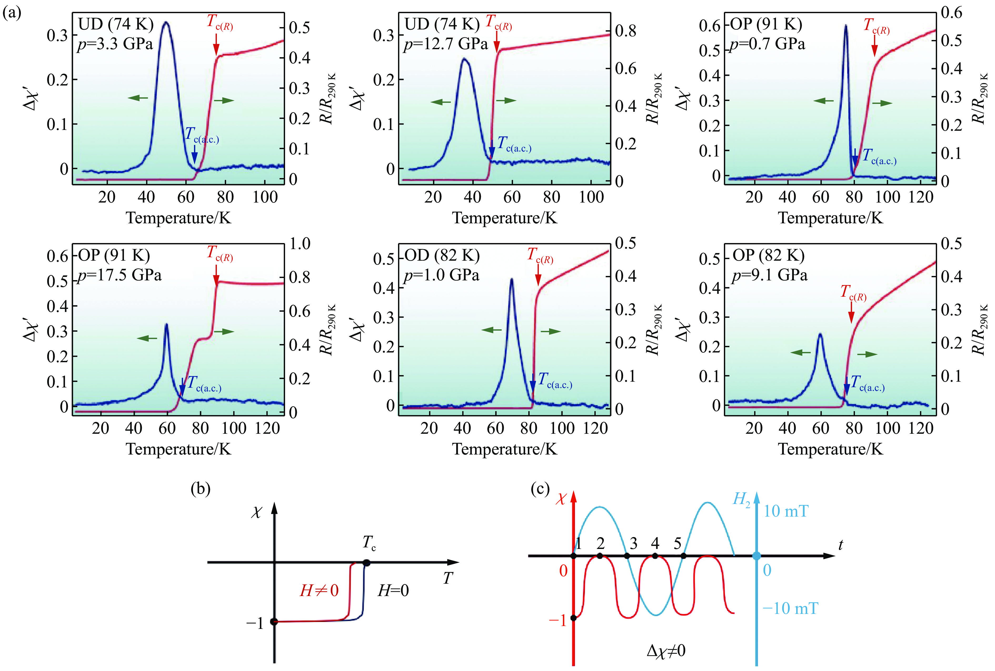 超导电性以零电阻行为和迈斯纳效应作为两个核心判据,样品在金刚石压砧的高压环境下,尺寸仅数十微米且空间受限,其磁性测量一直是高压研究中的难点。使用金刚石压砧进行高压下的磁性测量大致可以分为四种不同的方法,其中使用实验室内制作的多匝数微型线圈和两台串联锁相放大器的调制磁化率测量,由于其测量原理并没有被很好的理解,导致以往的文献中常呈现出自相矛盾实验结果。本文从实验构型和法拉第电磁感应定律出发,重新推导了超导样品的抗磁转变在一级和二级锁相放大器上信号大小的表达式。得到了引入调制磁场之后信号放大幅度的表达式,深入理解了调制磁化率的测量原理,指出了以往的文献中可能存在的问题。