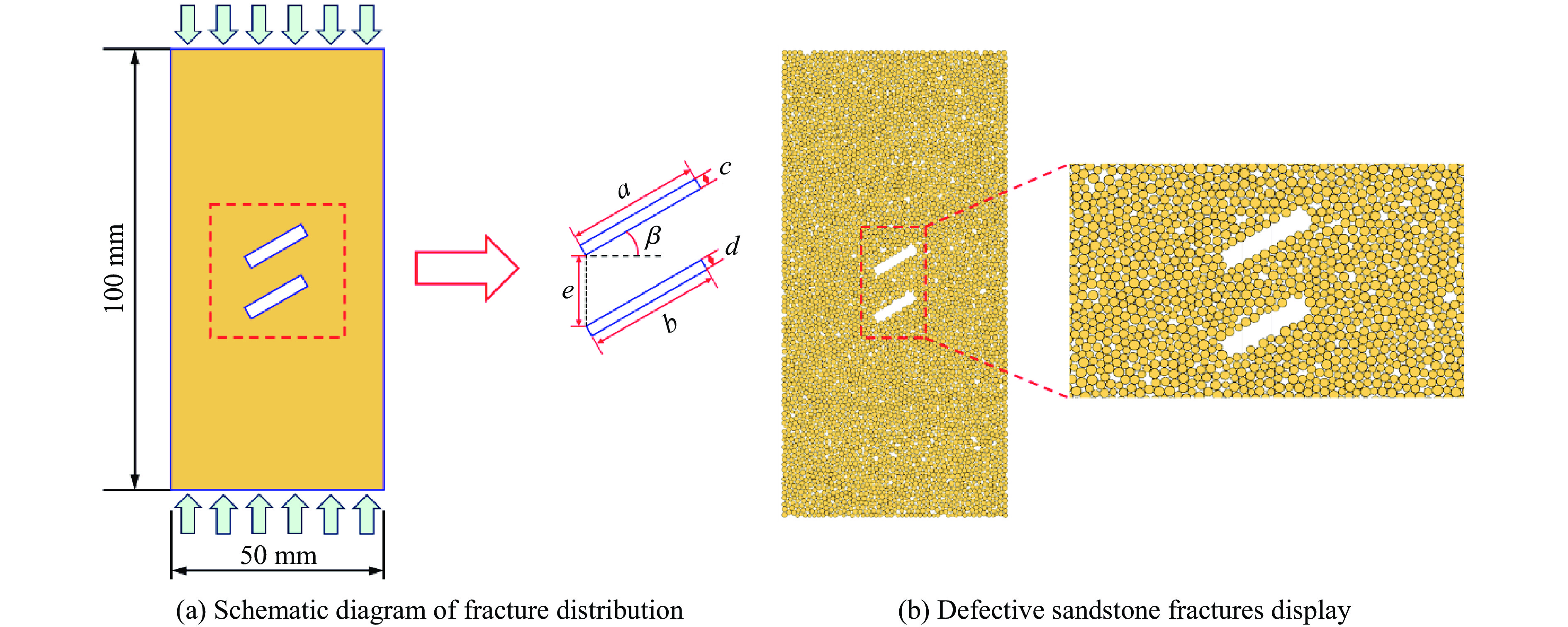 为探究单轴压缩下缺陷砂岩的能量演化和力学行为,通过离散元法数值模拟,分析了不同岩桥倾角和岩桥距离对缺陷砂岩的影响,结合能量耗散建立了损伤本构方程。结果表明:岩桥倾角和岩桥距离显著影响缺陷砂岩的力学响应和破坏机制,大倾角(60°、90°)促进裂纹沿最大主应力方向扩展,而小倾角(0°、30°)增加剪切裂纹比例,导致不同的破坏形态;弹性模量和抗压强度随岩桥倾角和岩桥距离的变化呈“U”形非线性特征。能量演化规律对岩桥倾角具有依赖性,总能量和耗散能量随岩桥倾角的增加先降低后升高,并在90°时达到最大。岩桥距离对能量的影响随岩桥倾角的变化而变化,当岩桥倾角小于45°时,能量随岩桥距离的增加而减少,当岩桥倾角大于45°时,能量随岩桥距离的增加先增加后减少。弹性能耗比的三阶段特征可作为缺陷砂岩失稳的预测指标。基于耗散能理论构建的能量耗散损伤本构模型能够准确地描述不同岩桥参数下缺陷砂岩的变形和破坏行为。该模型在实际工程中具有重要的应用潜力,但需要针对具体应力条件进行调整以优化预测准确性。研究结果可为岩土工程的灾害防治提供理论参考。