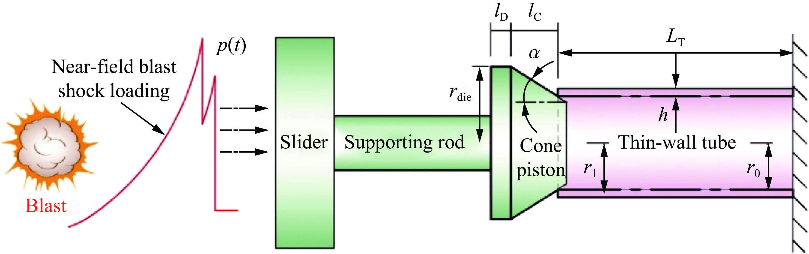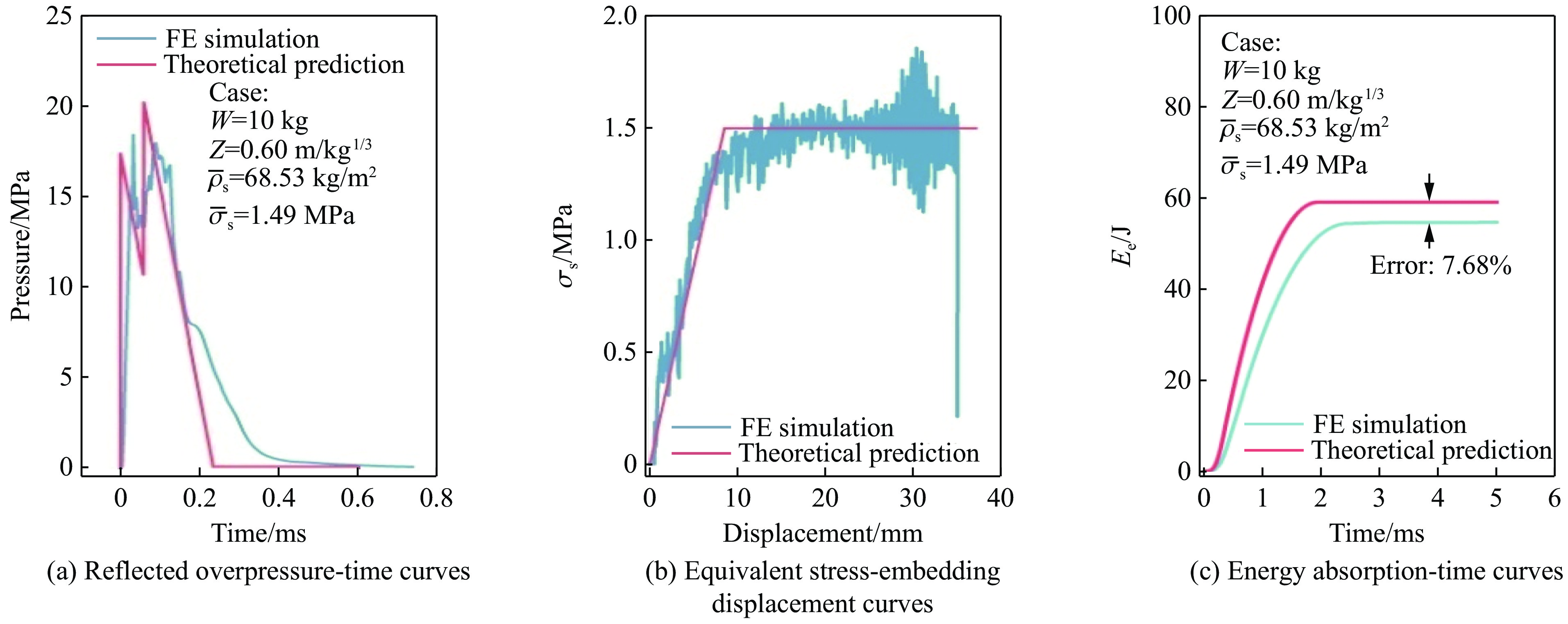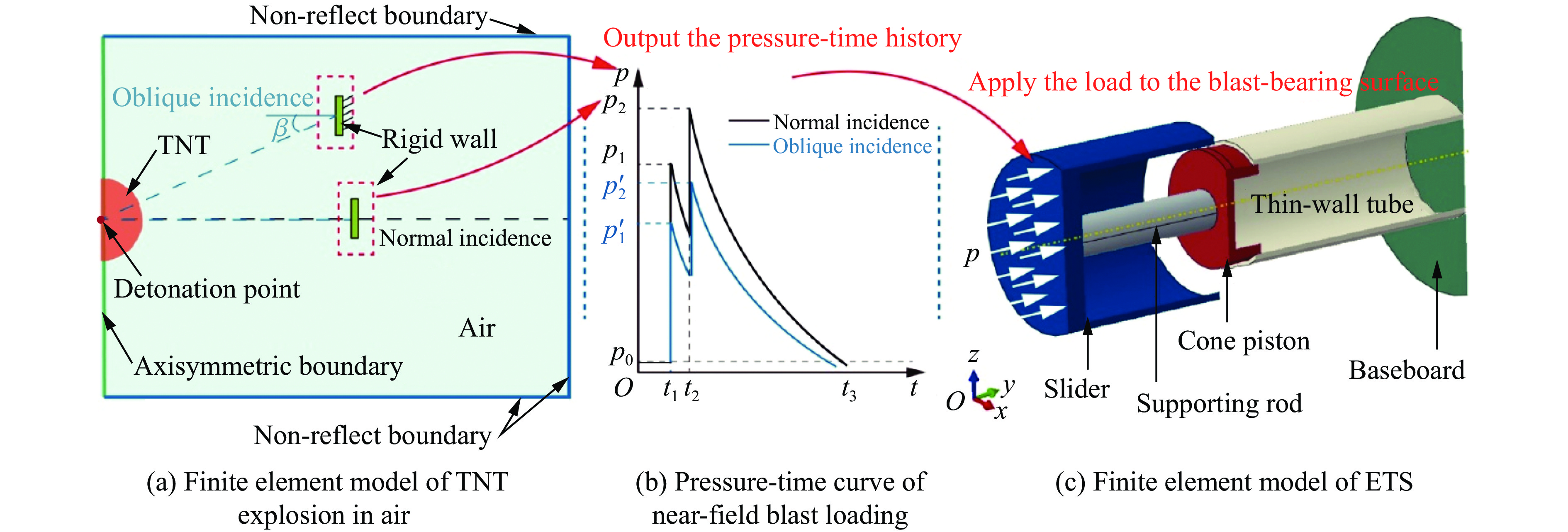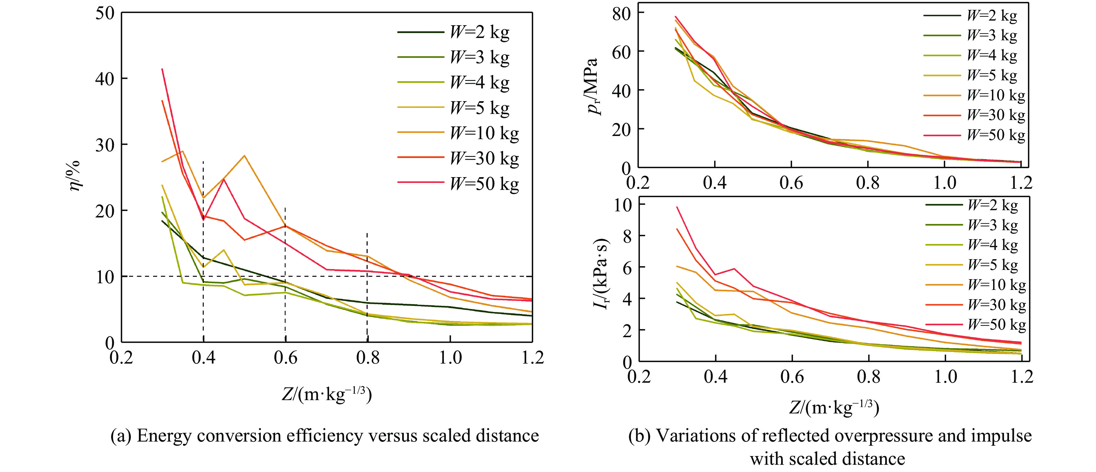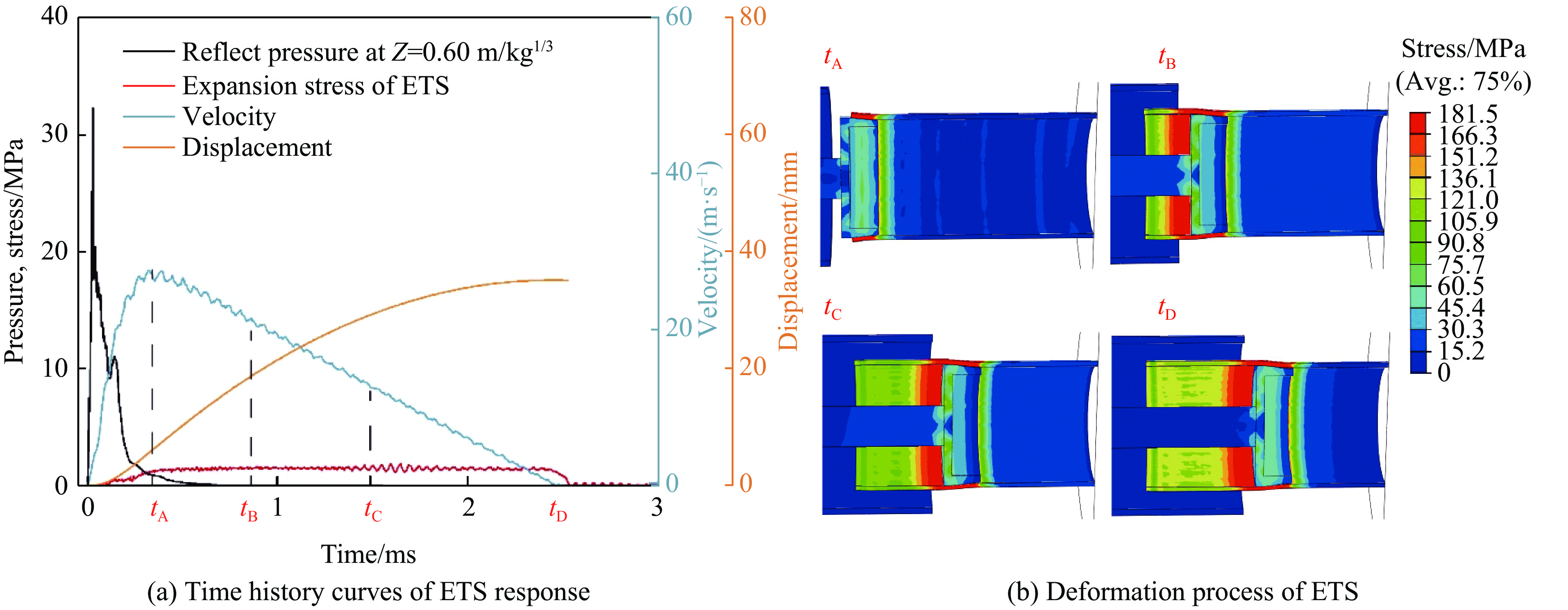 爆炸近场是弹药爆炸毁伤的核心区域,涉及强冲击波与爆轰产物的耦合载荷作用。目前,扩胀管结构(expansion tube structure, ETS)在此类极端载荷下的力学响应及能量转化机制尚不明确。为此,将ETS作为典型吸能结构,研究其在近场强冲击波与爆轰产物耦合作用下的能量转化机制。在试验验证的基础上,通过数值模拟方法研究近场爆炸载荷特性及ETS的动态响应特性,建立了近场爆炸载荷的理论预测公式,并在强冲击假设的基础上构建了能量转化效率的理论预测模型。结果表明:能量转化效率随着比例距离的增加而显著下降,当比例距离超过0.80 m/kg1/3时,能量转化效率低于10%;能量转化效率与反射波比冲量呈显著正相关,说明比冲量是决定能量传递的关键因素。研究结果揭示了ETS在近场爆炸载荷作用下能量转化的内在机制,所建立的理论模型为近场防护结构设计与性能评估提供了有力的理论支撑。