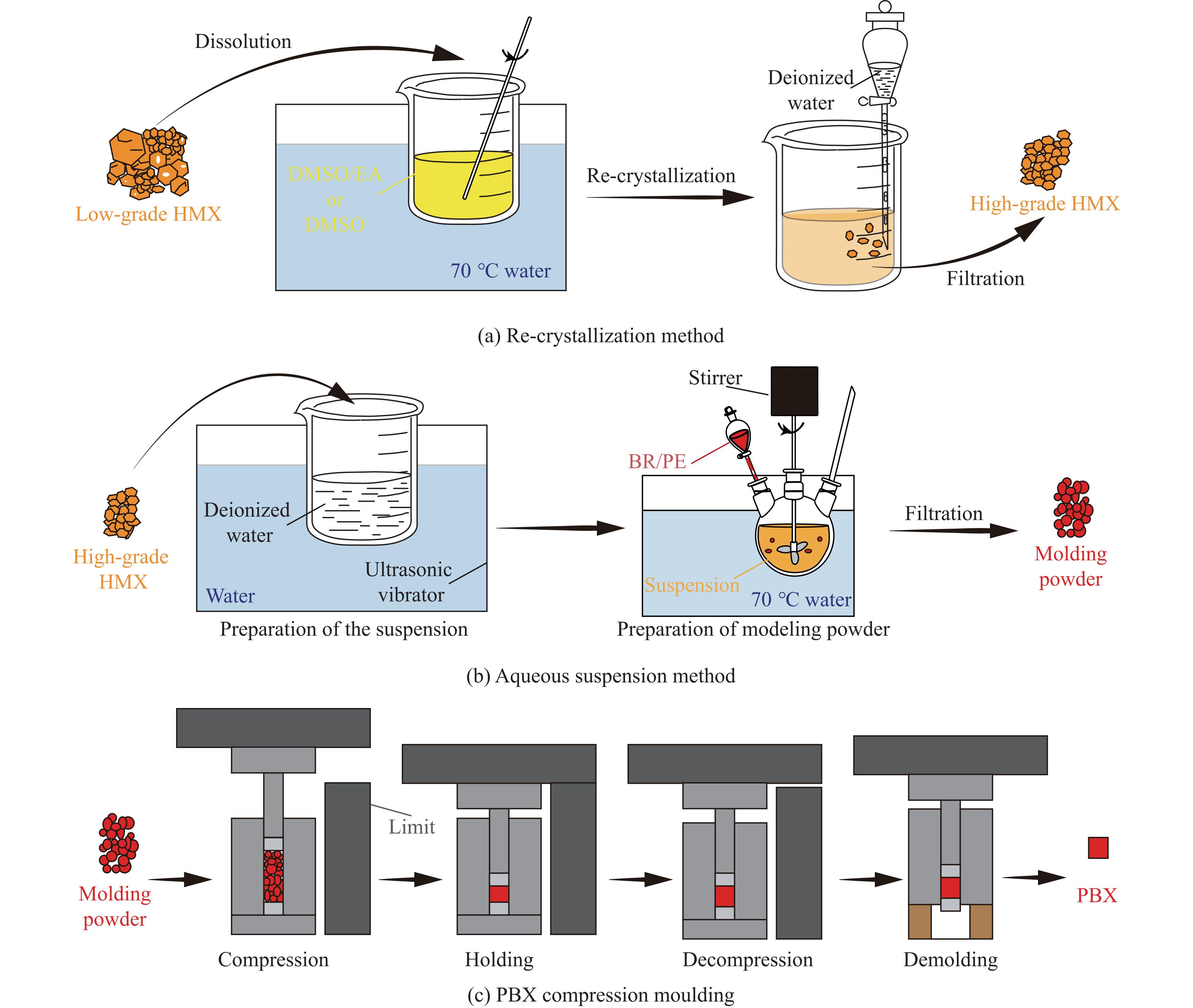 粉末压制技术是高聚物黏结炸药(polymer bonded explosives,PBX)的常用制备工艺,其工艺参数对成型PBX材料的微观结构和力学性能具有重要影响。系统地探讨了制备工艺参数对成型药柱微细观结构及其压缩力学性能的影响。首先,采用不同的压制参数,即压制速率、孔隙率、温度和颗粒级配,制备了6种圆柱形PBX样品,通过扫描电子显微镜和计算机断层扫描获取了样品的初始微细观结构信息。然后,在宽应变率范围内(0.0003~7000 s-1)对PBX试样开展一维应力压缩实验,获取其应力-应变响应,并基于ZWT本构模型构建了PBX样品的率相关非线性本构模型。最后,对准静态压缩后的回收样品进行扫描电镜成像表征,观察和归纳其变形与损伤机制(晶内/晶间断裂和界面脱黏)。研究结果系统性地揭示了PBX材料的“压装工艺参数-微观结构特征-宏观力学性能”三者之间的映射关系与规律,为PBX材料的构效关系研究提供了丰富的结构特征和力学响应数据,构建了非线性力学本构模型,对PBX材料的生产工艺优化和力学性能评估具有指导意义。