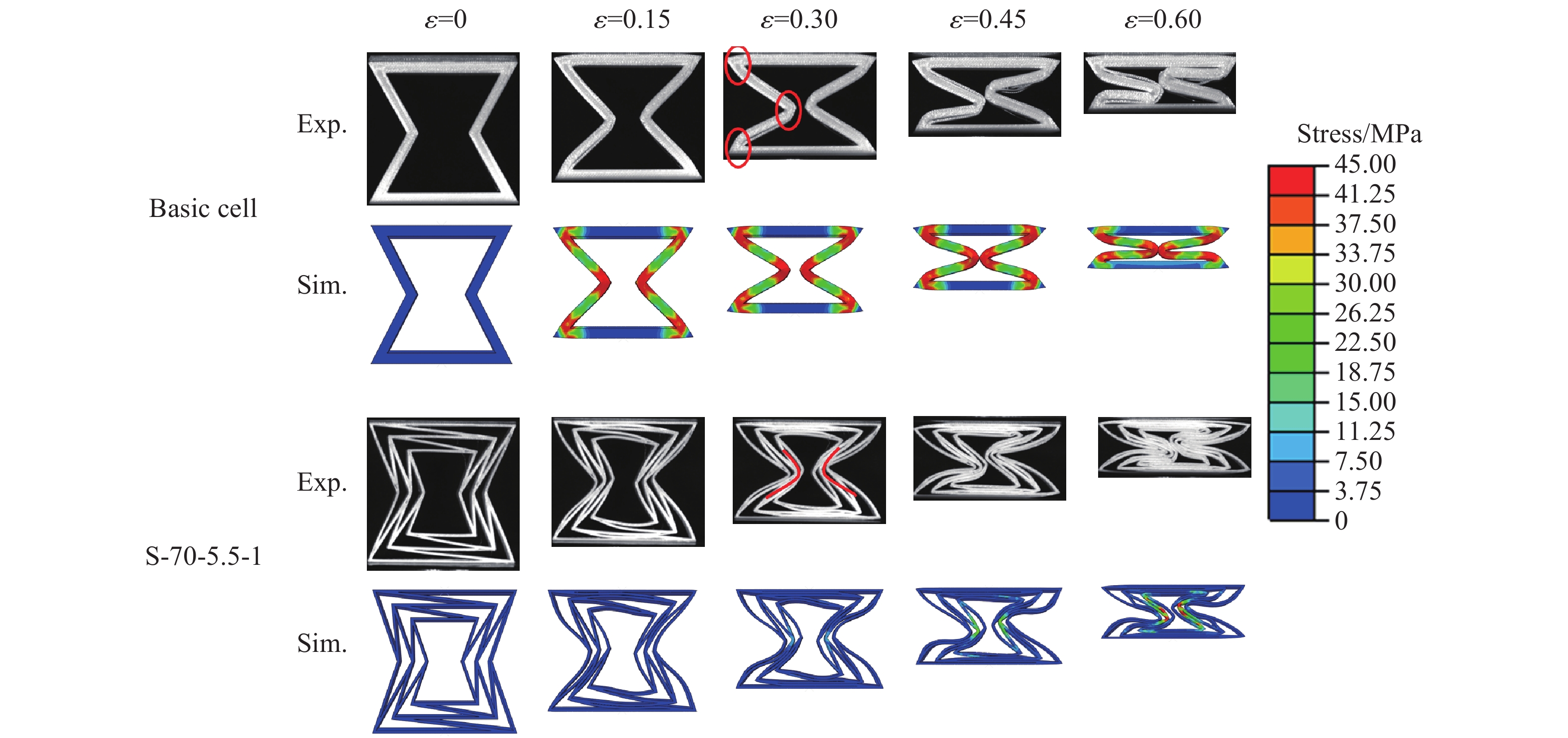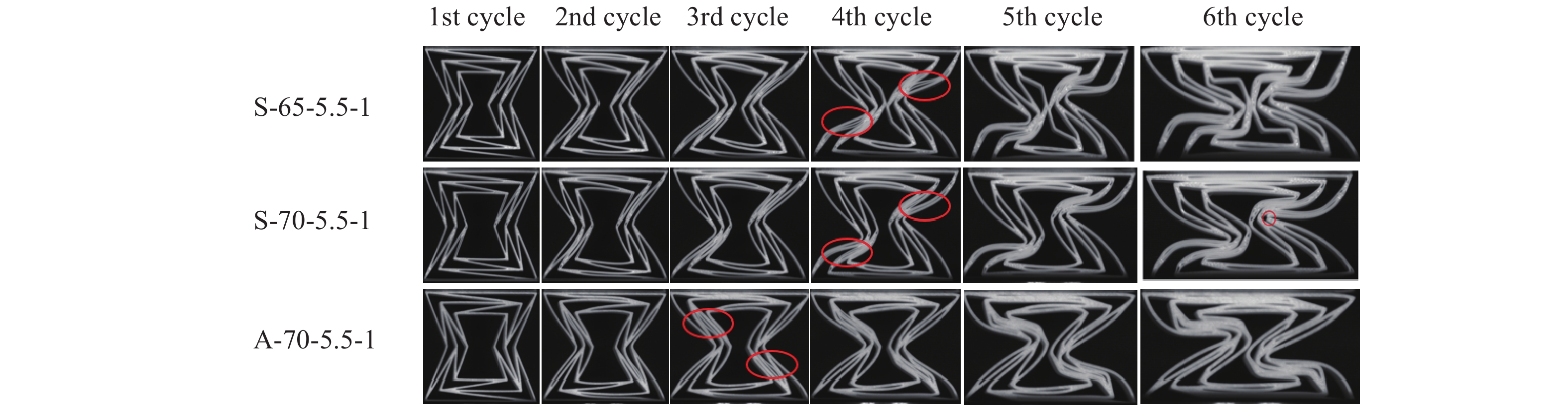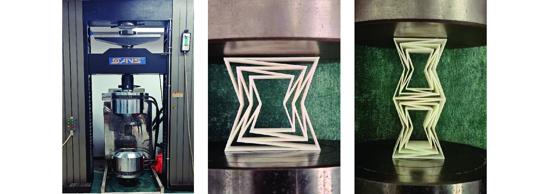 采用准静态单轴压缩实验、循环压缩实验和有限元数值模拟,对不同角度、间距和连接方式的多层嵌套内凹六边形单胞结构及其串联结构的变形行为和吸能特性进行分析。结果表明:多层嵌套结构多发生剪切变形,应力小且多集中在斜杆连接处;角度更大、间距更小的交替方式连接的单胞结构拥有更长的平台期;负泊松比单胞结构且角度为65°的试件吸能表现更优异,且同向连接以及间距增大有助于吸能的提升;角度和间距对串联结构平台期的影响与单胞结构相同,连接方式的影响则相反;角度和间距增大、连接方式改变与吸能成正反馈;在循环压缩实验下,试件更易发生分层破坏和塑性断裂,多出现在二次循环后,并伴随应力软化和能量耗散行为,其效果随着循环次数的增加而加重。
