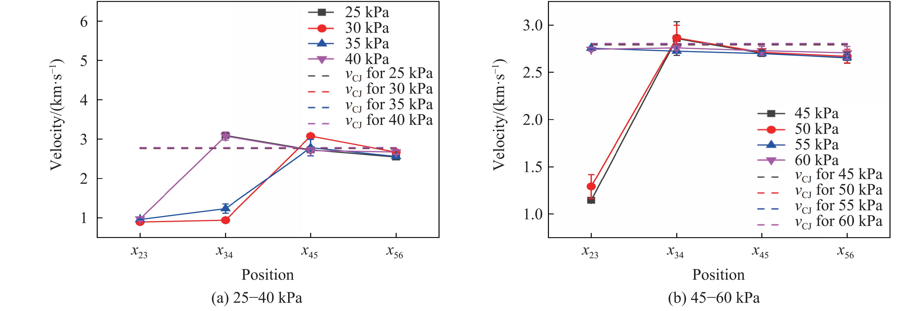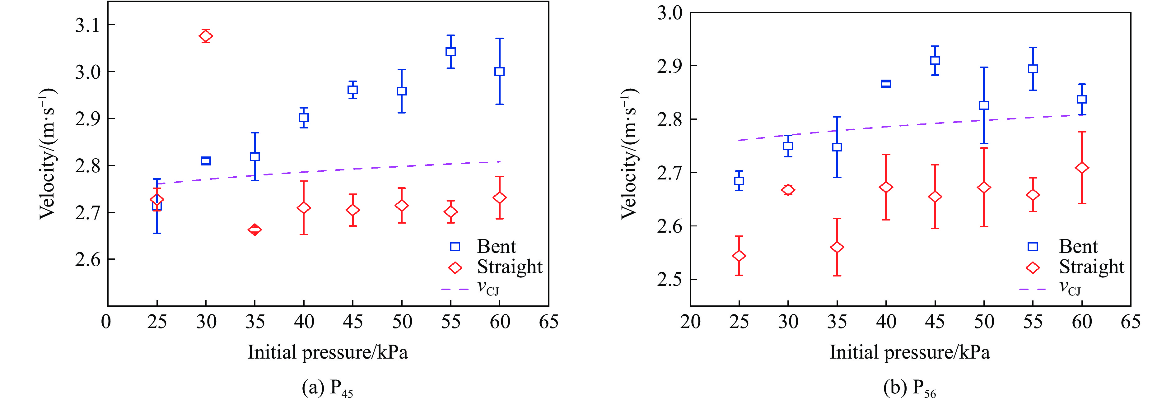对不同初始压力下氢氧爆轰波在含阵列障碍物弯管中的传播行为进行实验研究,并选用一个相同配置的直管作为对照组。弯管为半圆形的方形截面管,障碍物的形状为长方形,阻塞率为40%。通过压力监测及烟熏箔记录发现,爆轰波形成后在障碍物间的传播过程分为5个阶段,即不规则胞格区、无胞格区、细密胞格区、过渡区和正常胞格区。其中,弯管中的爆轰波在越过障碍物发生衍射后并未立刻解耦,而是在与底壁正向撞击形成不规则胞格后受稀疏波的作用经历短暂解耦失效,随后在外壁处形成平面过驱爆轰波,并向内壁处逐渐扩展,最后,过驱爆轰逐渐衰减为稳定爆轰。而在直管中,初始压力降低时,爆轰波越过障碍物发生衍射后出现了部分解耦,在障碍物后首先形成一个无胞格区,然后才出现上述5个阶段。此外,在稳定爆轰阶段,弯管中的爆轰胞格宽度从内壁到外壁逐渐降低,并大致呈线性分布。相应初始压力下,爆轰数据库中的胞格宽度更接近弯管中内壁处的胞格宽度。直管中的胞格宽度与爆轰数据库中的数据吻合良好。