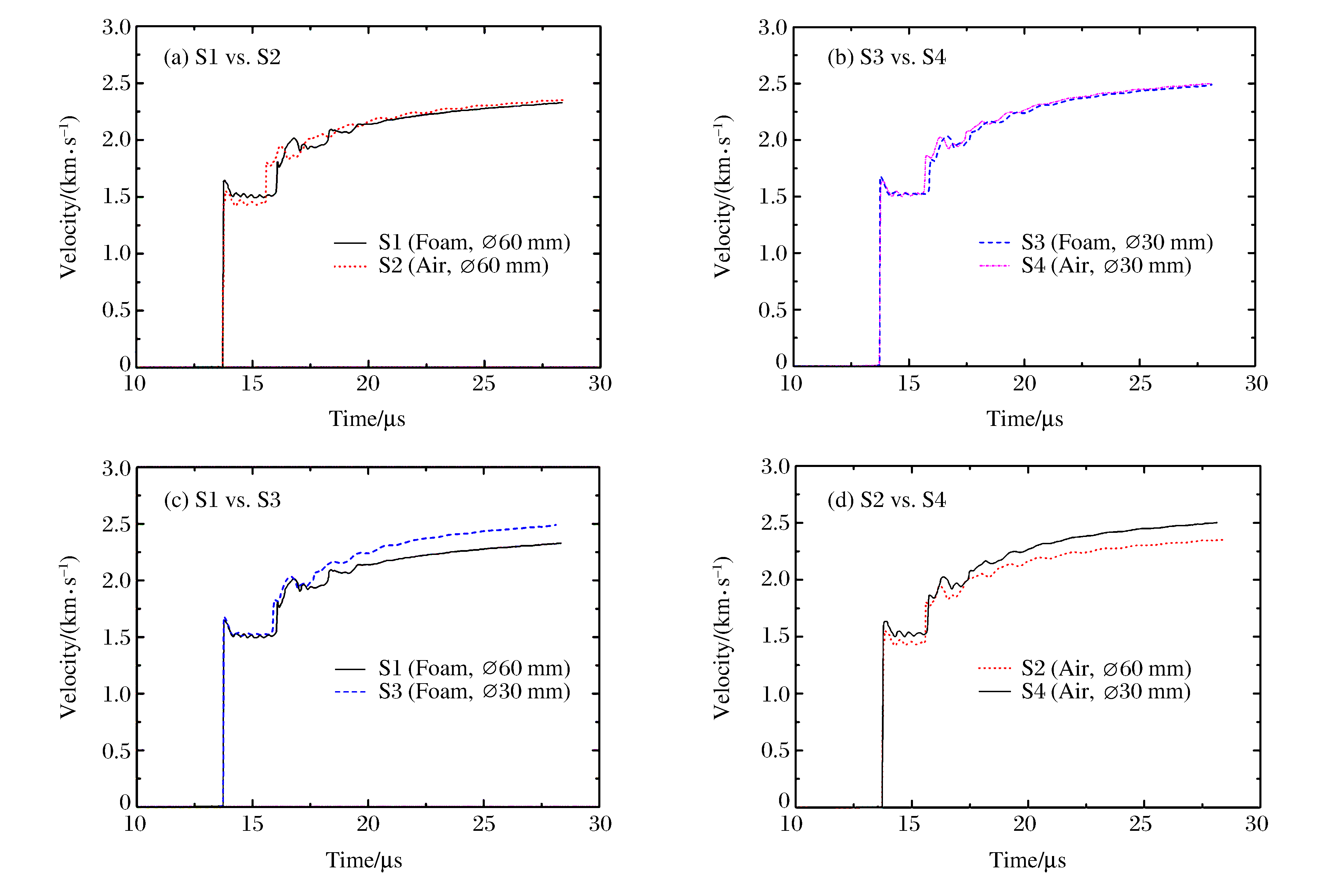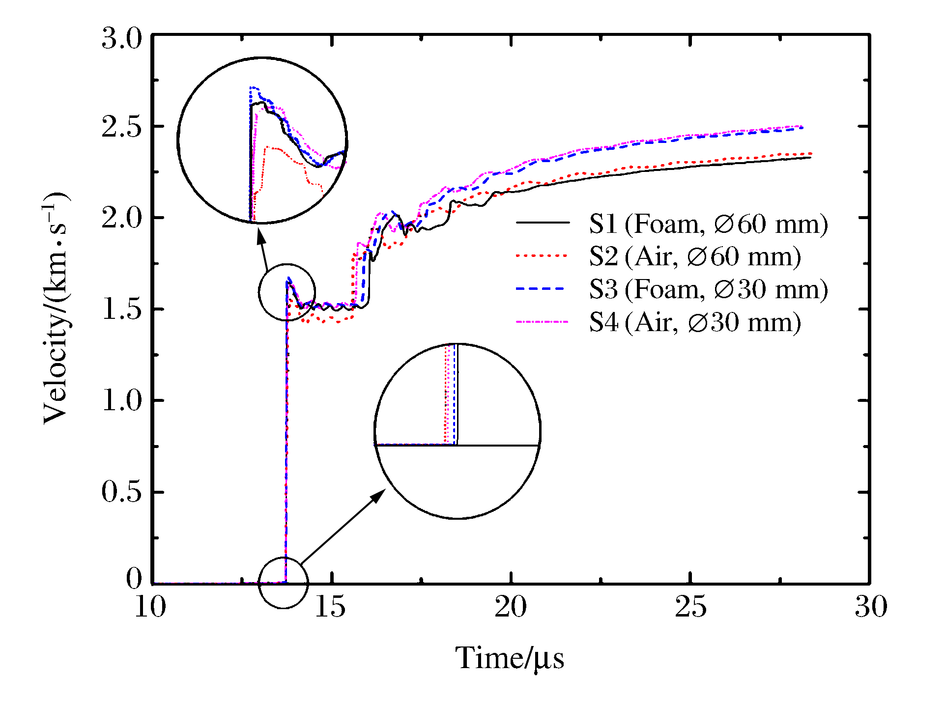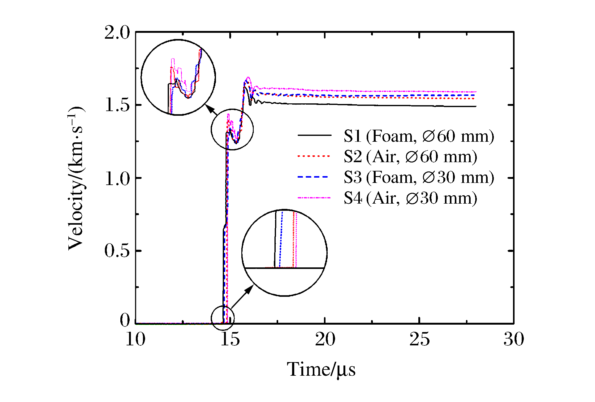 Probe Location of test point t0/μs v1/(m·s-1) v2/(m·s-1) S1 Foam cushion, Ø60 mm 13.619 1 640 2 277 S2 Air clearance, Ø60 mm 13.589 1 447 2 303 S3 Foam cushion, Ø30 mm 13.631 1 679 2 434 S4 Air clearance, Ø30 mm 13.605 1 510 2 450 表 2 炸药爆轰驱动双层飞片实验结果