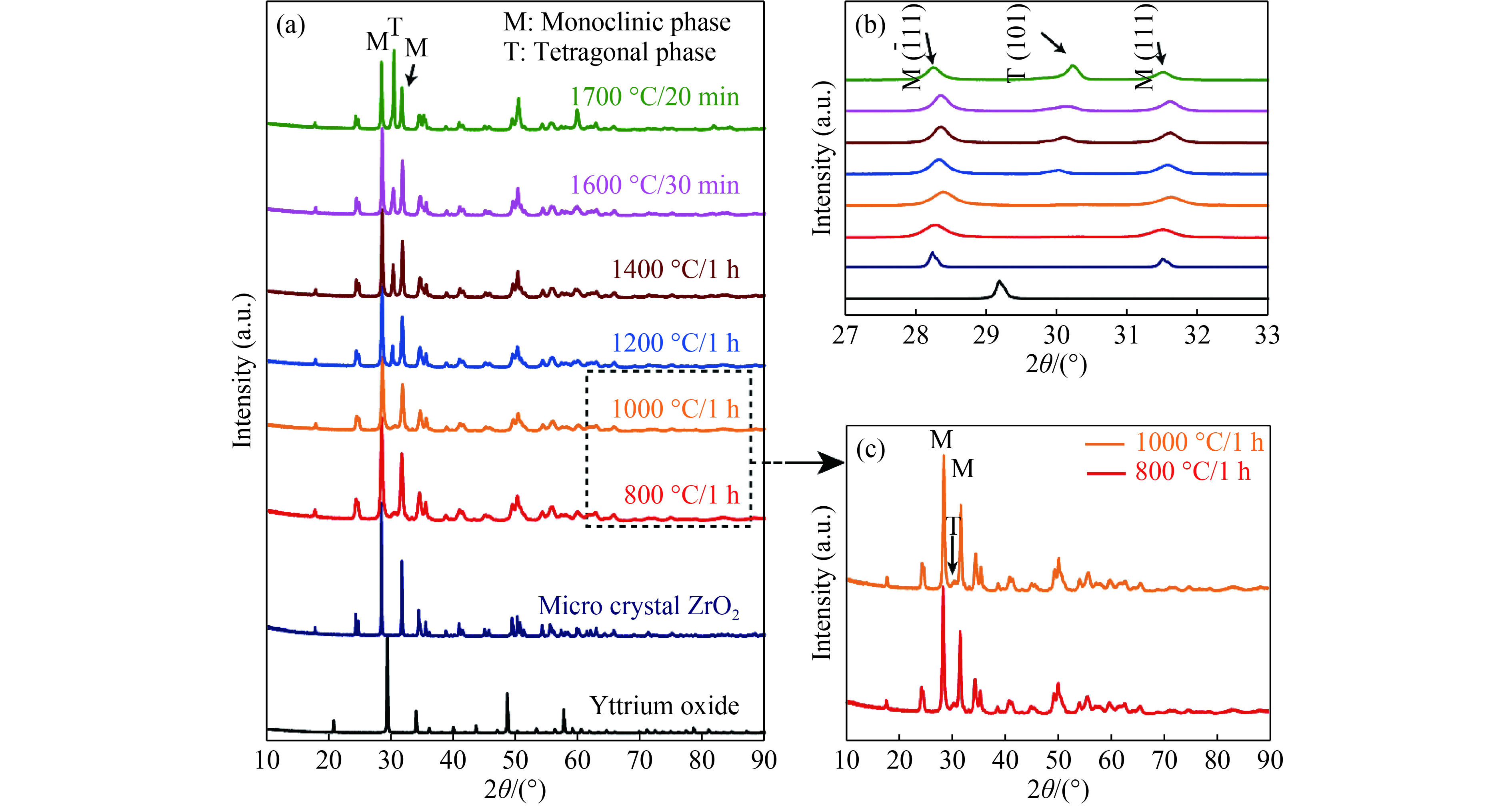 Figure  4.  (a) XRD pattern of samples sintered at 5.5 GPa and different temperatures; (b) magnified range of the characteristic diffraction peaks of monoclinic and tetragonal phases from (a); (c) XRD patterns of samples sintered at 800 and 1000 ℃ marked with dotted line in (a)