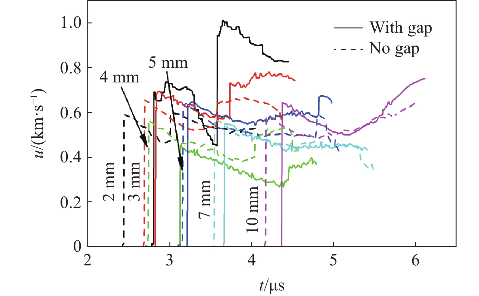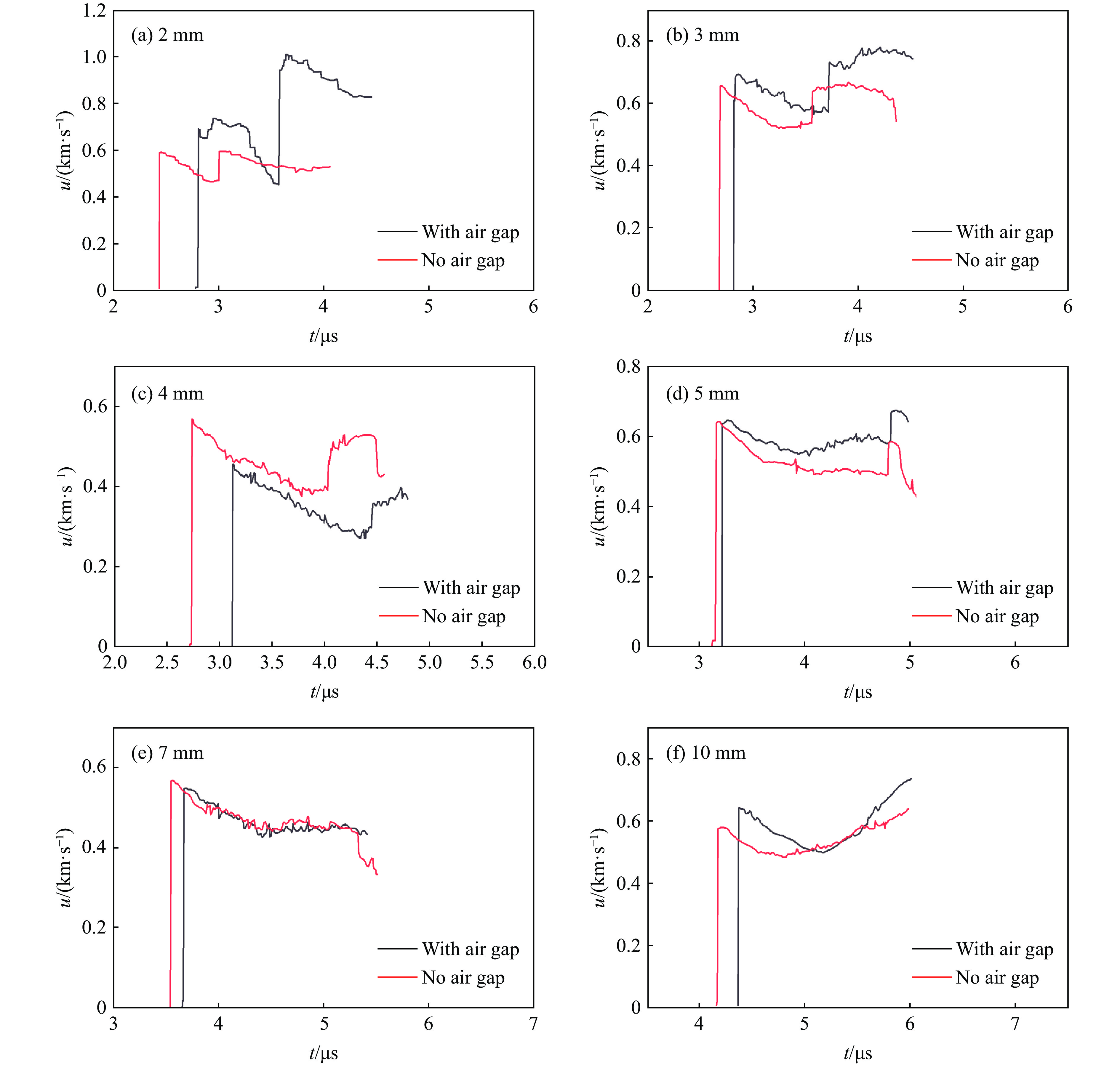 $\varnothing $ 50 mm × 30 mm的A型炸药,产生的冲击波通过空气间隙和金属隔层起爆$\varnothing $ 50 mm的台阶型B型炸药。在B型炸药的后界面粘贴镀膜氟化锂(LiF)窗口,使用光子多普勒测速仪(PDV)测量金属和B型炸药的后界面速度,进而计算得到金属和B型炸药的冲击波透射压力,再利用阻抗匹配计算得到金属和B型炸药的入射压力。结果表明:传爆药和金属隔层间的空气间隙使冲击压缩过程转变为准等熵压缩和冲击压缩两个过程,同时使冲击波的幅值减小;确定了金属隔层厚度为5 mm时冲击波压力的衰减范围;当使用A型炸药作为传爆药,空气间隙为0.3 mm,金属隔层厚度为5 mm时,B型炸药在7~10 mm之间开始反应。-