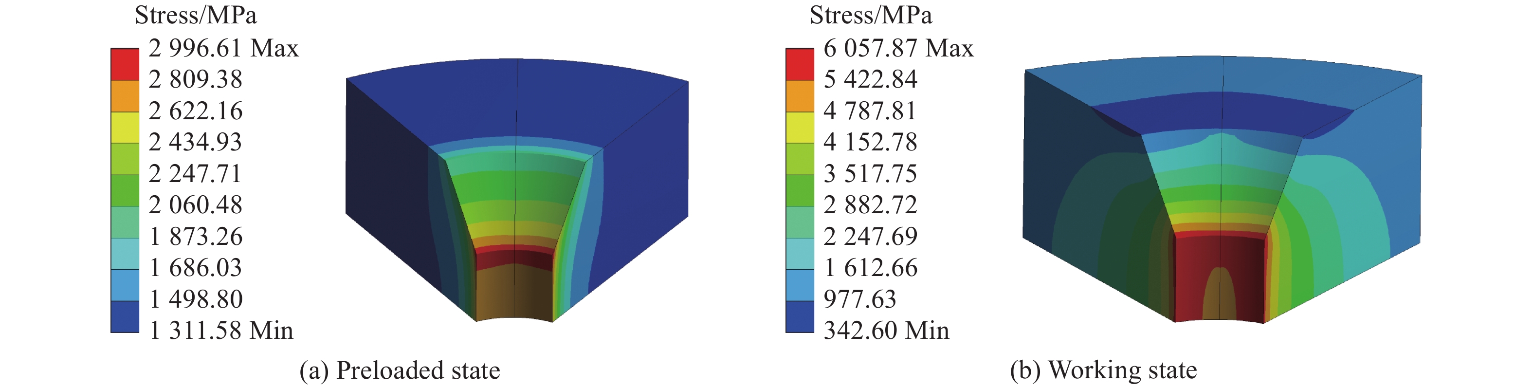 摘要: 介绍了一种使用钢环和碳纤维复合材料环共同预紧方式的两面顶超高压模具,该结构在全钢环两面顶模具的基础上,使用一层碳纤维复合材料环代替最外层钢环,得到了一种具有碳纤维复合材料环的超高压模具。这种设计避免了大直径钢环难以制造加工的问题,形成一种以钢环与复合材料环共同对压缸预紧的新型预紧方式。数值分析表明:该模具结构设计具有可行性,可以在一定程度上减小压缸的周向应力、最大剪切应力和等效应力。此外,对碳纤维复合材料环进行了失效判别。Abstract: Our work introduces a double-sided top ultra-high pressure die with a steel ring and a carbon fiber composite ring preloading together. Compared with the double-sided top die of the full steel ring, a layer of carbon fiber composite material ring instead of the outermost steel ring is used in this new structure, which overcomes the challenges of manufacturing and processing large-diameter steel rings and makes a new mutual pre-tightening method, in which steel rings and composite material rings are used to pre-tighten the cylinder. Based on the numerical analysis, the mold structure is proved feasible, and it is further indicated that this structure can reduce the circumferential stress, maximum shear stress and equivalent stress of the cylinder to a certain extent. In addition, the failure of the carbon fiber composite ring is also identified in this work.