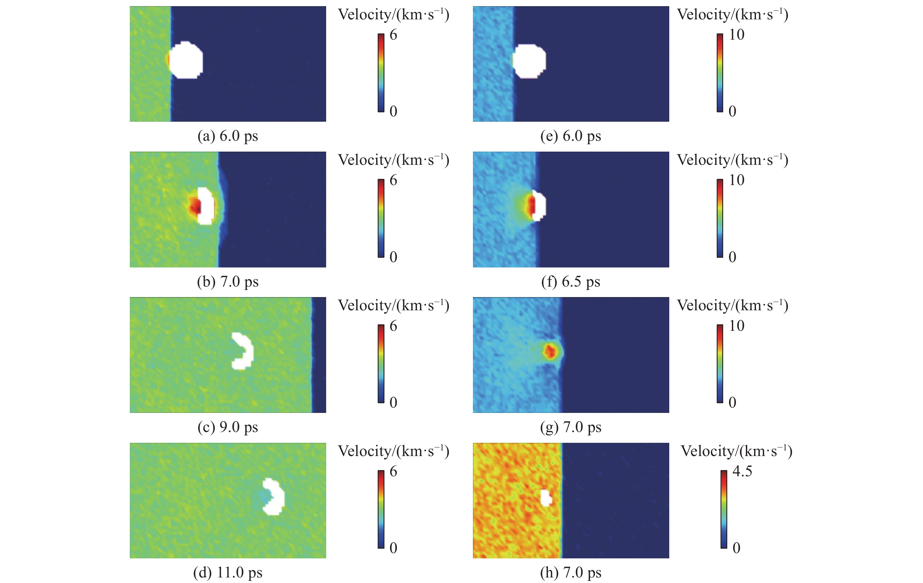 Figure 7. Snapshots of velocity maps along the shock direction under the loading condition of 3 km/s: (a)–(d), (e)–(g), and (h) represent the He bubble with r = 3.0 nm, the void with r = 3.0 nm, and the He bubble with r = 1.5 nm in the initial samples, respectively[53]