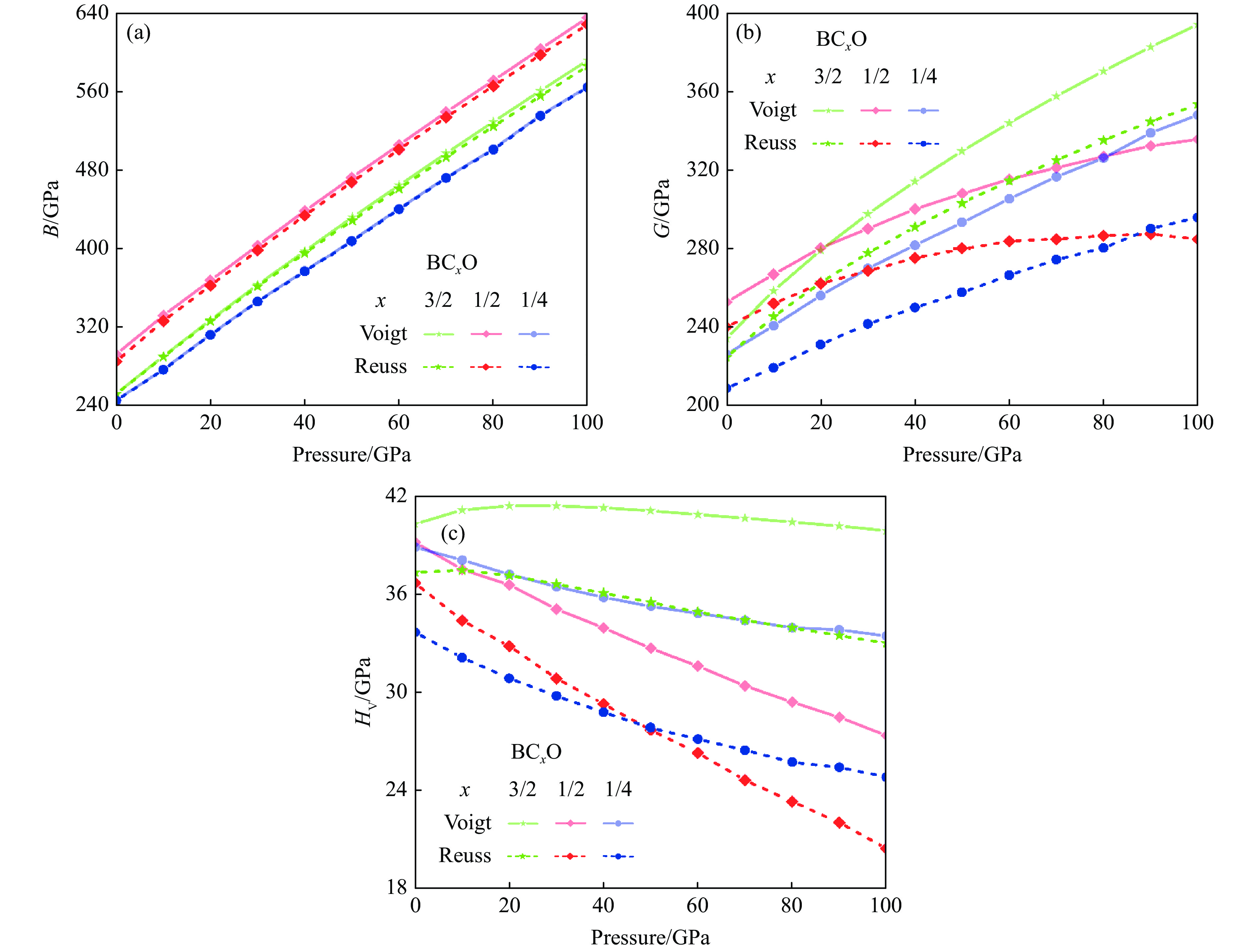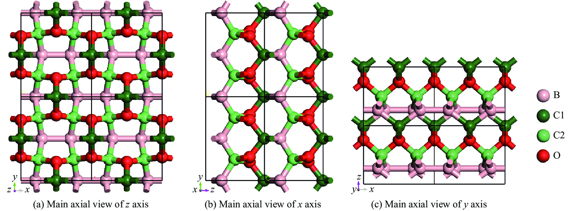 摘要: 结合粒子群优化算法生成的候选结构和第一性原理的稳定性分析,预测出新型B-C-O化合物B4C6O4。B4C6O4具有带隙宽度约2.25 eV的直接带隙半导体属性。研究同属BCxO系列,且结构具有相似性的B4C6O4、B2CO2和B4CO4,发现C含量的降低会导致体系带隙增大,三者的分子式体积随C含量的降低而降低,且100 GPa的高压对三者体积均形成高达20%的压缩。高压导致B2CO2和B4C6O4的带隙持续降低,而B4CO4的带隙先升后降。应力-应变模拟结果表明,3种BCxO(x = 3/2, 1/2, 1/4)化合物均具有较高的极限拉伸应力,同时应力引起的应变会影响3种BCxO化合物的带隙。力学性能研究表明,3种BCxO化合物均具有高弹性模量和高硬度等特点。常压下BCxO的最高声子振动频率均高于30 THz,且由高到低分别为B4CO4、B2CO2、B4C6O4,压力作用使该体系结构的键能持续增强。Abstract: A novel B-C-O compound, B4C6O4, was predicted by combining the candidate structure generated by the particle swarm optimization algorithm and first-principles stability analysis. B4C6O4 has a direct bandgap semiconductivity characteristic with a bandgap width of about 2.25 eV. B4C6O4, B2CO2 and B4CO4 have similar structures and belong to the BCxO series. It was found that the decrease of carbon content led to the increase of the band gap of the system, and the molecular formula volume decreased synchronically with the decrease of carbon content, and the high pressure of 100 GPa compressed the volume of the three as high as 20%. The band gaps of B2CO2 and B4C6O4 continue to decrease due to the effect of high pressure, while the band gap of B4CO4 rise first and then fall. The stress-strain simulation results showed that the three BCxO compounds (x = 3/2, 1/2, 1/4) all have high ultimate tensile stress, and the strain would affect the band gaps of the three BCxO compounds. The mechanical properties of three BCxO compounds showed that they all had high modulus of elasticity and hardness. The highest phonon vibration frequencies of BCxO under chamber pressure are higher than 30 THz, and the relationship is B4CO4 > B2CO2 > B4C6O4. The effect of high pressure will cause the continuous enhancement of the bond energy of the system.