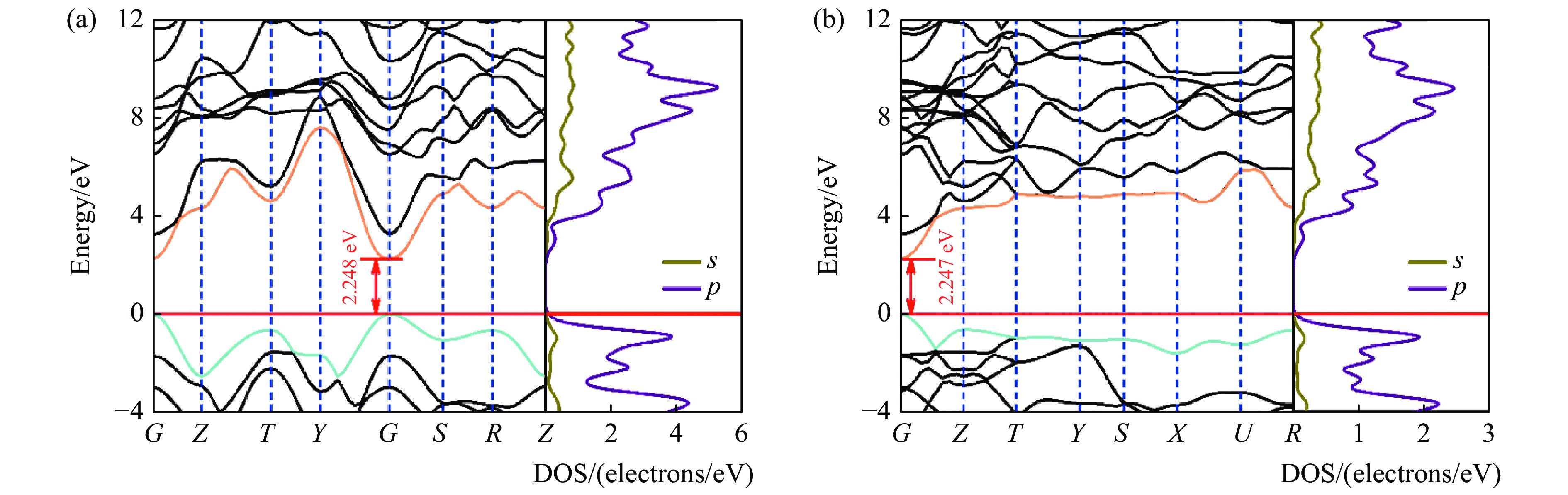 图 4 基于HSE06计算得到的常压下B4C6O4的电子能带结构和态密度:(a)原胞,(b)单胞(水平红线、暗青色曲线和金色曲线分别代表费米能级、VBM和CBM)