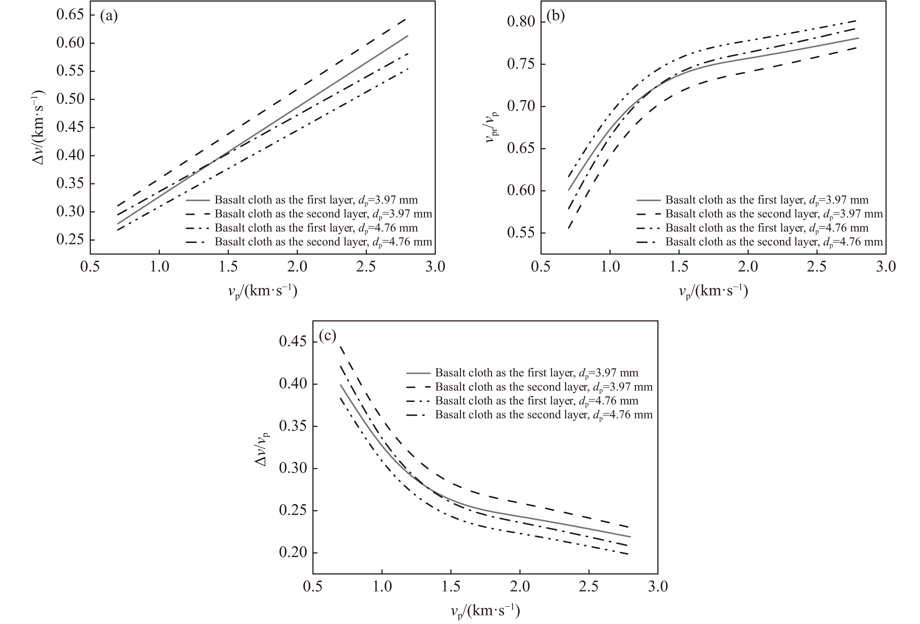 No. vp/(km·s−1) Rear wall damage ABA-1 1.49 No perforation, bulge ABA-2 1.68 No perforation, crack ABA-3 1.70 Material spalling, perforation ABA-4 1.74 Material spalling, perforation ABA-5 1.98 Central perforation ABA-6 2.72 Central perforation ABA-7 2.98 Central perforation ABA-8 3.65 No perforation, central cluster of craters BAA-1 1.51 No perforation, bulge BAA-2 1.71 Central perforation BAA-3 1.96 Central perforation BAA-4 2.18 Central perforation BAA-5 2.76 Central perforation BAA-6 3.30 Central perforation BAA-7 3.53 Central perforation AAA-1 1.52 No perforation, bulge AAA-2 1.79 Central perforation AAA-3 2.32 Central perforation WAA-1 1.53 No perforation, bulge WAA-2 1.66 Central perforation WAA-3 2.08 Central perforation 表 2 弹道极限速度的计算值和实验结果