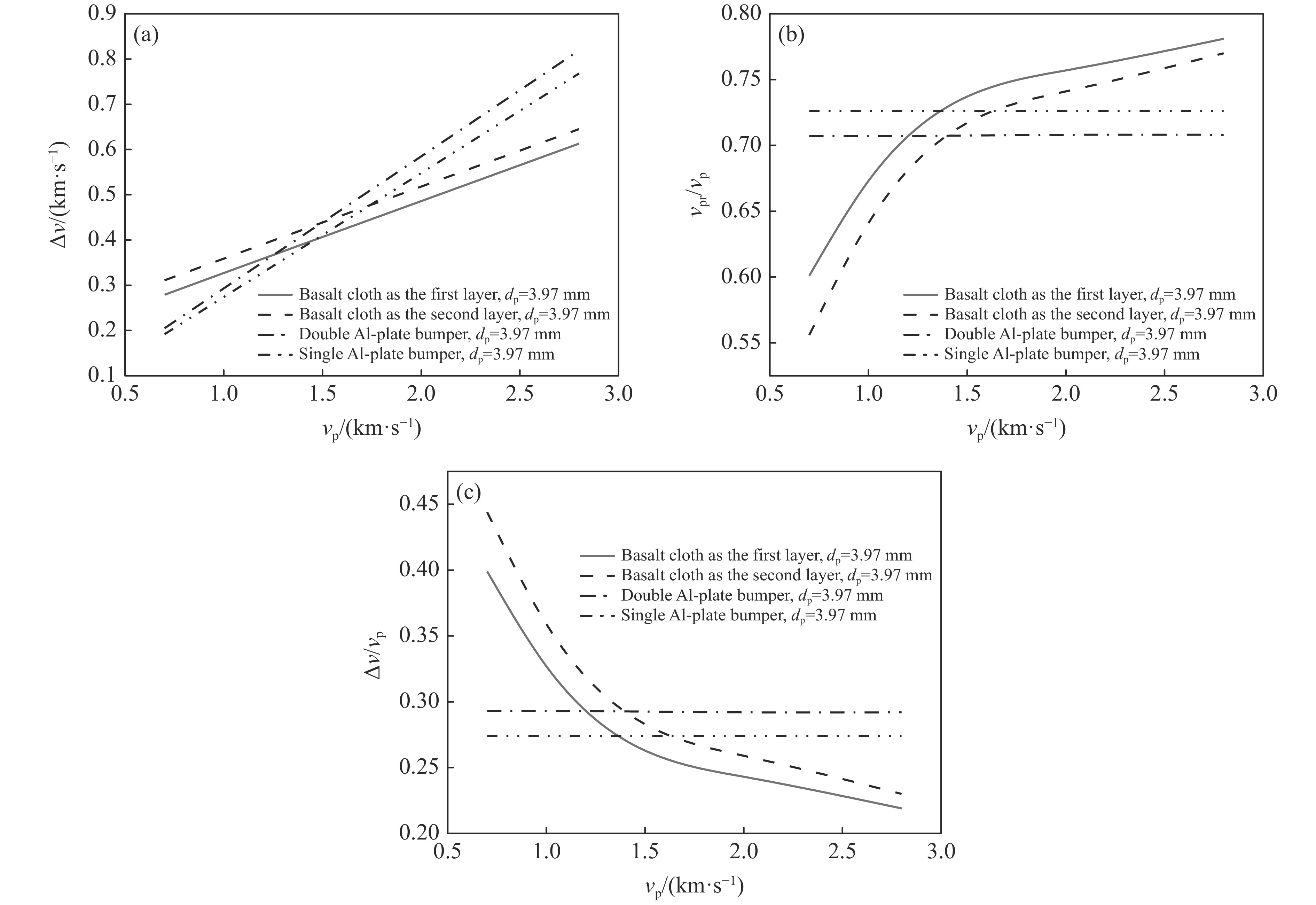 摘要: 在弹道段撞击速度范围内,针对玄武岩纤维布/铝板组合防护结构开展了高速撞击实验(实验使用的2017铝球弹丸的直径为3.97 mm,撞击速度为1.49~3.65 km/s),获得了防护结构的弹道极限速度,分析了铝球弹丸高速击穿玄武岩纤维布和铝板后的剩余速度。基于单层铝板发生穿孔失效时的临界撞击动能,研究了玄武岩纤维布/铝板组合防护结构的高速撞击防护性能。结果表明:当弹丸未破碎时,相同直径的铝球弹丸以不同速度击穿相同面密度的玄武岩纤维布后的速度减小量近似为常数;铝球弹丸直径越大,弹丸击穿相同面密度的玄武岩纤维布后的速度减小量越小;在防护结构面密度相同的情况下,铝板前置的玄武岩纤维布/铝板组合防护结构比玄武岩纤维布前置的组合防护结构具有更好的高速撞击防护性能。Abstract: The high-velocity impact tests were carried out on the basalt fiber cloth/Al-plate composite shields, the ballistic limit velocity was obtained in the range of ballistic impact velocity. The diameter of 2017 Al-sphere projectile was 3.97 mm, and the impact velocity of Al-spheres was varied between 1.49 and 3.65 km/s. The residual velocity of Al-sphere projectile penetrating thin Al-plate and basalt fiber cloth bumper was analyzed. Furthermore, the shielding performance of the basalt fiber cloth/Al-plate composite shields was studied based on the critical impact kinetic energy for the failure of the single Al-plate. The results show that the velocity reduction of the constant diameter projectile penetrating the same basalt fiber cloth bumper at different velocities is a constant when the projectile is not broken. The velocity reduction of the projectile decrease with increasing diameter. For the same areal density, the shielding performance of composite shield with aluminum plate as the first wall is better than that of composite shield with basalt fiber cloth as the first wall.