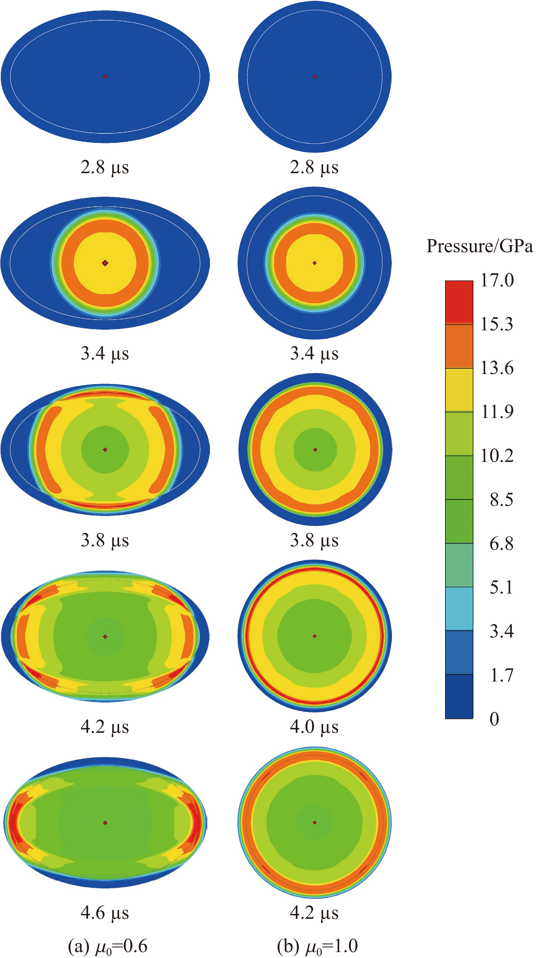 Figure  10.  Cross-sectional shape versus time curves of warheads with different $\,\mu $0