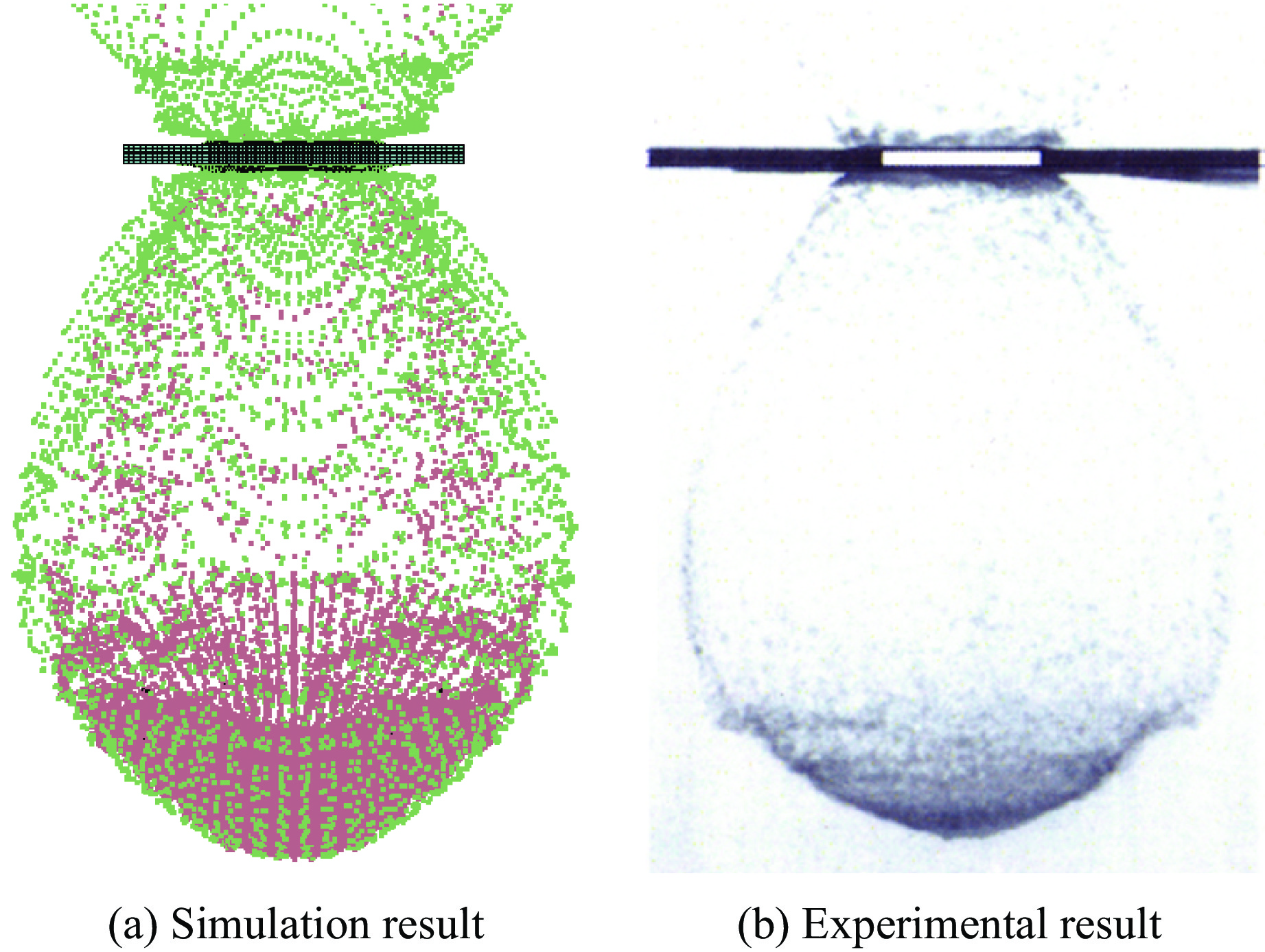 Figure  2.  Comparison between numerical simulation and experimental result[24] of debris cloud at 15.9 µs
