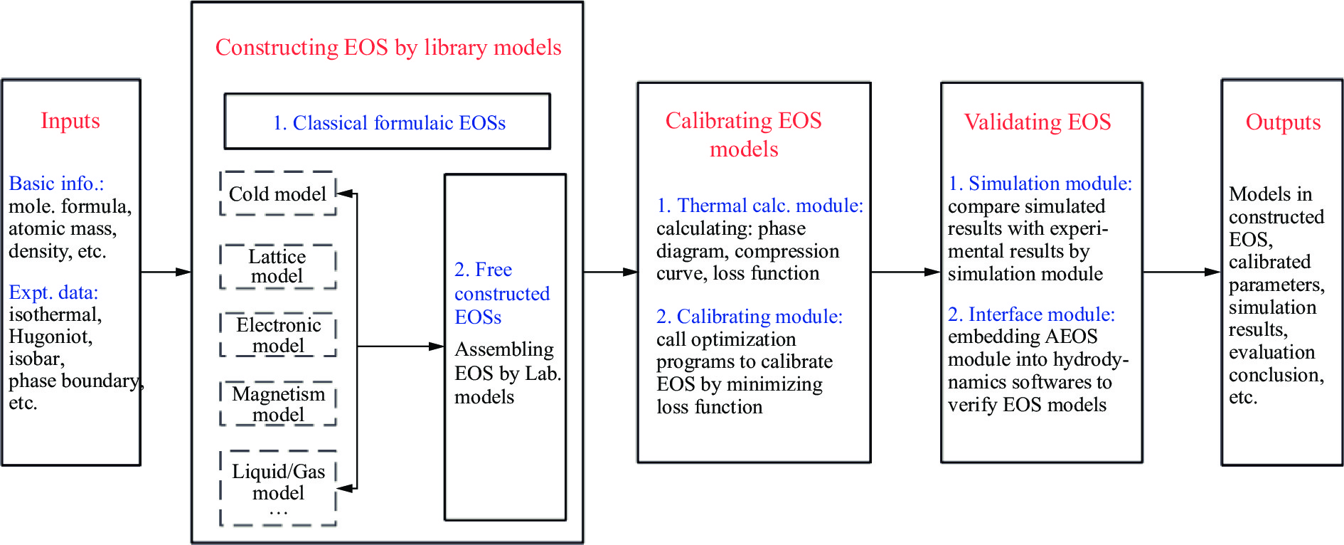 摘要: 状态方程与描述能量、动量、质量守恒的偏微分方程一起,构成了可求解材料动态压缩行为的完备流体力学方程组。动态压缩下,相变会导致材料内能、密度、强度等物理性质的不连续变化,需要构建多相状态方程模型才能精确描述这些变化。通过多相状态方程模型的自动组装,采用计算机智能优化算法自动校准状态方程模型参数,发展了自动化的多相状态方程建模程序AEOS(automated equation of state)。利用AEOS,构建了锡的3套状态方程模型,3套模型的计算结果与相关实验结果基本一致,验证了AEOS程序的适用性。将构建的状态方程模型应用于一维流体力学模拟,发现锡冲击到17 GPa再等熵卸载到常压的压力-温度路径会经过β相-体心四方相-液相三相点,并且可以很好地解释在15.4 GPa的冲击压力下锡的微喷颗粒呈现固-液混合态的实验现象。AEOS的良好表现证明其在大型数字化科研平台以及高通量材料物性计算中将具有广泛的应用前景。Abstract: Equations of state (EOS), combined with the partial differential equations of describing conservations of energy, momentum and mass, form a complete set of fluid dynamics equations on solving dynamic compression behaviors of material. Under dynamic compression, phase transition of material may lead to discontinuous changes of its internal energy, density, strength and other properties, and a multiphase EOS is needed to accurately describe these changes. An automated modeling code of multiphase equations of state (AEOS) is developed, which can construct multiphase EOS model in an automatic way and calibrate parameters of EOS models with a computer intelligent optimization algorithm. By applying AEOS to tin, we obtain three sets of multiphase EOSs. The theoretical results of all the three sets of EOSs are consistent well with the experimental results, which validates the good performance of the AEOS code. And we find that the isentropic release path of tin passes through the three-phase point of the β, the body centered tetragonal (bct), and the liquid phases, when tin is impacted to 17 GPa and then isentropically released to atmospheric pressure. In addition, this result can well explain the experimental phenomenon that tin ejection particles are in a solid-liquid mixture state under the very low impact pressure of 15.4 GPa. The good performance of AEOS insures that it can be widely applied to integrated digital scientific research platforms and scenarios of high-flux material property calculations in the near future.