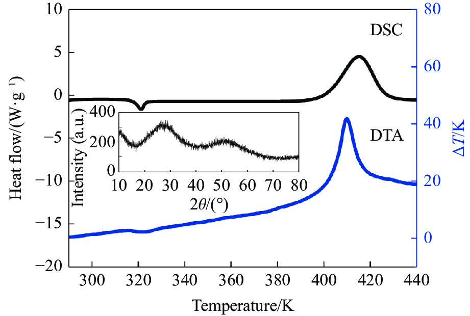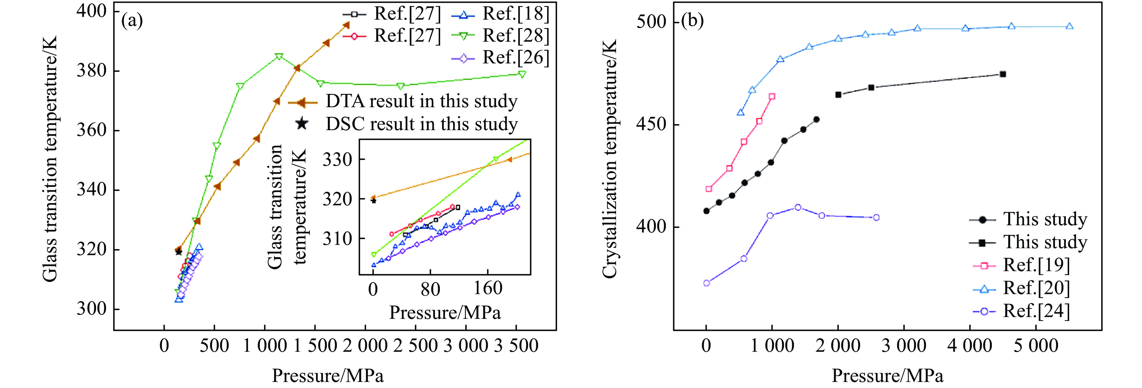 $ {T}_{\text{g}} $ 和晶化温度${T}_{x}$ ,拟合出玻璃化转变中点温度$ {T}_{1/2,\text{g}} $ 与外推起始晶化温度Tel,x随压力p的变化关系:${T}_{1/2,\text{g}}\left(p\right)=$ $322+0.046\,2p$ ,${T}_{\mathrm{e}\mathrm{l},x}\left(p\right)=398+0.030\,2p$ ,其中,$ {T}_{1/2,\text{g}} $ 和Tel,x的单位均为K,p的单位为MPa。$ {T}_{1/2,\text{g}} $ 和Tel,x均随压力的增加而升高。由于Tel,x(p)的斜率小于$ {T}_{1/2,\text{g}} $ (p)的斜率,导致过冷液相区的温度范围随着压力的增加而变窄。在六面顶压机上开展差热分析,测得了2000~4500 MPa压力范围内非晶硒的晶化温度。结合活塞圆筒实验结果,发现了非晶硒的晶化温度随压力的变化规律:在0.1~1700 MPa范围内,晶化温度随压力的增加而升高;在2000 MPa以上,晶化温度的上升速率随压力的增加明显降低。当压力引起非晶硒的微观结构变化时,Tg(p)与Tx(p)曲线的斜率变化发生在相近的压力下,结合实验结果—Tx(p)的斜率变化出现在2 GPa左右,因此,推测Tg(p)的斜率变化可能出现在2 GPa左右。大腔体高压装置实验获得的转变点压力与以往报道的金刚石压砧实验结果不一致,可能与这两类实验中玻璃化转变温度、晶化温度的测量方法不同及压力测量误差有关。Abstract: The effect of pressure on the glass transition temperature and the supercooled liquid region of amorphous selenium (a-Se), which was prepared through melting quenching, was investigated. The glass transition temperature$ {T}_{\text{g}} $ and crystallization temperature Tx were determined through the differential thermal analysis (DTA) during isobaric heating. The experimental results from piston-cylinder apparatus showed that both$ {T}_{\text{g}} $ and Tx increase with the increasing pressure in the pressure range of 0.1-1700 MPa. The glass transition middle temperatures$ {T}_{1/2,\text{g}} $ and extrapolated crystallization onset temperatures Tel,x were linearly fitted to pressure. The fitting results are${T}_{1/2,\text{g}}\left(p\right)=322+0.046\,2p$ and${T}_{\mathrm{e}\mathrm{l},x}\left(p\right)=398+0.030\,2p$ , where the unit of temperature is K, and the unit of pressure is MPa. The smaller slope of Tel,x(p), compared with that of$ {T}_{1/2,\text{g}} $ (p), induces the temperature range (Tel,x−$ {T}_{1/2,\text{g}} $ ) in the supercooled liquid region to be narrower with the increase of pressure. DTA data in the pressure range of 2000−4500 MPa was performed by using a cubic press. A slope change in Tx(p) curve is found. Tx increases with the increasing pressure within 0.1−1700 MPa, and the rate slows down when the pressure is above 2000 MPa. In the previous diamond anvil reports, a similar pressure dependence of Tx and Tg was observed, i.e., Tx and Tg both increase initially with the increasing pressure, and then become nearly constant above 1000 MPa. Since the slope changes in Tg(p) and Tx(p) curves occur nearly at the same pressure when the microstructure of a-Se changes, in view of the pressure of 2000 MPa corresponding to the inflection point of Tx(p) curve obtained in this study, it is speculated that the pressure of the inflection point of Tg(p) curve may be around 2000 MPa. The different pressures corresponding to the slope change obtained by the diamond anvil cell and the large-volume press may be related to the measurement method of Tg and Tx, as well as the pressure measurement error.-