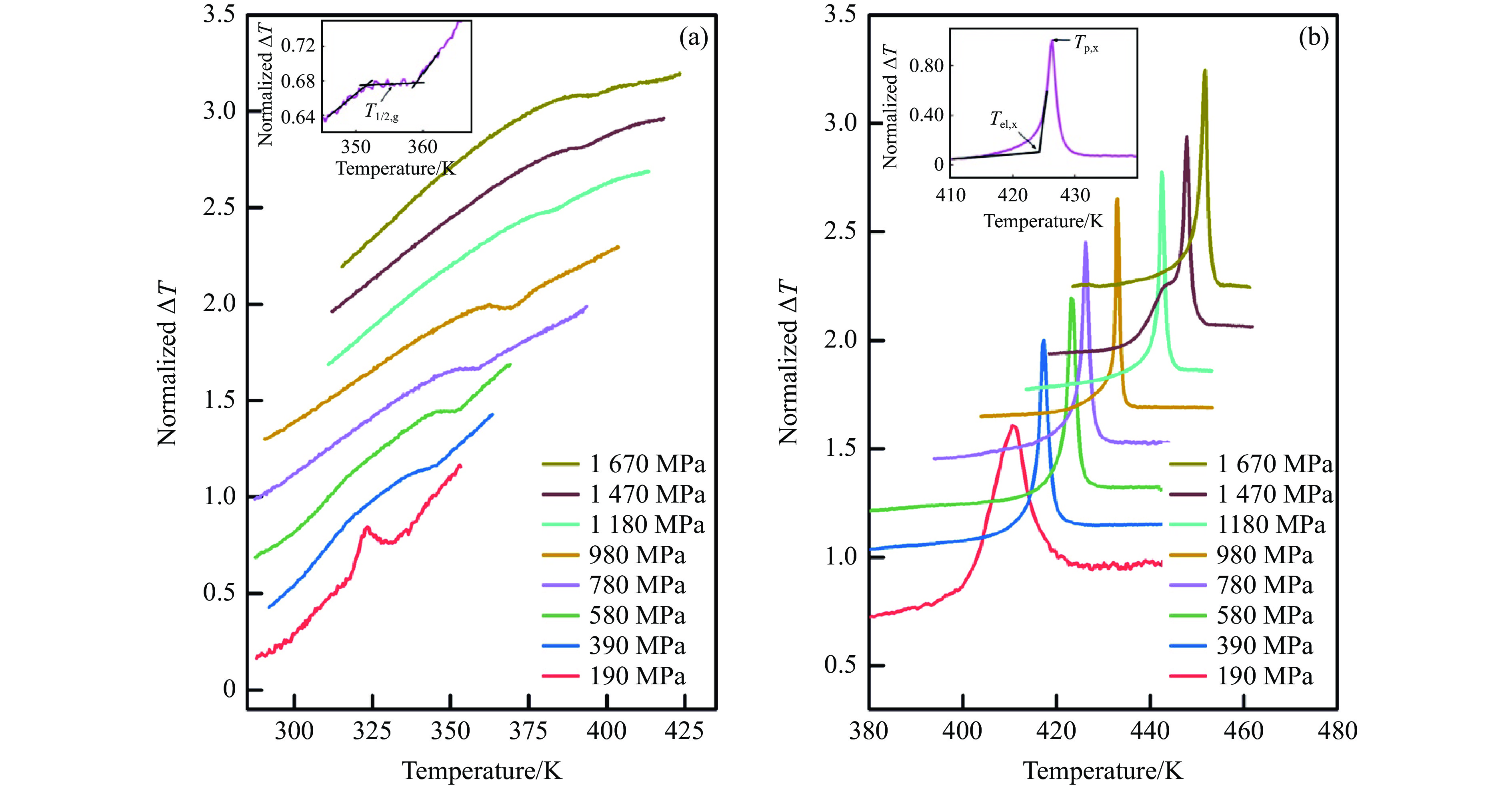图 5 活塞圆筒装置上测得的非晶硒在不同压力下(a)玻璃化转变过程中的DTA曲线和(b)晶化过程中的DTA曲线(内插图给出了T1/2,g, Tel,x 和 Tp,x的选取方法示意图)