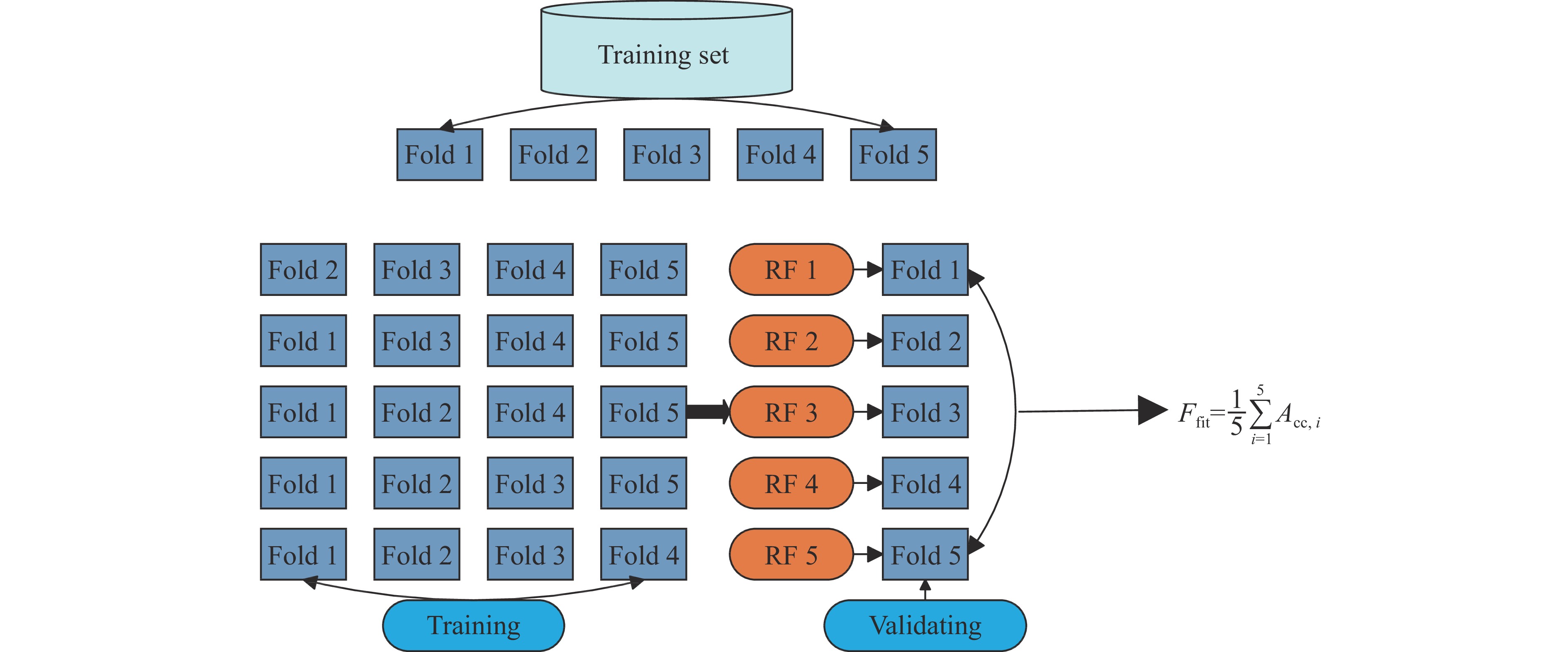 $A_{\mathrm{cc}} $ and$F_{\mathrm{1\text{-}score}}$ before and after optimizationModel Acc F1-score Model Acc F1-score KNN 0.76 0.76 WOA-KNN 0.82 0.82 SVM 0.80 0.80 WOA-SVM 0.85 0.84 ANN 0.53 0.52 WOA-ANN 0.80 0.79 DT 0.71 0.71 WOA-DT 0.75 0.75 RF 0.84 0.84 WOA-RF 0.94 0.94 表 4 各模型优化后分类性能指标及排名