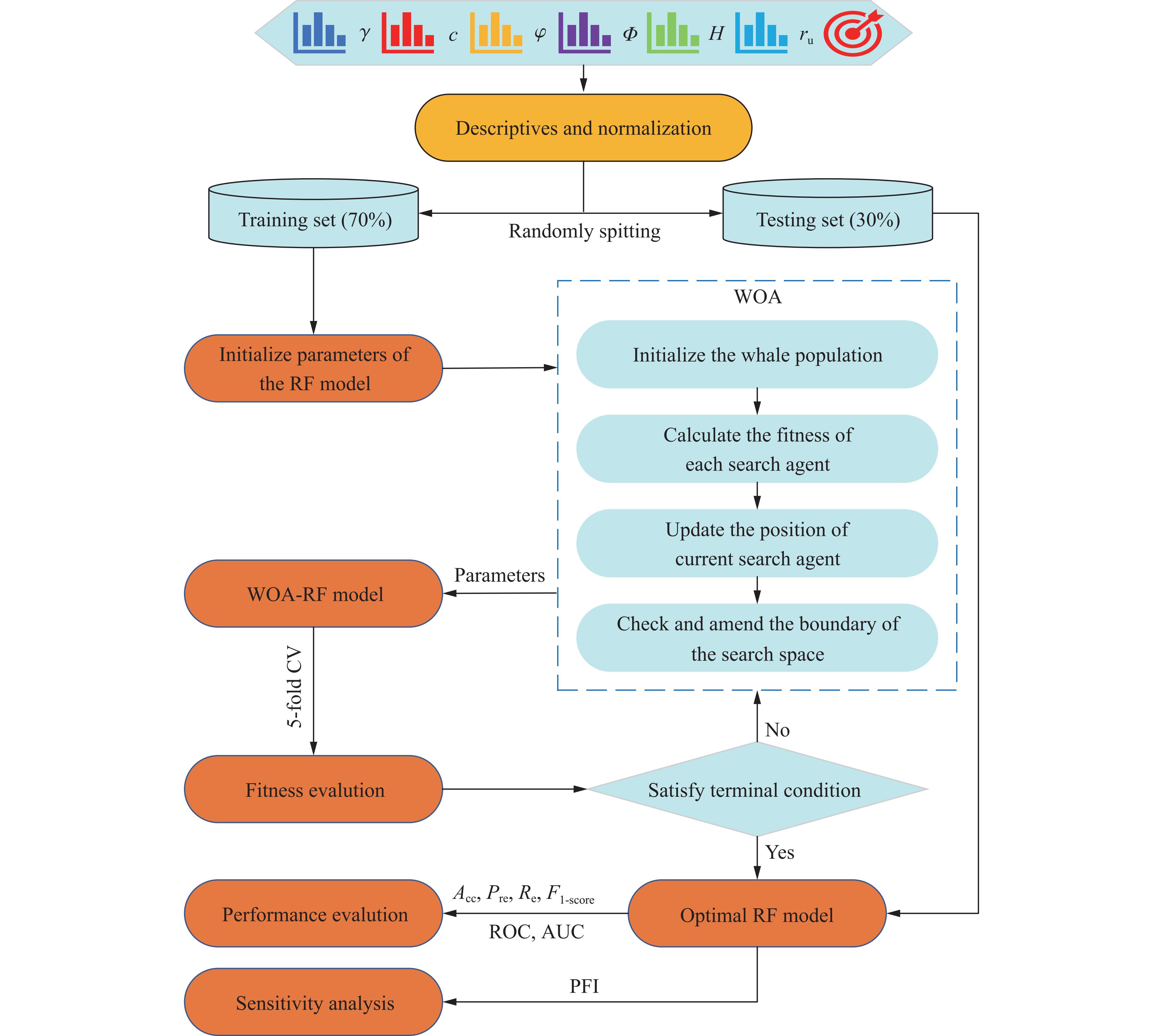 Feature γ/(kN∙m−3) c/kPa ϕ/(°) Φ/(°) H/m ru/kPa S Max 31.30 300.00 45.00 59.00 511.00 0.50 1.0 Min 12.00 0 0 16.00 3.60 0 0 Mean 21.76 34.12 28.73 36.10 104.19 0.22 0.5 Median 20.96 19.96 30.24 35.00 50.00 0.25 Standard deviation 4.15 45.96 10.61 10.25 133.08 0.16 表 2 WOA-RF模型参数设置