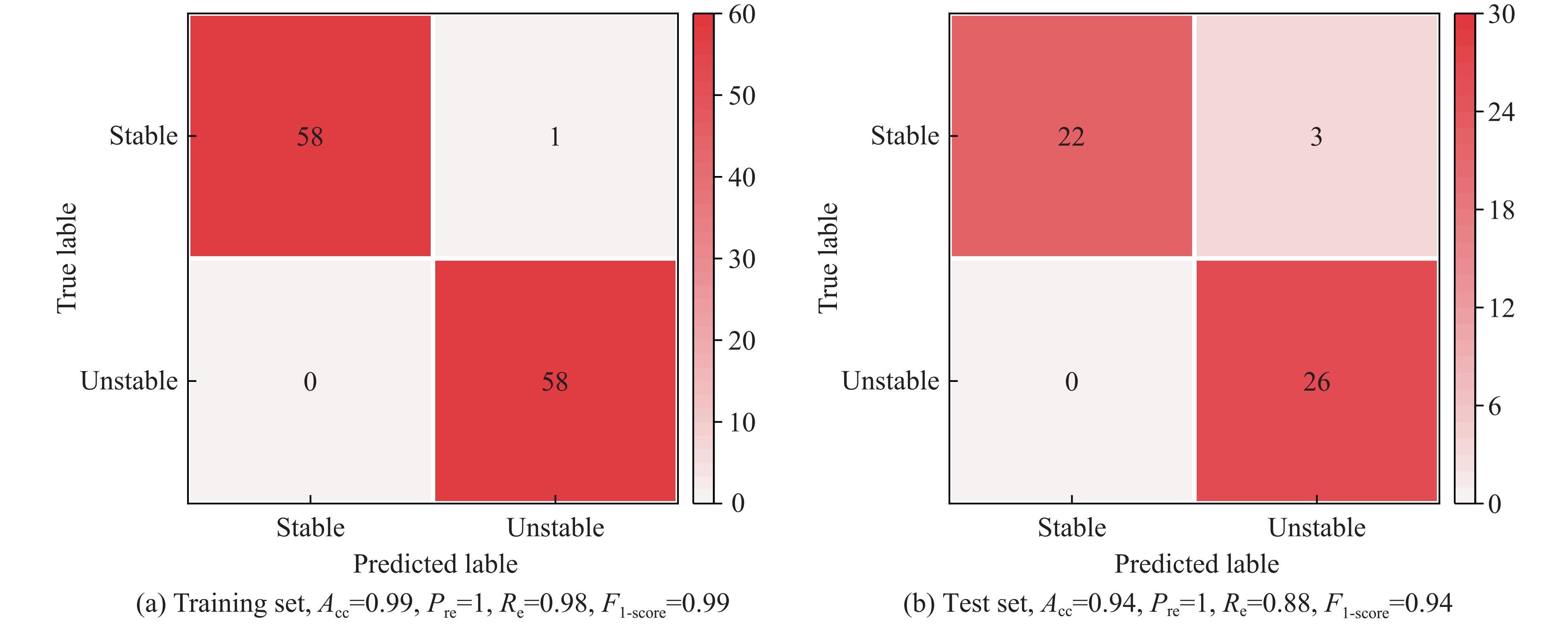 摘要: 为有效地预测边坡稳定性和预防边坡失稳事故的发生,提出了鲸鱼优化算法(whale optimization algorithm,WOA)和随机森林(random forest,RF)相结合的混合模型WOA-RF;基于所收集的边坡案例,采用混淆矩阵的分类性能指标和受试者工作特征曲线及线下面积评估混合模型WOA-RF的分类和泛化性能;使用WOA对4种广泛应用的机器学习模型进行优化,并将优化后的机器学习模型与WOA-RF模型进行对比分析。结果表明:WOA可以有效地优化超参数和提升模型性能;最优WOA-RF模型在训练集和测试集上的准确率分别为0.99和0.94,优化后,准确率、精确率、召回率、精确率和召回率的加权平均值分别提升了11.9%、19.0%、4.8%和11.9%;对比分析各个模型的预测性能后发现,WOA-RF模型的各项指标均优于其他模型;确定了特征重要性排序,发现容重是影响边坡稳定性的最敏感特征。WOA-RF模型可有效地预测边坡稳定性,预测结果可为防护措施的制定提供依据。Abstract: To effectively predict slope stability and prevent slope instability occurrence, a hybrid model WOA-RF, combining whale optimization algorithm (WOA) and random forest (RF) was proposed. Based on the collected slope cases, the classification and generalization performance of the model was evaluated according to the classification performance indicators given by the confusion matrix and the area under the receiver operating characteristic curve. Additionally, WOA was used to optimize four widely used machine learning models, and the optimized machine learning models were compared with WOA-RF. The results demonstrate that WOA is effective in optimizing hyperparameters and improving model performance. The optimal WOA-RF model achieves an accuracy of 0.99 on training set and of 0.94 on test set. After optimization, the accuracy, the precision, the recall, and the hamonic mean of the precision and recall are increased by 11.9%, 19.0%, 4.8%, and 11.9%, respectively. Comparative analysis reveals that the WOA-RF model is superior to the others in all indicators. Furthermore, the feature importance ranking was determined. Analysis of the feature importance indicates that unit weight is the most sensitive feature affecting slope stability. The established WOA-RF model is proved effective in predicting slope stability and facilitating the development of appropriate protective measures based on the predicted results.